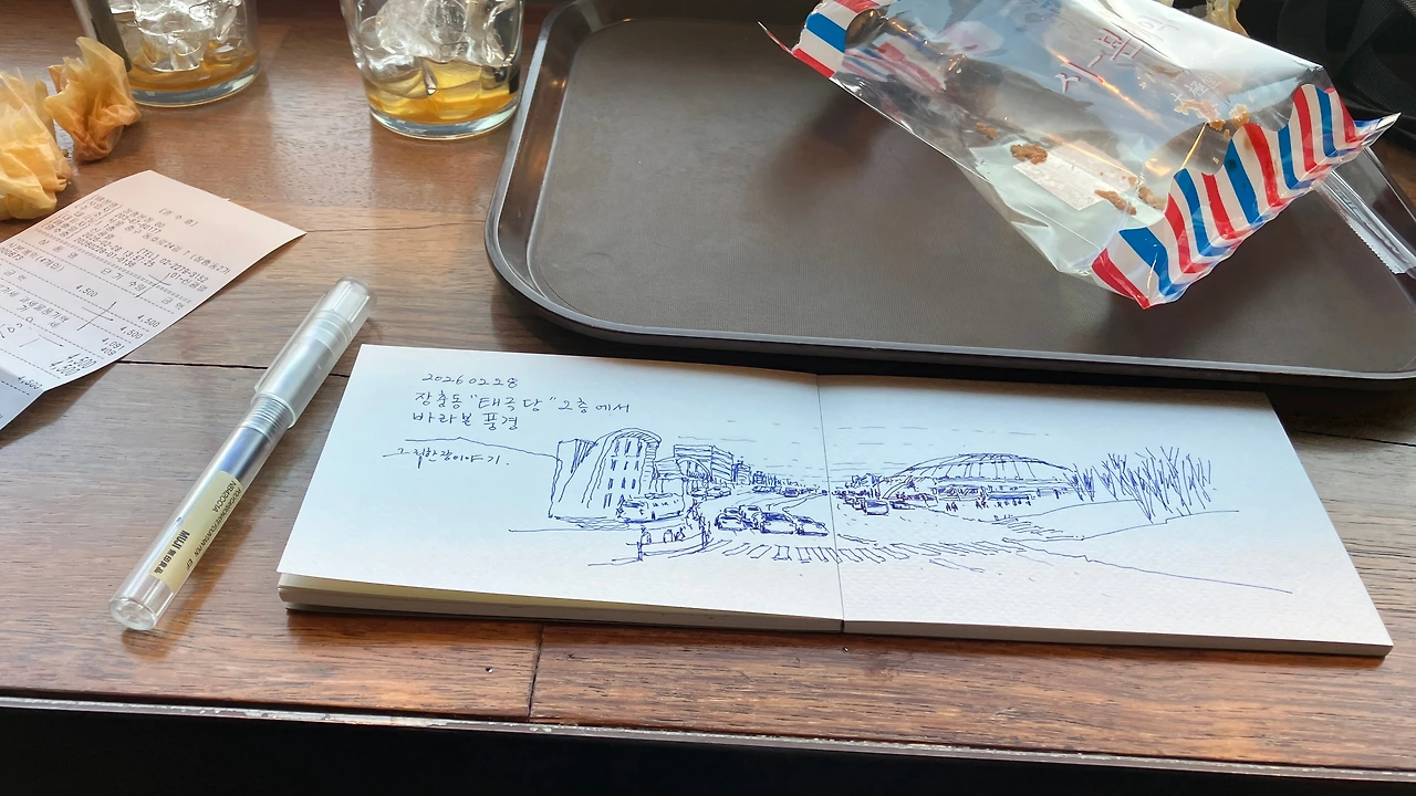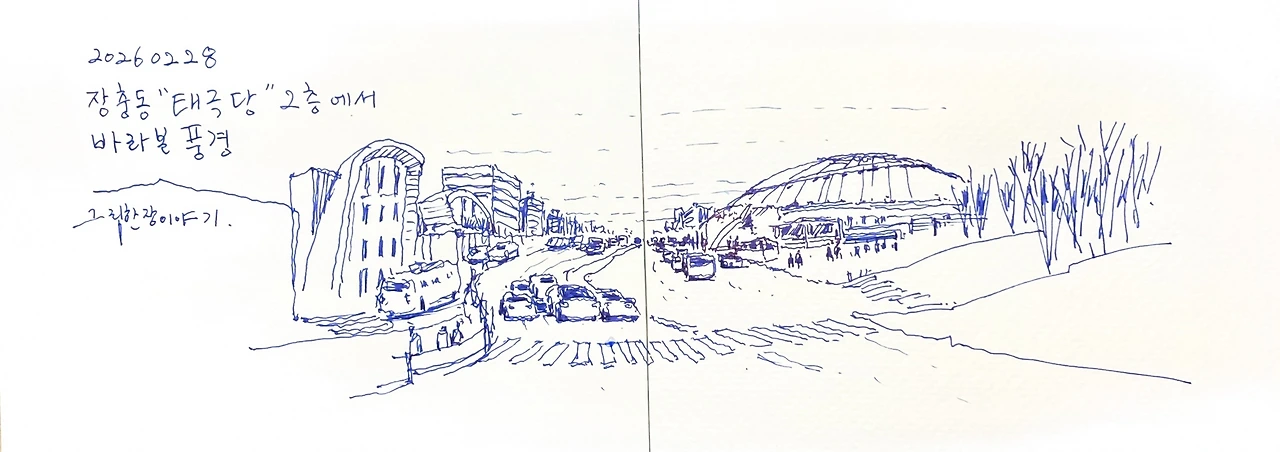 이번 여행은 태극당 2층에서 그림을 그리며 시작합니다. 창 밖으로 보이는 돔지붕이 장충 체육관입니다. 이곳 조명도 옛날식인가요? 촬영한 동영상에 줄이 많이 생기네요. 커피와 빵을 먹으며 레트로 정취에 잠시 빠져봅니다.
