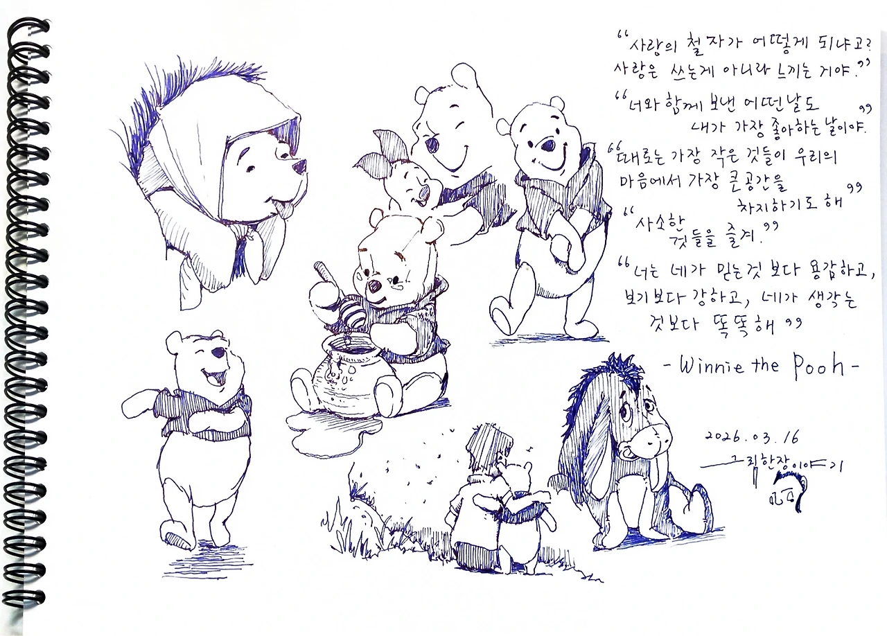 기분이 좋아지는 존재들이 있습니다. "곰돌이 푸"가 저에게는 그런 존재입니다. 디즈니의 캐릭터들 중 저의 가슴을 따뜻하게 만들어 주는 캐릭터들 중 하나입니다. 곰돌이 푸와 그의 친구들이 나누는 대화를 듣는 것 만으로 위안과 행복을 느낍니다.