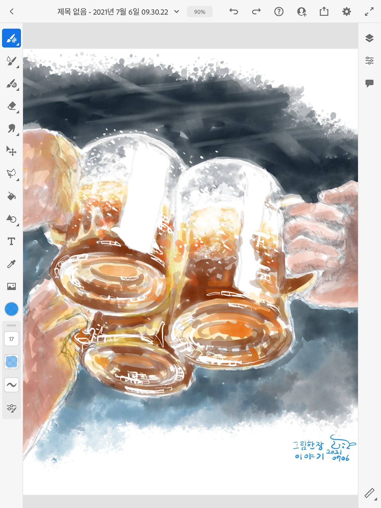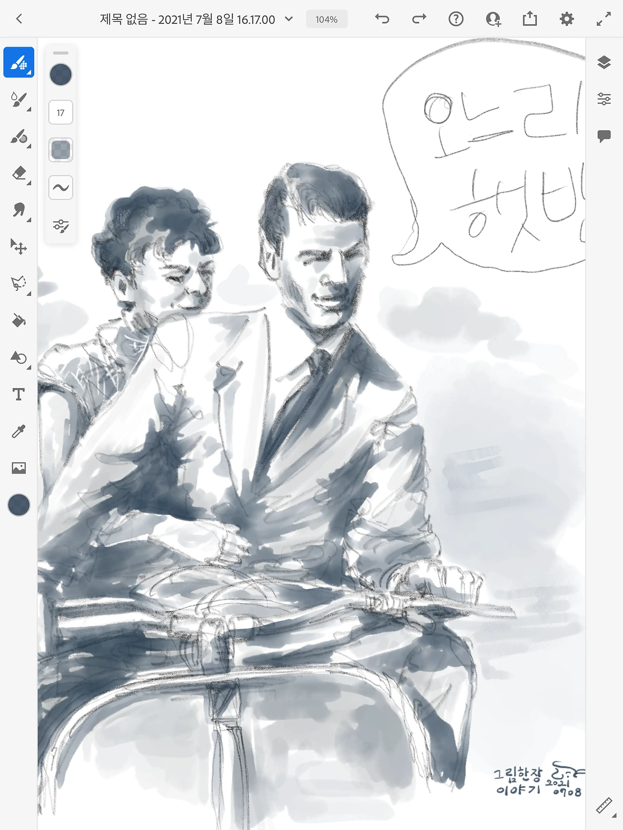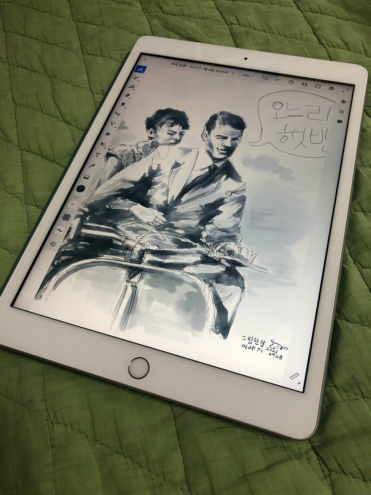 디지털 드로잉은 충전의 노예가 됩니다. 스마트폰의 배터리가 나의 족쇄였는데.. 그림 그리는 것에도 배터리에 대한 불안은 이어집니다. 아이패드에 드로잉을 한다는 것은 배터리를 많이 소비하겠다는 의미입니다. 생각 외로 배터리가 쭉쭉 떨어집니다. 그렇다고 충전선을 연결하고 작업할 정도는 아닙니다. (정말 세밀하고 정성 들여 그린다면 충전의 압박이 더 강할지도 모르겠군요. 저는 좀 대충 그리는 스타일이라서요.)