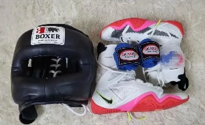 글러브는 라이벌, 헤드기어는 이사미, 복싱화는 나이키로 결정을 했다.