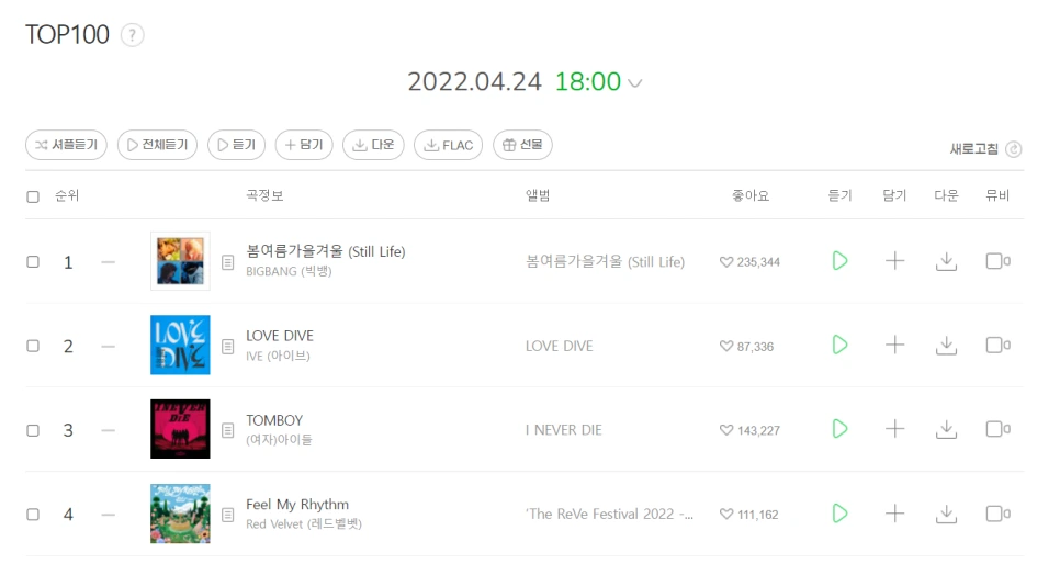 작성 시점에서 가장 황금 시간대의 멜론 차트 현황이다.