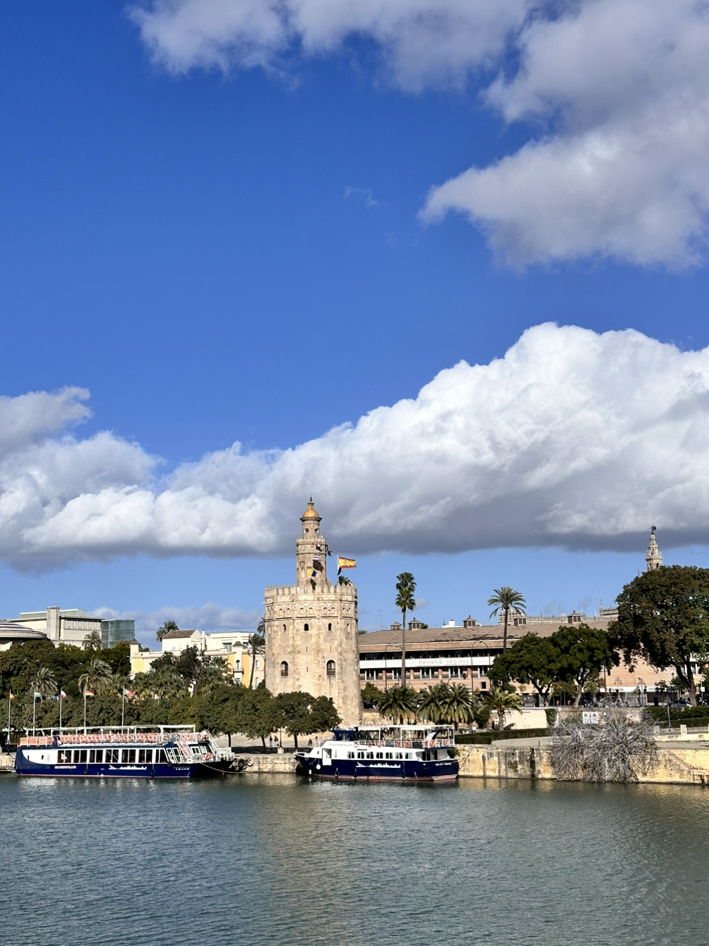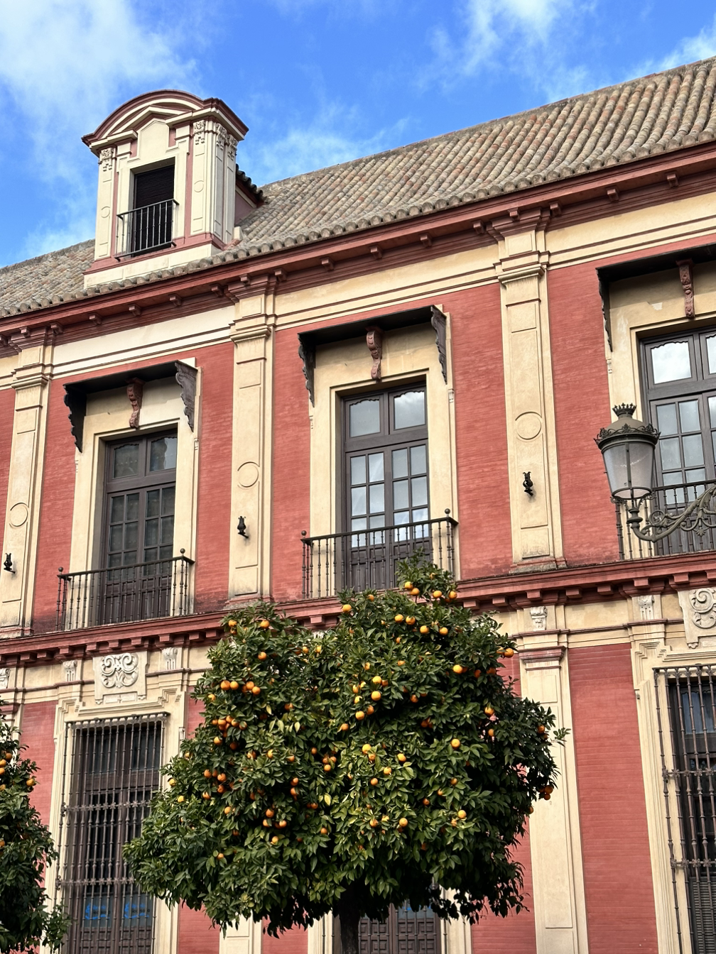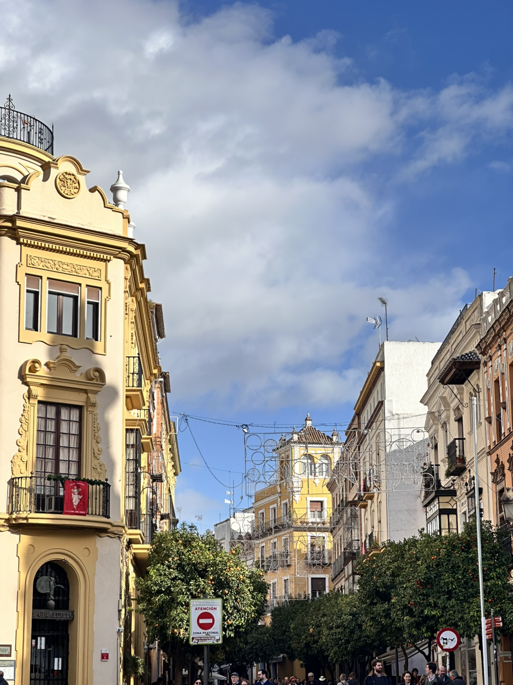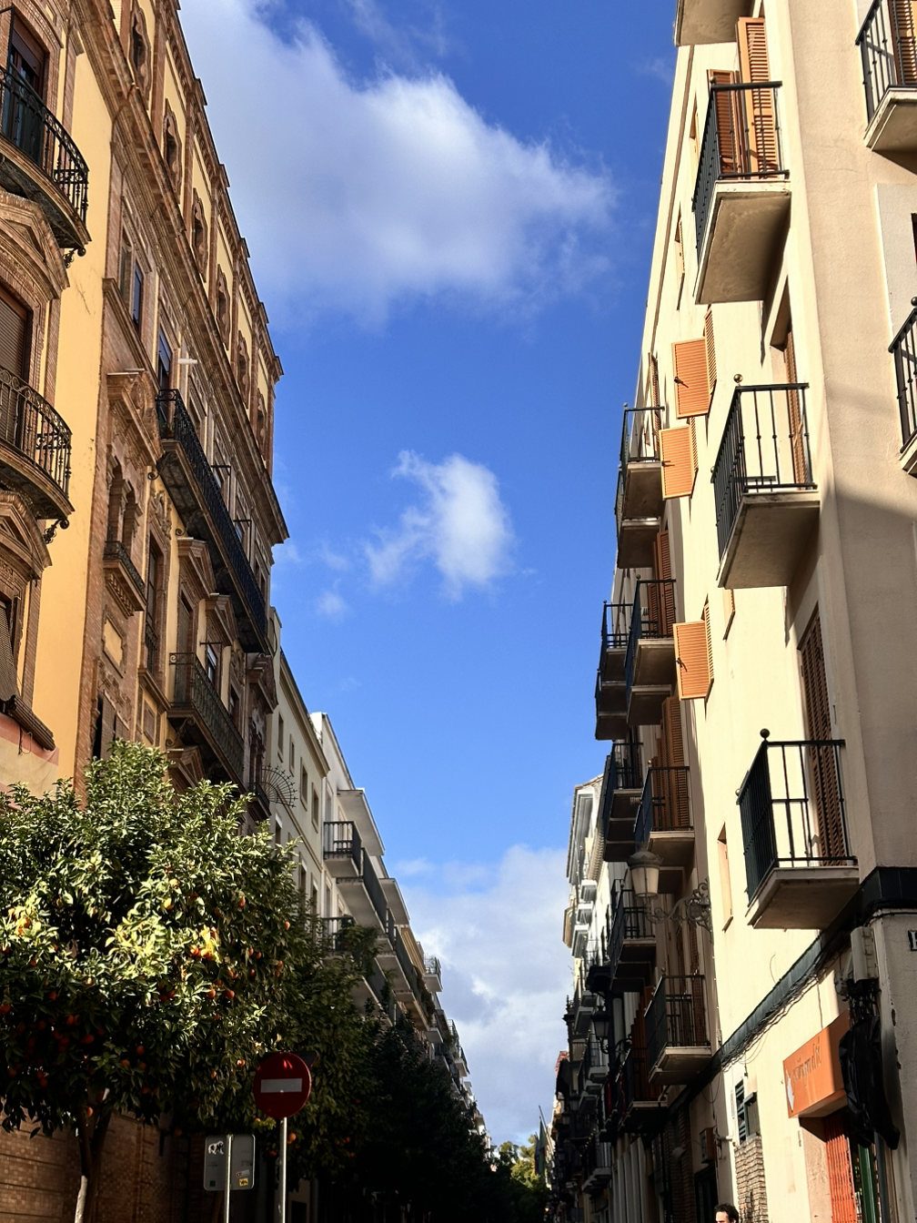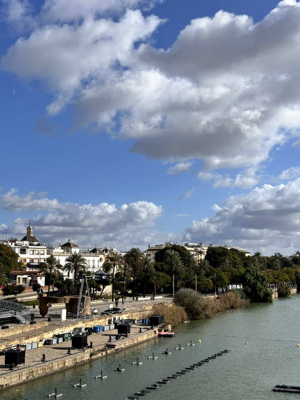 잘 먹고 나와 길을 걷기 시작했다. 건물의 색감이 예뻤는데, 붉은 색감 건물도 있고 색이 다양했는데 화창한 하늘, 푸른 오렌지 나무와 너무 잘 어울렸다. 앞으로 세비야 하면 오렌지가 먼저 생각날 정도로 오렌지 나무도 많고 오렌지가 주렁주렁 매달려 있었는데, 파란 하늘과 초록색 잎, 주황색 오렌지와 알록달록한 건물까지 행복해지는 풍경이었다. 최애 풍경으로 바로 등극했다. 골목을 들어갈 때마다. 눈을 돌릴 때마다 아름다운 풍경이 펼쳐져 황홀할 정도였다. 걷다 보니 다리도 나타났는데 강렬한 햇살 아래라서 물에 윤슬이 아름답게 반짝였는데, 이런 풍경이라면 평생 보고 싶을 정도로 매 순간이 아름답고 행복했다.