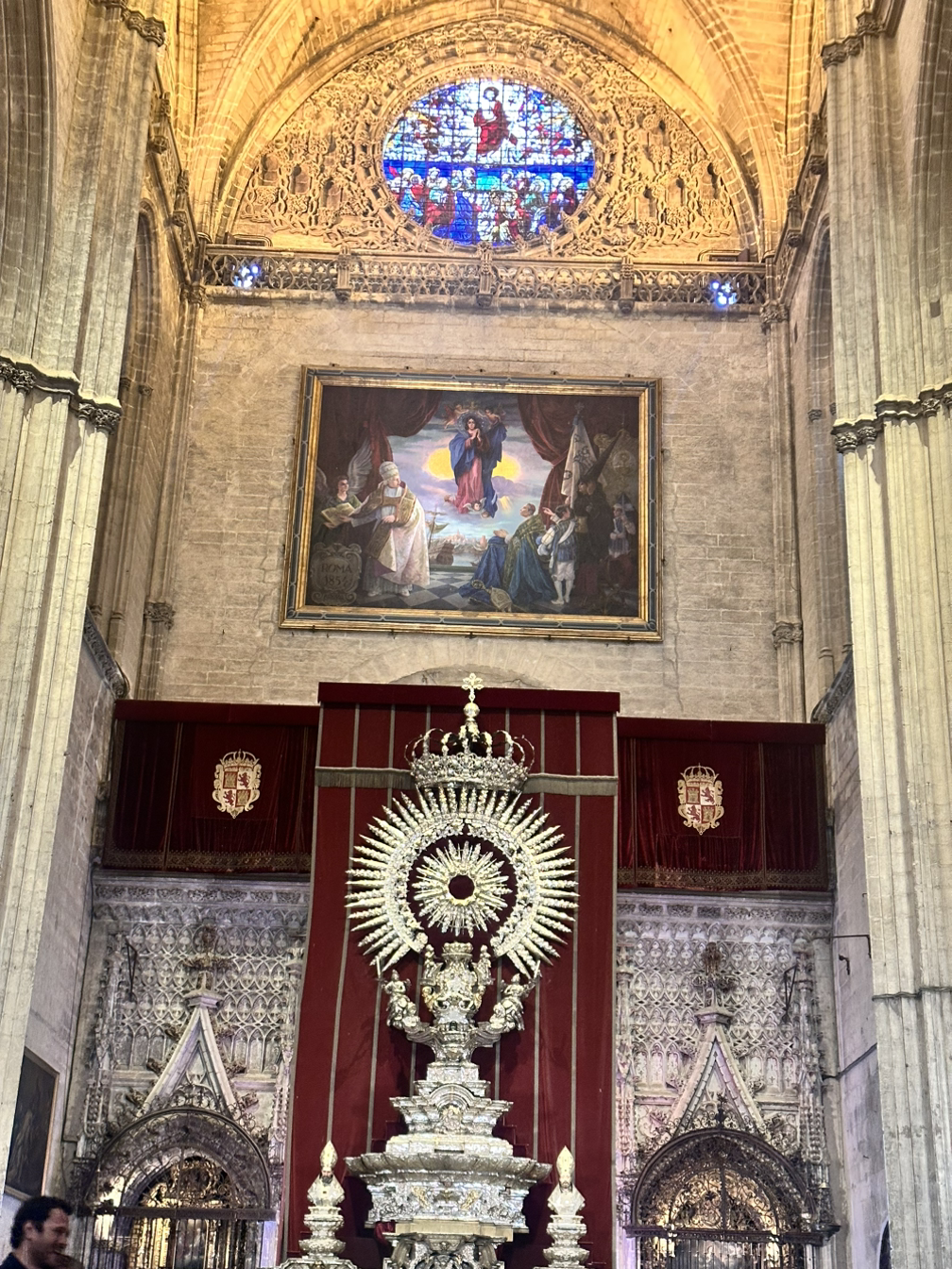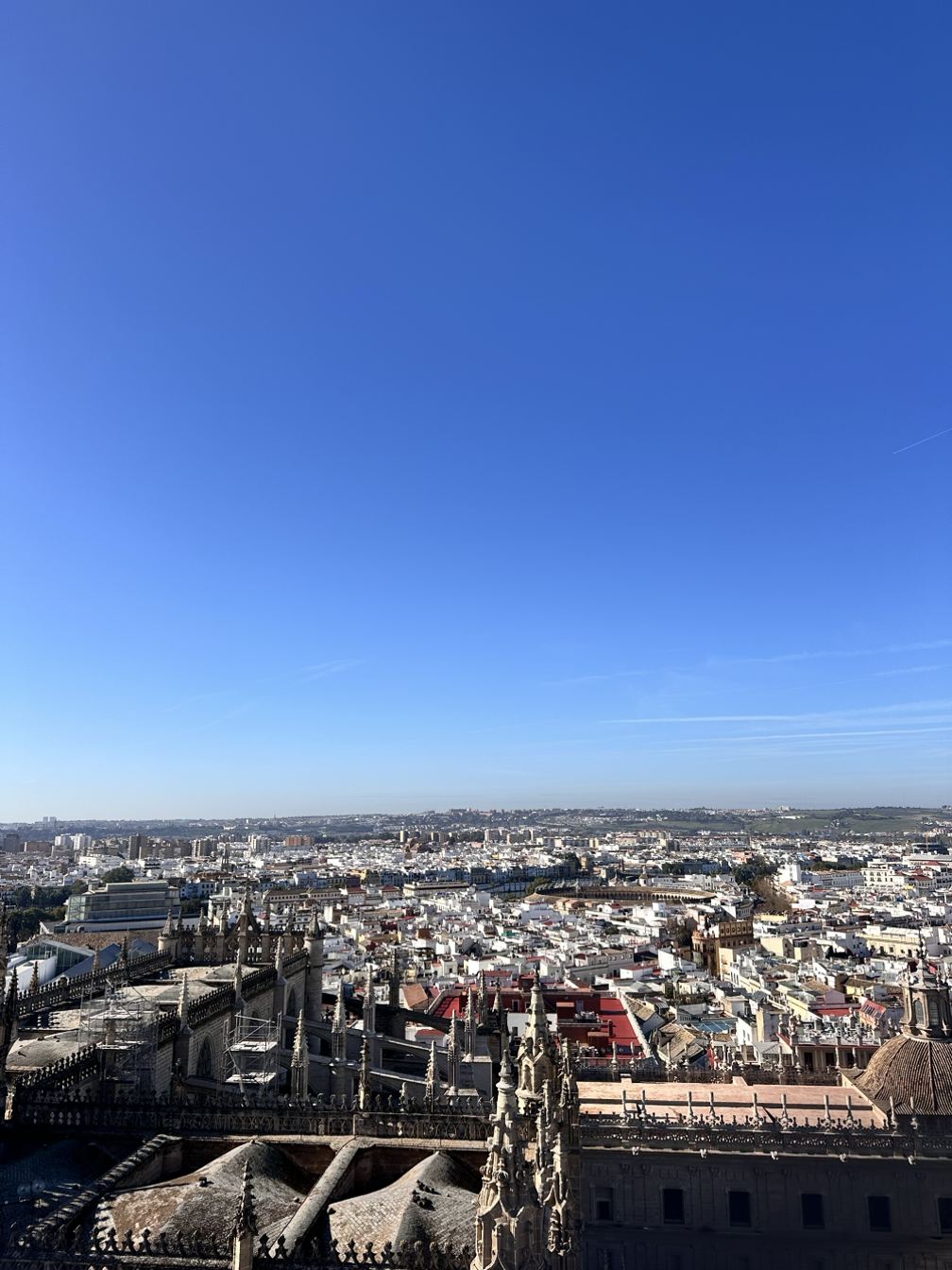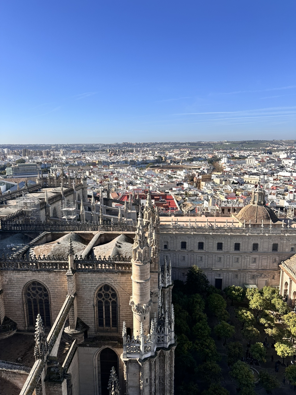 세비야 대성당은 규모도 크고 높이도 상당히 높았다. 우리는 입장하자마자 히랄다 탑부터 올라갔다. 꽤나 높이 올라가야 했지만, 무념무상하게 올라가니 생각보다 금방 정상에 도착했다. 세비야 시내가 한눈에 들어오는 전망대였는데, 빼곡한데 다채로운 건물들이 눈에 들어와서 예뻤다. 철조망이 많고 촘촘해 사진을 찍기는 어려웠지만 이틀 동안 세비야를 열심히 돌아다녔기 때문에 조금씩 추억하며 구경하기 좋았다. 4개 방면이 있어 구경을 마치고는 다시 성당으로 내려왔다. 중앙에 가장 대표적인 장식이 있었는데, 엄마가 오디오 가이드를 들으시는 동안 나는 아빠랑 그 앞에 의자에 앉아서 잠깐 쉬었다. 앉아있는 동안 주변에서 이런저런 투어 단체에서 와서 설명을 했는데, 우리 근처에서 하셔서 조금 들을 수 있었다. 확실히 가만히 앉아서 보는 것보다 내용을 알고 보니 더 신기하고 재밌었다. 여기는 콜럼버스의 무덤이 있는 성당으로도 유명한데, 역사책에서만 보던 콜럼버스의 무덤을 실제로 보니 신기했다. 가운데 있는 정원에는 오렌지 나무가 가득했는데, 푸른 하늘에 초록색 잎과 주황색 오렌지라니 정말 힐링되는 풍경이었다.
