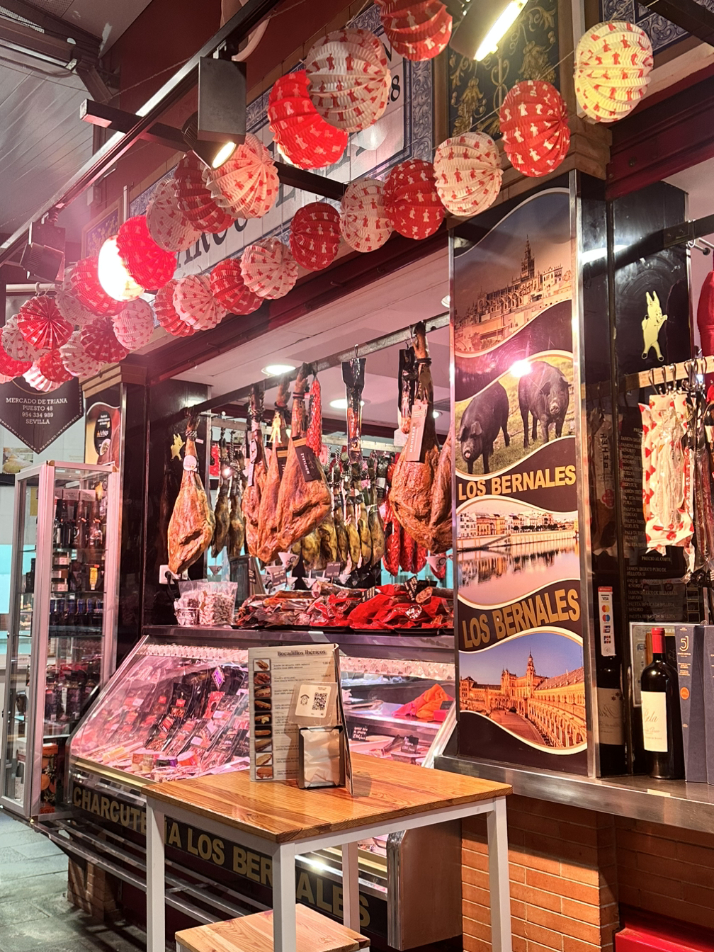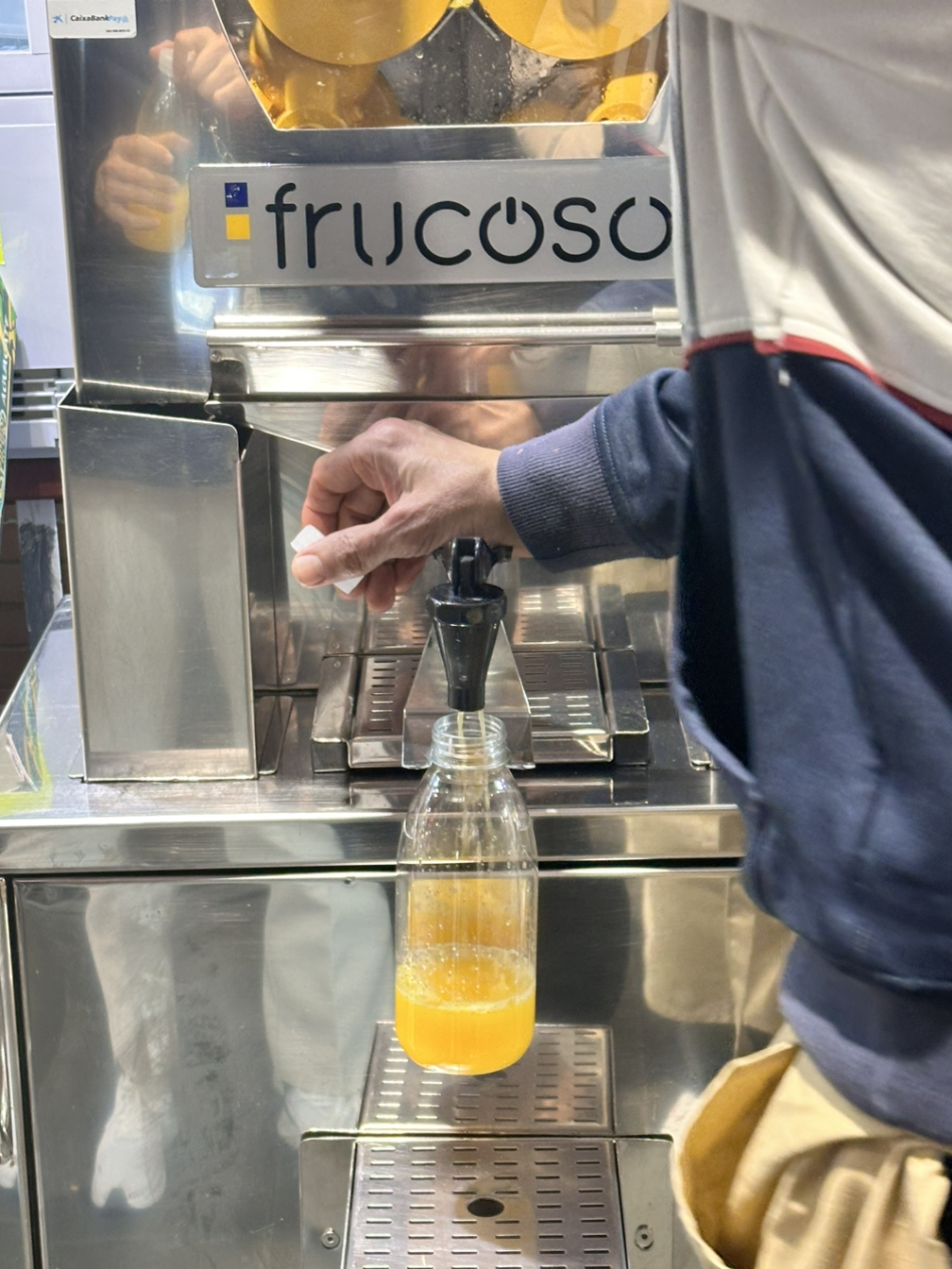 오늘은 대망의 여행 100일 차였다. 오늘도 아침에 일어나 호다닥 준비를 마치고 첫 일정인 트리아나 시장으로 향했다. 트리아나 시장이 9시에 연다고 해서 여유롭게 9시 반에 도착했다. 신선한 과일이나 간단한 음식이 있을 것으로 기대하고 갔는데, 연 가게가 많이 없었다. 한 바퀴 구경을 하고 착즙 오렌지 주스와 하몽 샌드위치 그리고 츄러스를 주문했다. 시장인데도 관광지라 그런가 물가가 비쌌다. 츄러스부터 한 입 먹어봤는데, 어제 먹은 츄러스보다 가늘고 짭짤한 맛이 강했다. 초콜릿도 묽어서 조금은 실망스러웠다. 하몽 샌드위치는 정직하게 빵과 하몽만 들어있었는데, 맛있고 향과 식감이 매력적인 하몽을 빵이 조금 가리는 것 같아 아쉬웠다. 착즙 주스는 전에 마트에서 산 것보다 맛있어서 한 병을 나눠마시고 한 병을 더 사갔다.