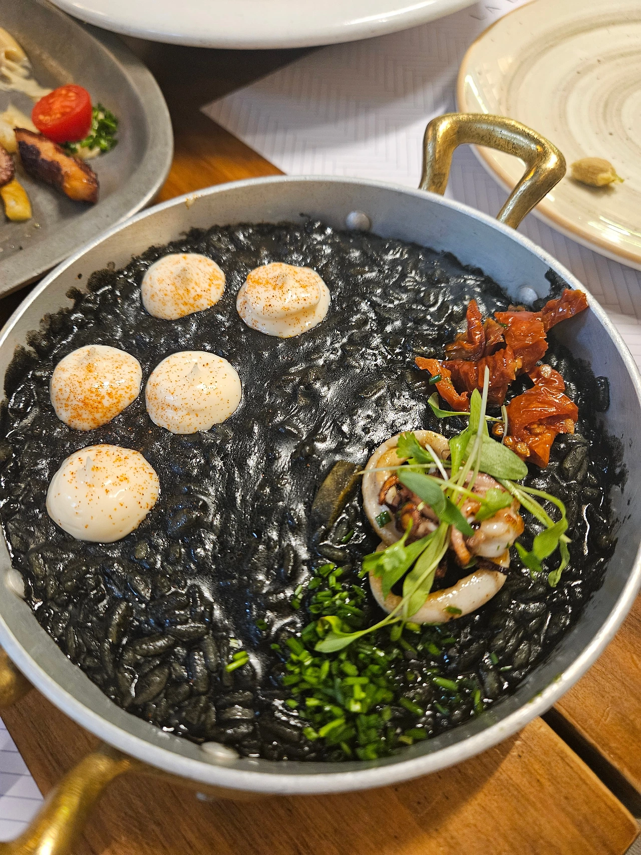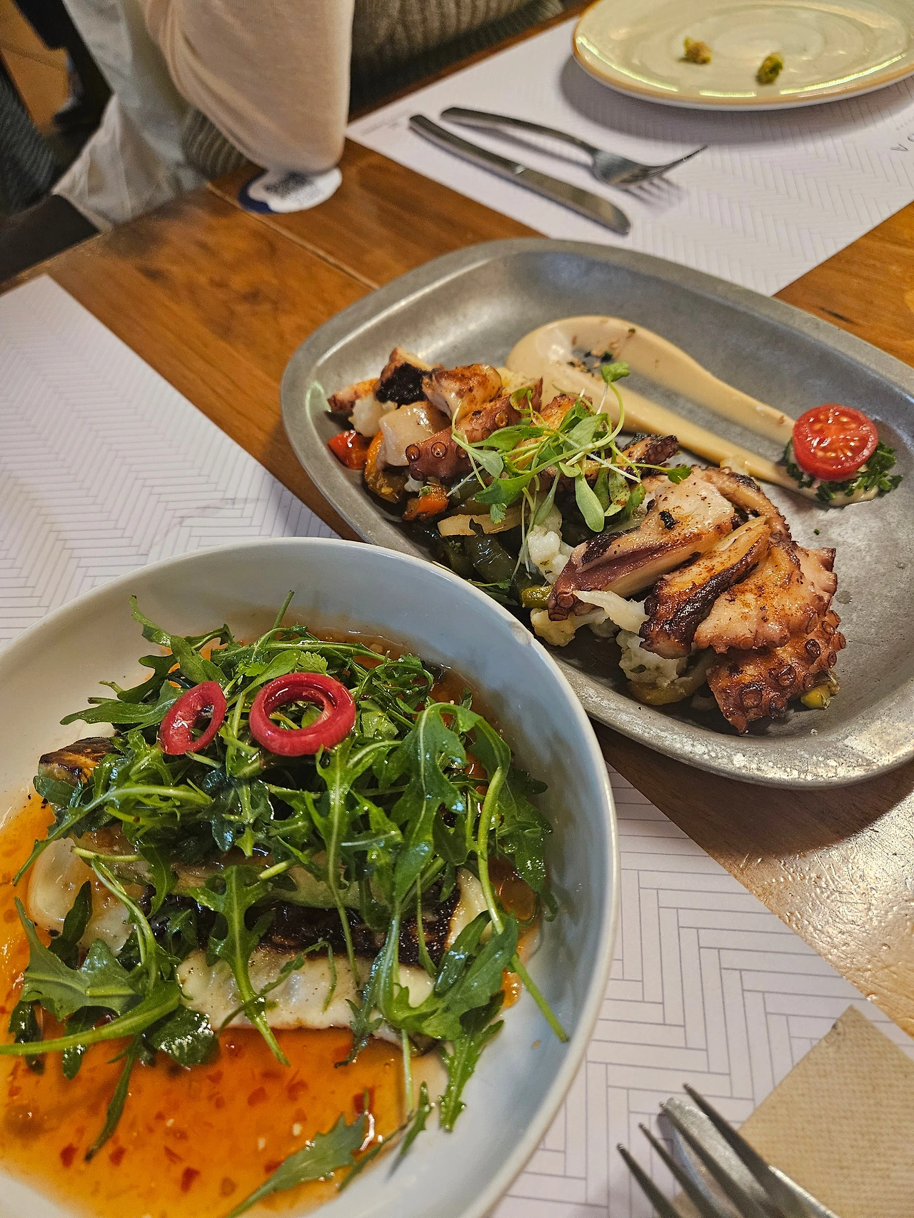 마지막 성당까지 구경을 마치고 우리는 늦은 점심을 먹으러 갔다. 오늘도 타파스 바로 향했는데, 가는 길이 10분 정도 걸려서 메뉴를 열심히 고민하며 갔다. 치열한 고민의 결과는 오리 콩피와 뽈뽀, 오징어 먹물 빠에야와 치즈 요리였다. 곁들여 마실 시원한 맥주 2잔도 주문했다. 치즈 요리가 먼저 나왔다. 구운 치즈 위에 살짝 구운 아보카도가 올라가고, 그 위에는 루꼴라, 옆으로는 스위트 칠리소스가 뿌려져 있었다. 네 재료가 심플하면서도 잘 어울려서 맛있었다. 다음으로는 오리 콩피가 나왔다. 오리 콩피는 처음 먹어보는데, 당근 퓌레랑 미지의 소스랑 오리 콩피가 정말 맛있었다. 당근을 그렇게 좋아하지는 않지만 이 당근 퓌레는 정말 맛있고 고기랑도 잘 어울렸다. 뽈뽀는 어제보다 양도 많고 소스도 맛있었다. 마지막 빠에야도 먹물 맛이 진하고 부드러우면서도 풍미가 느껴져 맛있었다.