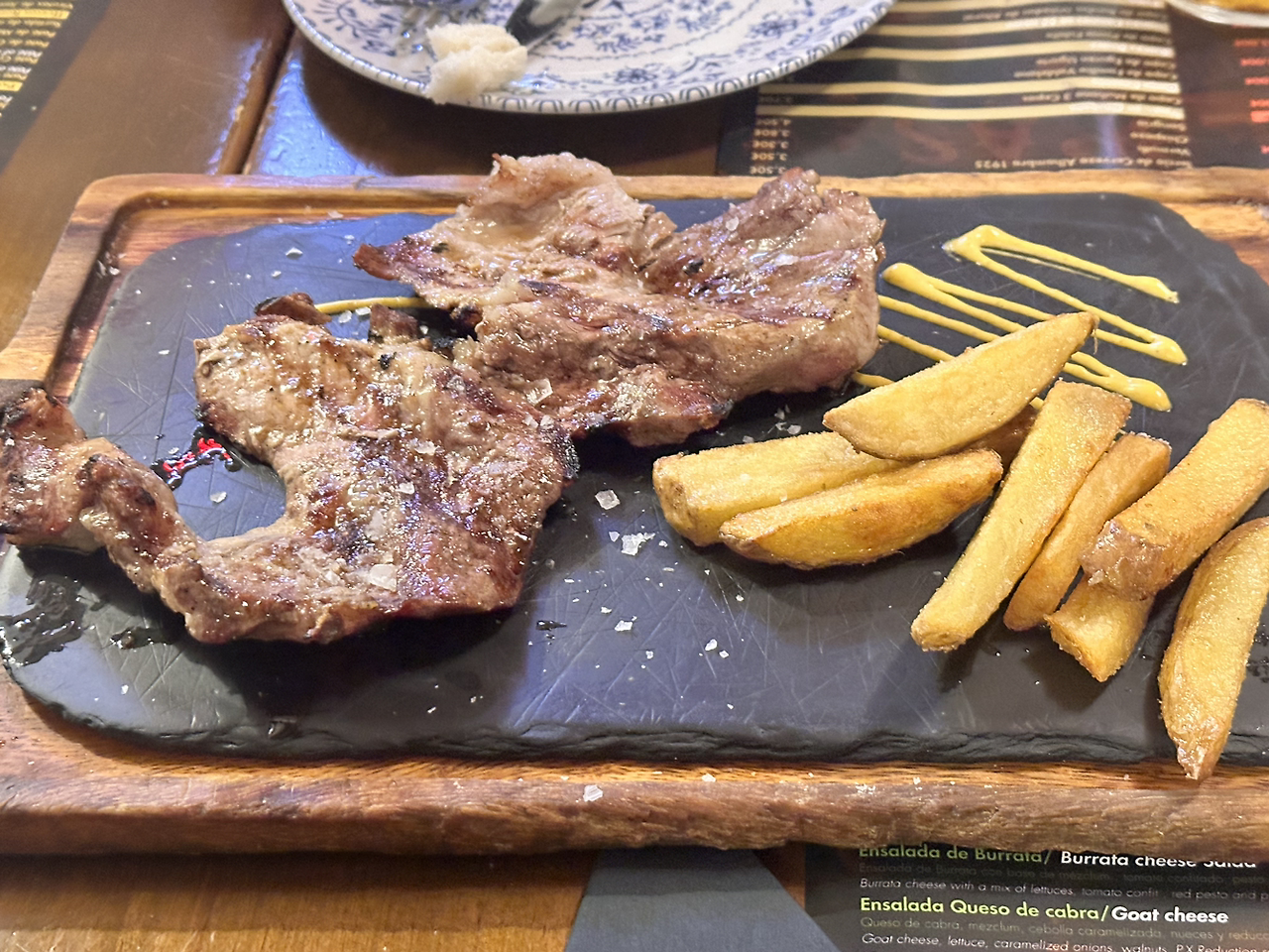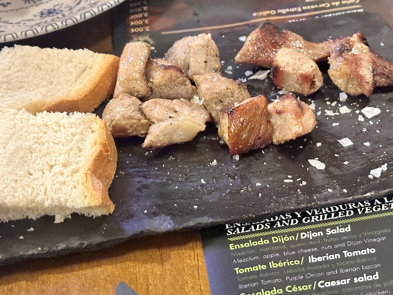 오늘의 마지막 코스는 타파스 투어! 투어라고 하기에는 2개만 가지만, 스페인의 마지막 밤인 만큼 타파스를 즐기고 가려고 타파스 바로 향했다. 첫 타파스 바에서는 맥주 1잔과 와인 3잔을 주문했다. 스테이크가 메인인 집이라 이베리코 스테이크도 같이 주문했다. 처음에는 타파스로 고기가 조각조각 나왔는데, 이 고기부터 맛있어서 이베리코가 기대가 되기 시작했다. 대망의 이베리코가 나와 한 입 먹어보니 감동 그 자체였다. 돼지고기인데도 촉촉하고 부드럽고 풍미 가득해서 인생 돼지고기였다. 와인도 맛있었는데, 어제 과음을 해서 오늘은 절제했다.