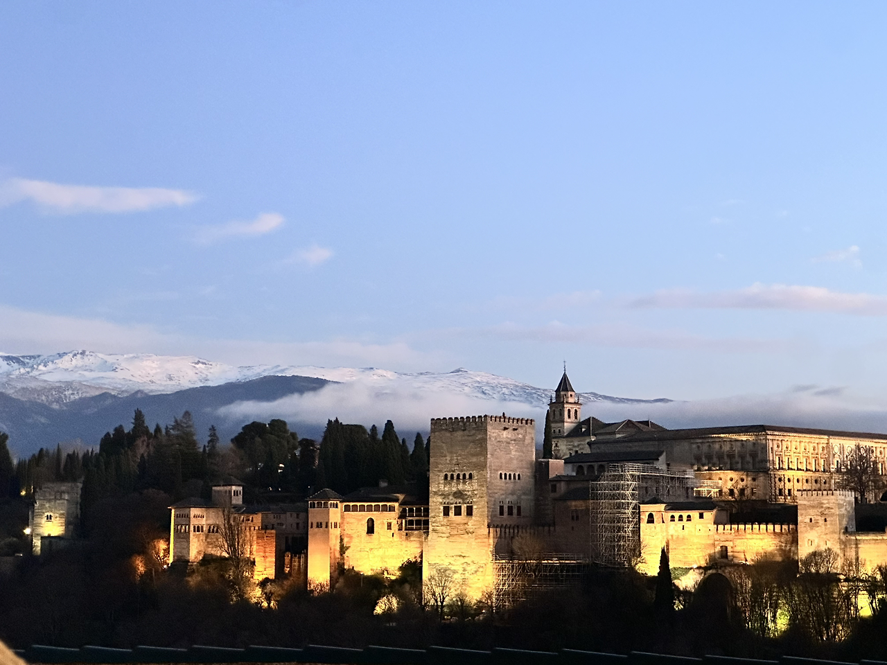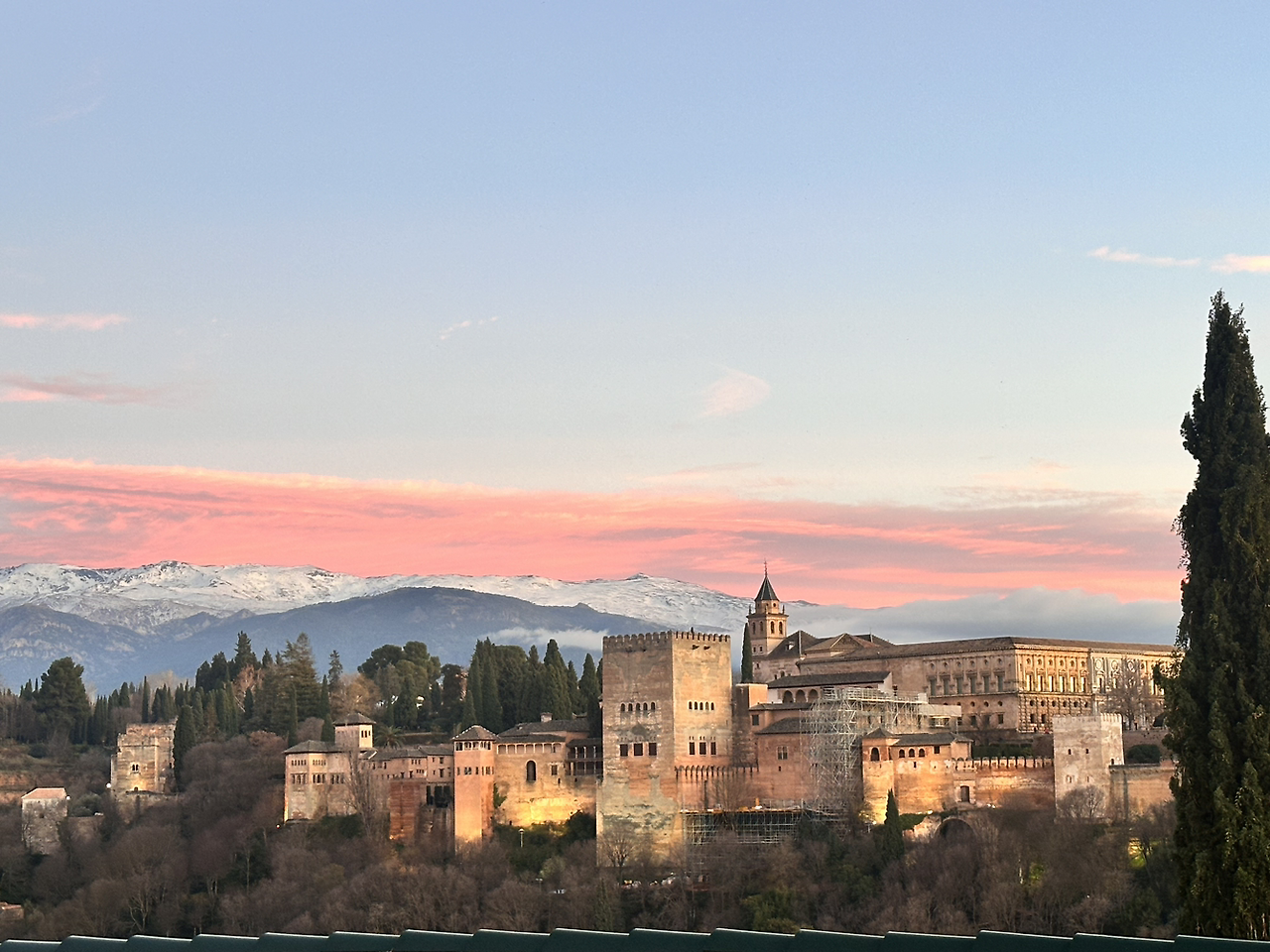 백화점을 구경하려 했지만 사고 싶은 게 없어 지하 식품관으로 갔다. 맥주 여러 개와 와인을 사서 집으로 돌아왔다. 오는 길에 IIaoIIao에 들러 요거트 아이스크림도 디저트로 먹고 돌아왔다. 그라나다에서 하고 싶은 걸 다 했고, 또 할게 크게 없어서 뭐 할까 고민하면서 잠깐 쉬었다. 알함브라가 메인인 도시라서 이미 봤고, 성당도 끌리지 않아 잠깐 쉬다가 성 니콜라스 전망대로 향했다. 갈 때는 걸어 올라갔는데, 생각보다 언덕이었다. 그렇게 16분 정도 걸어 전망대에 도착했더니 어제의 전망대와는 다르게 사람으로 바글바글했다. 우리도 사진을 남기고 전망대 풍경도 감상했는데, 사람이 너무 많아 앞에 있던 카페로 들어갔다. 별생각 없이 들어간 카페였는데, 통유리로 알함브라 뷰가 펼쳐졌다. 커피와 맥주를 마시며 잠깐 기다리니 알함브라의 노을과 야경이 펼쳐졌다. 바로 앞에서 보는 알함브라의 노을은 오래오래 기억에 남을 것 같다. 설산이 먼저 핑크빛으로 뒤덮이고, 구름이 분홍색이 되는 풍경을 보고 있으니 알함브라의 신비로운 분위기와도 잘 어울리고 환상 같았다. 여유와 행복으로 가득한 시간이었다.