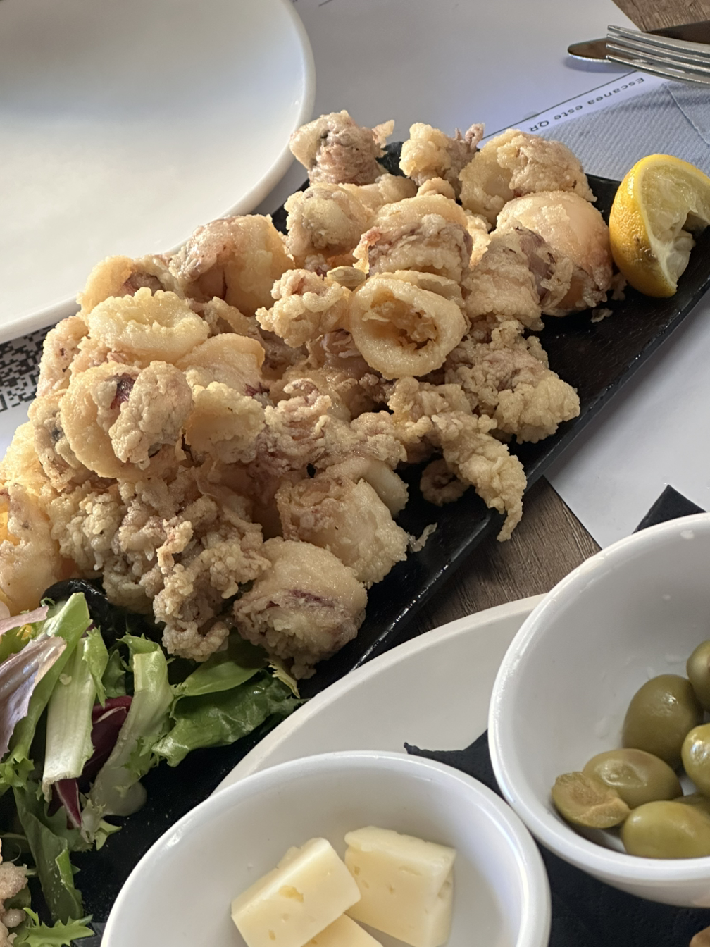 아침을 먹고 알함브라 관광을 4시간 반 정도 한 우리는 배가 고파져 시내에 있는 식당으로 향했다. 특이하게 면으로 된 빠에야와 칼라마리, 그리고 대구 요리를 주문했다. 깔라마리부터 나왔는데 겉은 바삭하고 적당히 짭짤하고 속은 부드럽고 촉촉해서 스페인에서 먹은 깔라마리 중 가장 맛있었다. 다음으로는 면으로 된 빠ᆞ에야가 나왔다. 면의 식감에 대한 호불호가 조금 갈려 걱정했는데, 천상의 맛이었다. 면은 얇고 짧은 특이한 면이었는데 짭짤하고 부드러우면서 먹물의 맛과 향도 진하게 나고 특이하면서 맛있는 맛이라서 맛있게 먹었다. 마지막으로 나온 대구 요리는 살짝 말린 대구를 얇은 튀김옷과 함께 튀겨서 토마토소스 위에 올린 요리였다. 토마토소스는 알싸한 마늘 맛이 나면서 뜨끈해서 맛있었고, 대구도 살짝 말려서인지 완전 촉촉하지는 않았지만 식감이 살아있어서 맛있고 소스랑도 잘 어울렸다. 그렇게 스페인에서 손에 꼽을 정도로 만족스러운 식사를 마치고 우리는 근처 백화점으로 향했다.