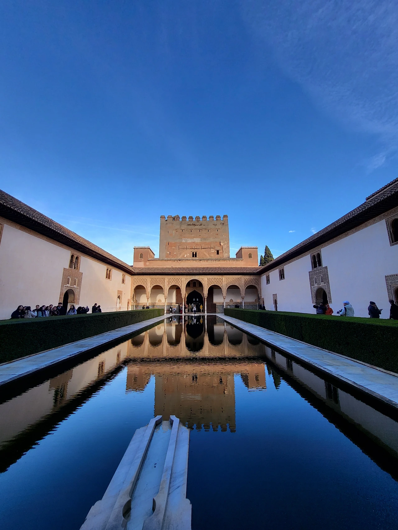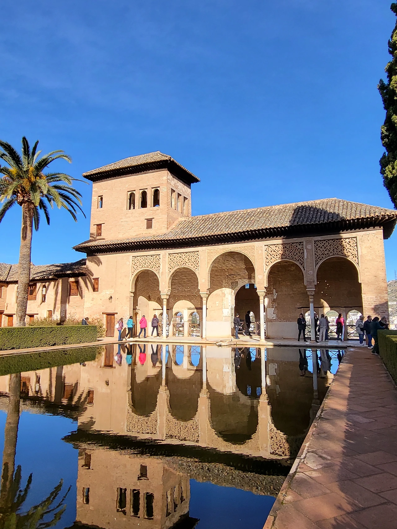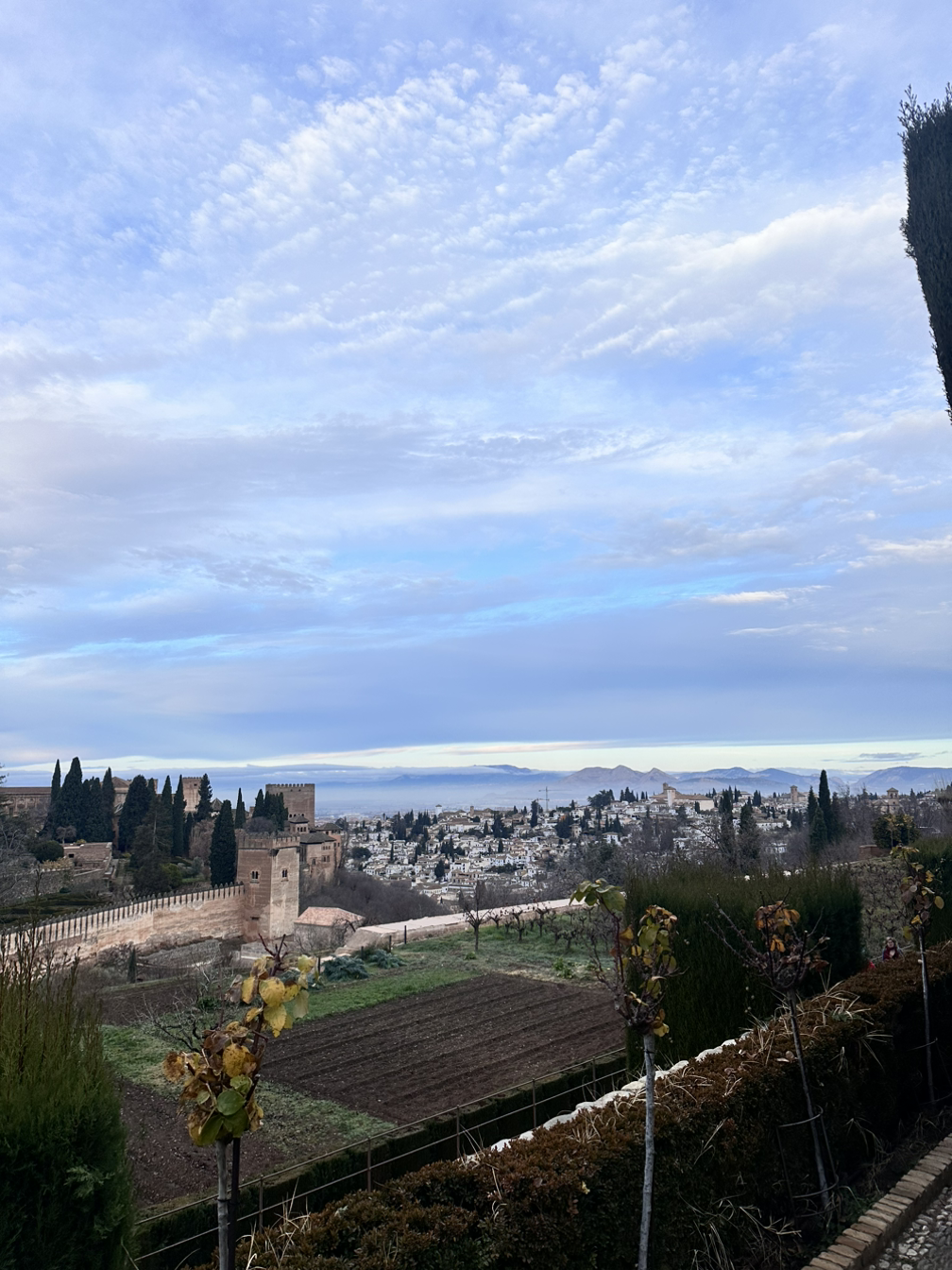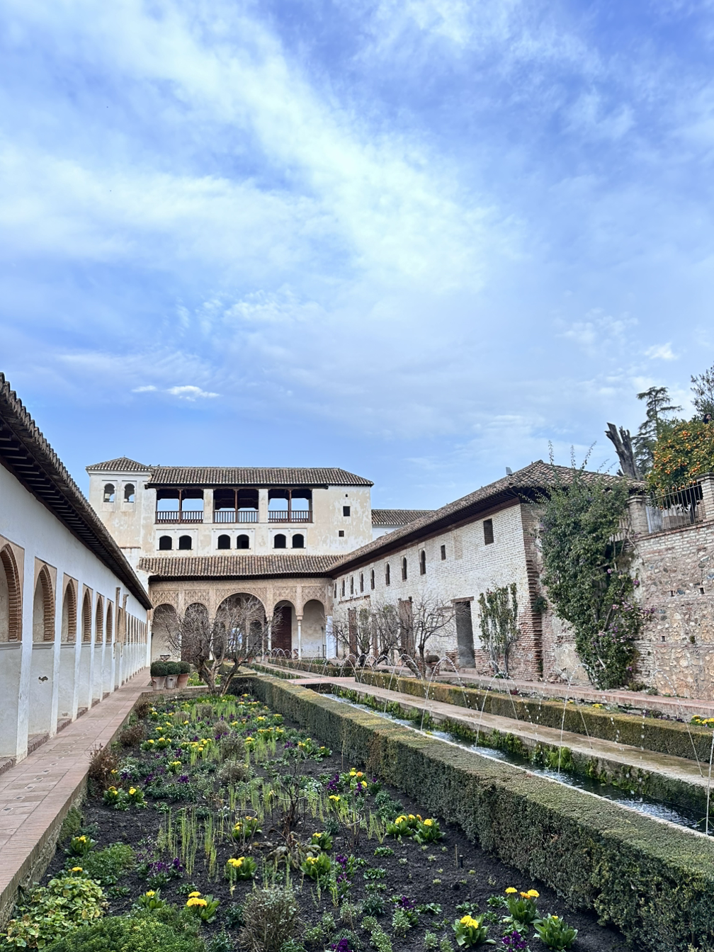 헤네랄리페는 여름 정원이었다. 영어로는 General Life라고 적혀있는데 헤네랄리페라고 읽히는 게 신기했다. 가는 길에도 큰 왕궁처럼 화려하고 정갈하게 설계되어 있는 게 신기했다. 헤네랄리페로 들어가기 전에도 넓고 멋있는 정원이 있어 착착 정리된 나무들과 분수들과 사진도 찍고, 도시 전체가 한눈에 들어오는 풍경도 보면서 걸어갔다. 드디어 헤네랄리페에 들어갔는데, 가자마자 보이는 정원은 규모도 꽤 크고 아름다웠다. 겨울인데도 꽃이 빼곡하게 심어져 있고, 가운데 분수까지 지상낙원에 들어와 있는 기분이었다. 다음으로 위층에 올라갈 수도 있었는데, 그라나다 시내와 다른 궁전들이 보여 멋있었다.