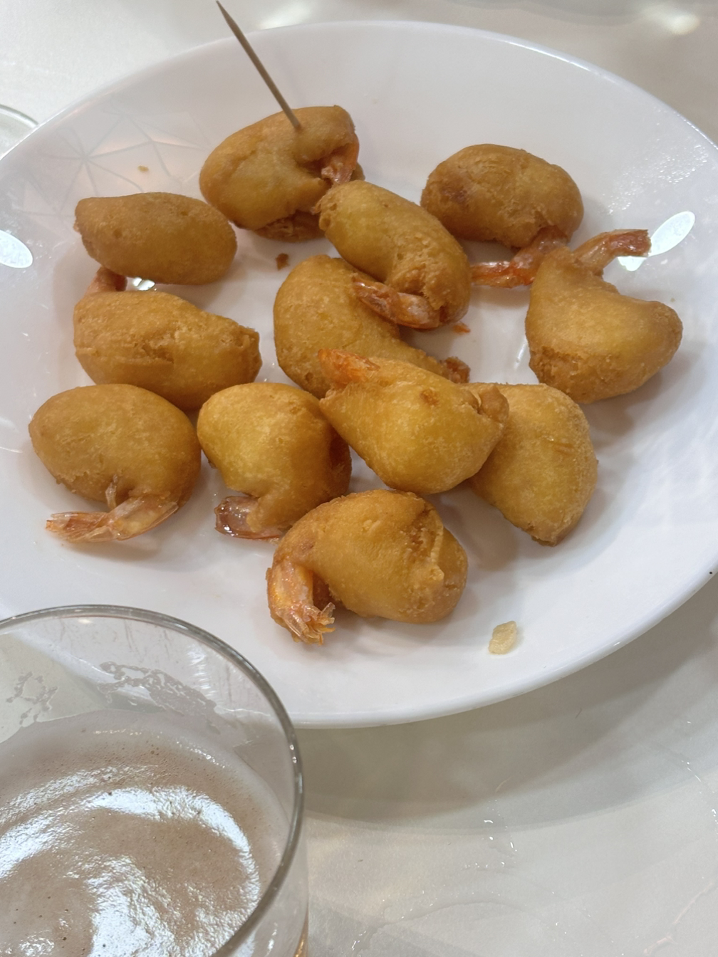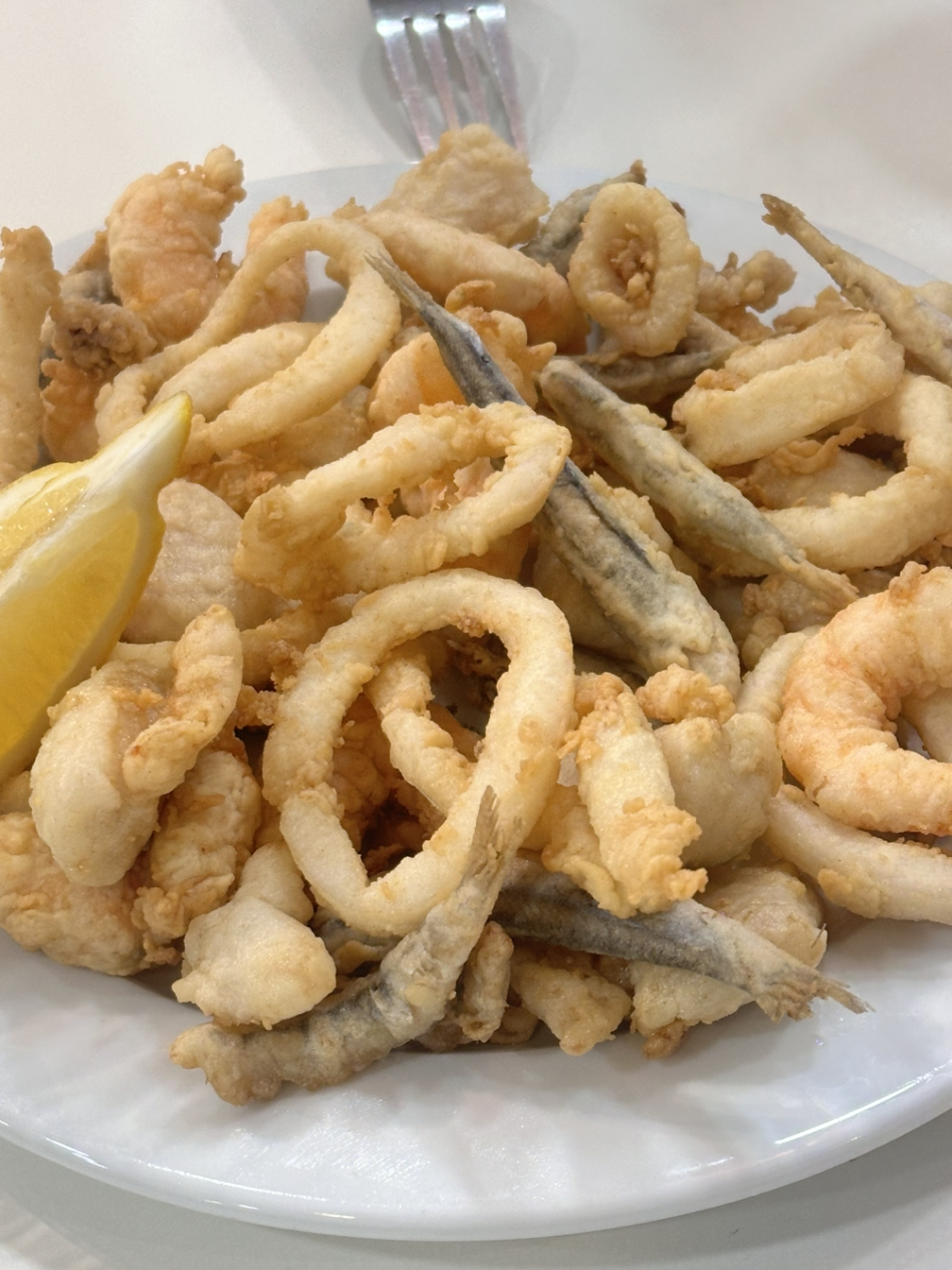 두 번째 타파스 바는 현지인들이 많이 가는 것 같은 해산물 바였다. 처음 2군데를 방문했을 때 줄이 너무 길어 포기하려다 마지막으로 한 군데를 더 방문했고, 10분 정도 기다린 후 들어갈 수 있었다. 해산물 튀김이 주로 타파스로 나온다고 해서 맥주 2잔과 와인 2잔을 주문했다. 타파스로는 작은 새우튀김이 나왔는데, 먹다 보니 너무 맛있어 모둠 해산물 튀김을 추가로 주문했다. 모둠 튀김은 작은 사이즈를 주문했는데도 양이 많았고, 앤쵸비나 새우, 생선 등 다양하게 나와서 먹기 좋았다. 갓 튀긴 해산물의 맛은 감동 그 자체였고, 맥주와 함께 행복한 시간을 보냈다.