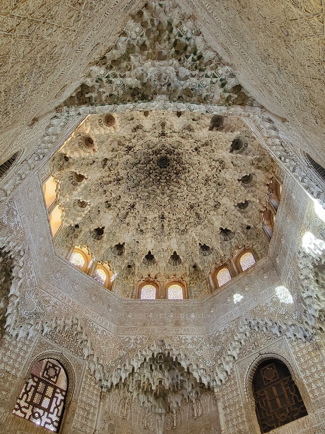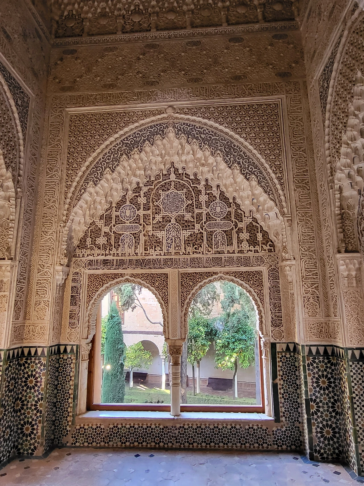 사자 정원, 대사관 응접실, 두 자매의 방 등 다양한 공간으로 나눠져 있어 순서대로 구경을 시작했다. 황금의 방에서 본 천장도 아름답고, 아라야네스 중정에 갔을 때는 ‘이게 궁전이지’ 싶을 정도로 화려함과 웅장함이 확 와닿았다. 대사의 방에서 가장 신기했던 부분은 섬세한 장치들인데, 대사들이 가까이 가지 못하도록 바닥에 그림과 글을 써놓는다던지, 왕의 뒤에서 후광이 비치는 것처럼 보이게 하기 위해 왕의 뒤에 큰 창문을 만드는 등 이 작은 공간에 얽힌 얘기들이 재밌었다. 사자의 정원, 왕의 방, 두 자매의 방, 어빙의 방 등등 설명을 들으며 쭉 구경했는데 하이라이트는 뭐니 뭐니 해도 뷰였다. 그라나다 시내가 한눈에 들어오고, 그 뒤에 산맥까지 보이는 풍경이 장관이었다.