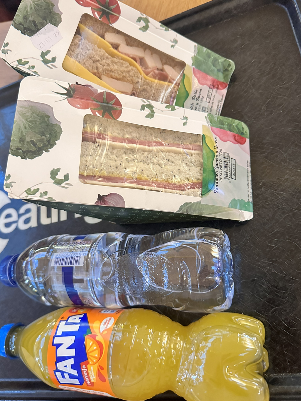 버스는 10시 40분쯤 출발했다. 출발해 1시간 반쯤 달려 휴게소에 도착했다. 시간을 40분 정도 주셔서 샐러드에 빵을 사서 언니랑 나눠먹었다. 그러고 다시 버스에 타서 3시간을 달리니 마드리드 공항에 도착했다. 공항에 도착하니 4시가 넘었다. 또 기나긴 대기줄 끝에 7시 40분 비행기의 티켓과 샌드위치 바우처를 받아 공항 안으로 들어갔다.