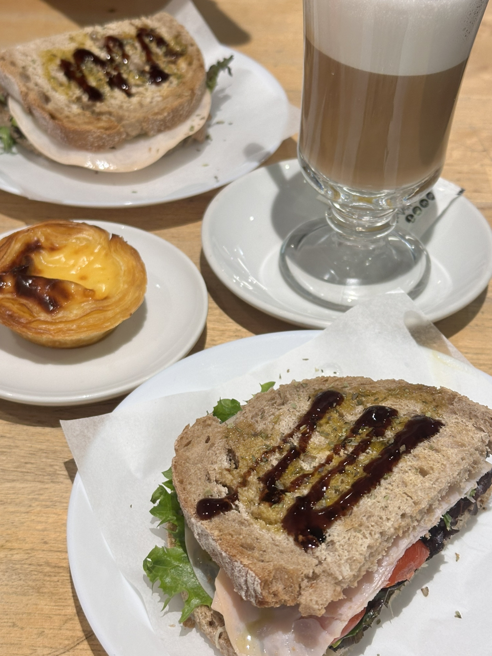 포르투를 본격적으로 즐기는 두 번째 날이다. 오늘은 간단하게 아침을 먹기로 해서 근처 카페로 향했다. 에그타르트로 유명한 집이라 샌드위치 하나, 에그타르트 하나 그리고 커피를 주문해 나눠마셨다. 샌드위치는 바삭하고 터키는 짭짤하고 올리브오일은 바삭해서 맛있었고, 커피도 무난했다. 에그타르트는 역시 맛있었는데, 조금 더 바스락거리는 식감과 꾸덕한 필링이 매력적이었다.