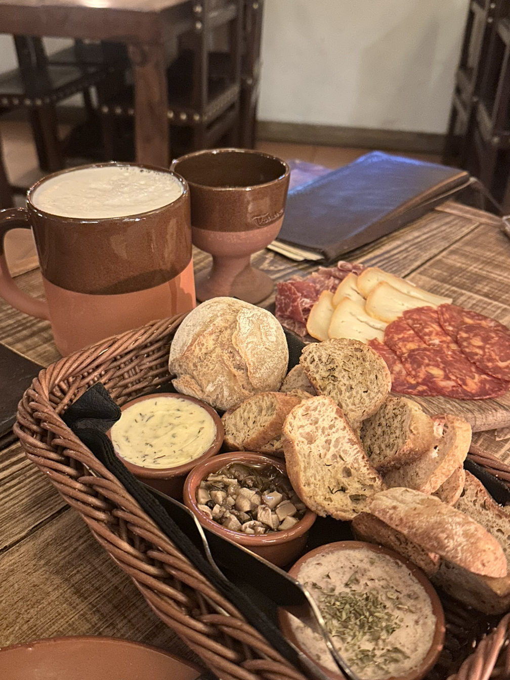 간단한 간식을 먹고 20분 정도 걸어 저녁을 먹으러 갔다. 디저트도 먹어서 간단하게 바에 갔는데, 중세 분위기로 꾸며진 술집이었다. 자리에 앉으니 수레를 끌고 오셨는데, 수레에 그날의 작은 안주들이 있어 우리는 햄 치즈 플래터를 골랐다. 수제 맥주와 포트 와인을 주문하고, 빵에 스프레드 몇 개 나오는 안주도 주문했다. 전에 마신 샌드만 와인이 훌륭해서인지 포트 와인은 살짝 아쉬웠는데 수제 맥주가 상큼해서 맛있었다. 하루종일 대충 먹어서인지 배가 고파 안주도 맛있게 먹었다. 노래도 가게 인테리어도 중세라서 신기했다.