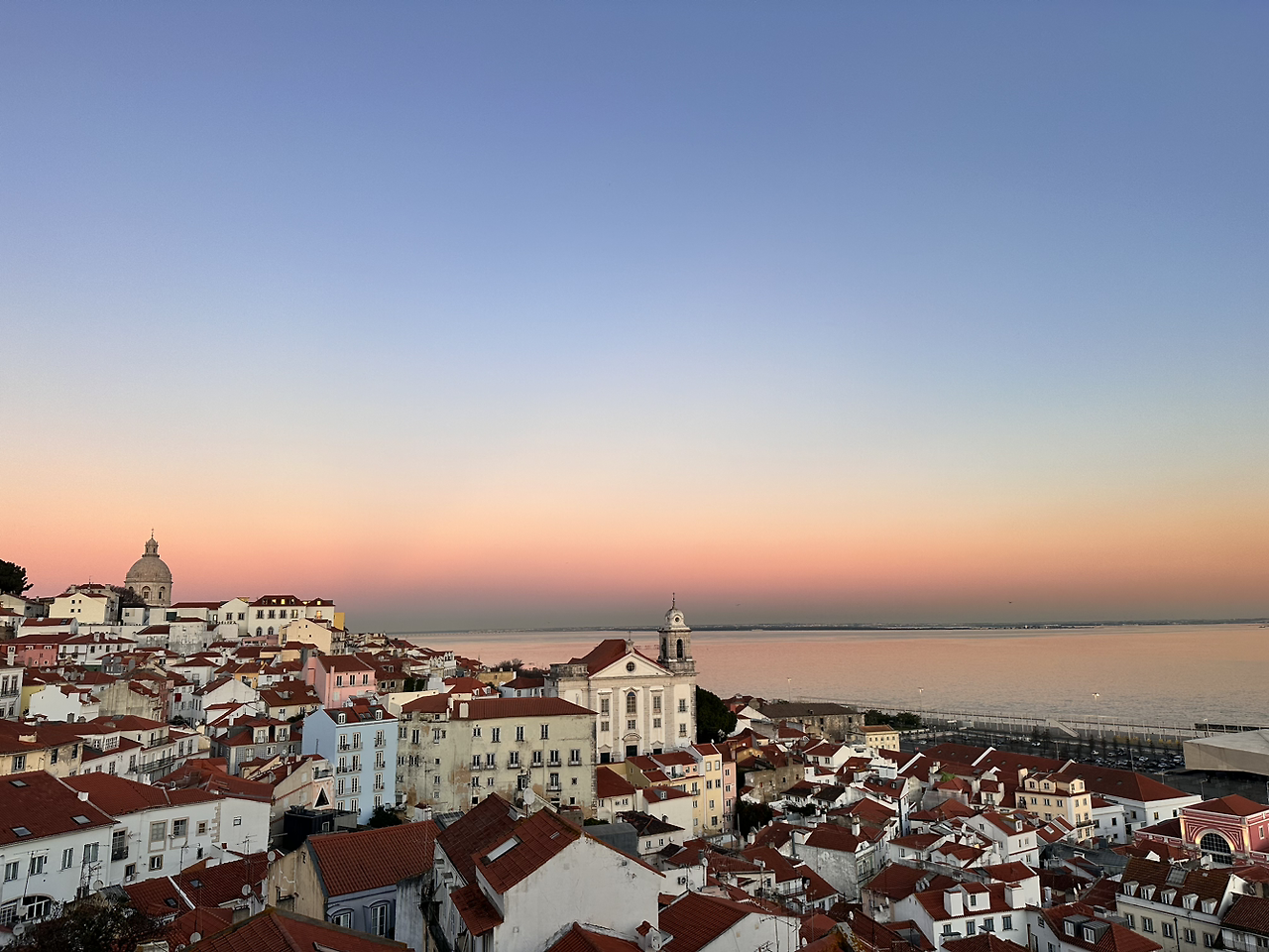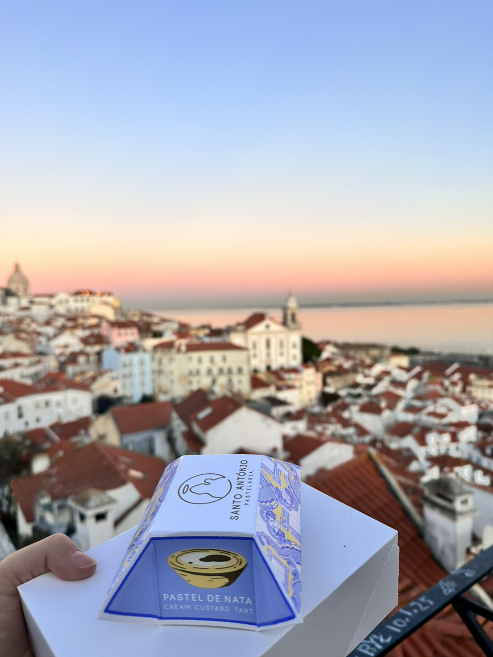 체크인을 하고 짐만 넣어놓고 다시 길을 나섰다. 리스본은 포르투보다 북적북적하고 바쁜 도시의 느낌이 있었다. 친한 언니가 추천해 준 빵집에서 에그타르트 하나와 에끌레어 하나를 사서 전망대로 향했다. 리스본은 분위기가 포르투와 달랐는데, 하늘이 파스텔톤 보라색이라서 아름다웠다. 보기만 해도 따뜻해지는 보라색이라서 사진도 찍고 한참을 구경했다. 그러고 옆에서 디저트를 먹었는데, 에그 타르트는 커스터드 크림 타르트라 그런지 달달하고 부드러웠고, 머랭이 올라간 레몬 에끌레어도 상큼하고 달달해서 맛있었다.