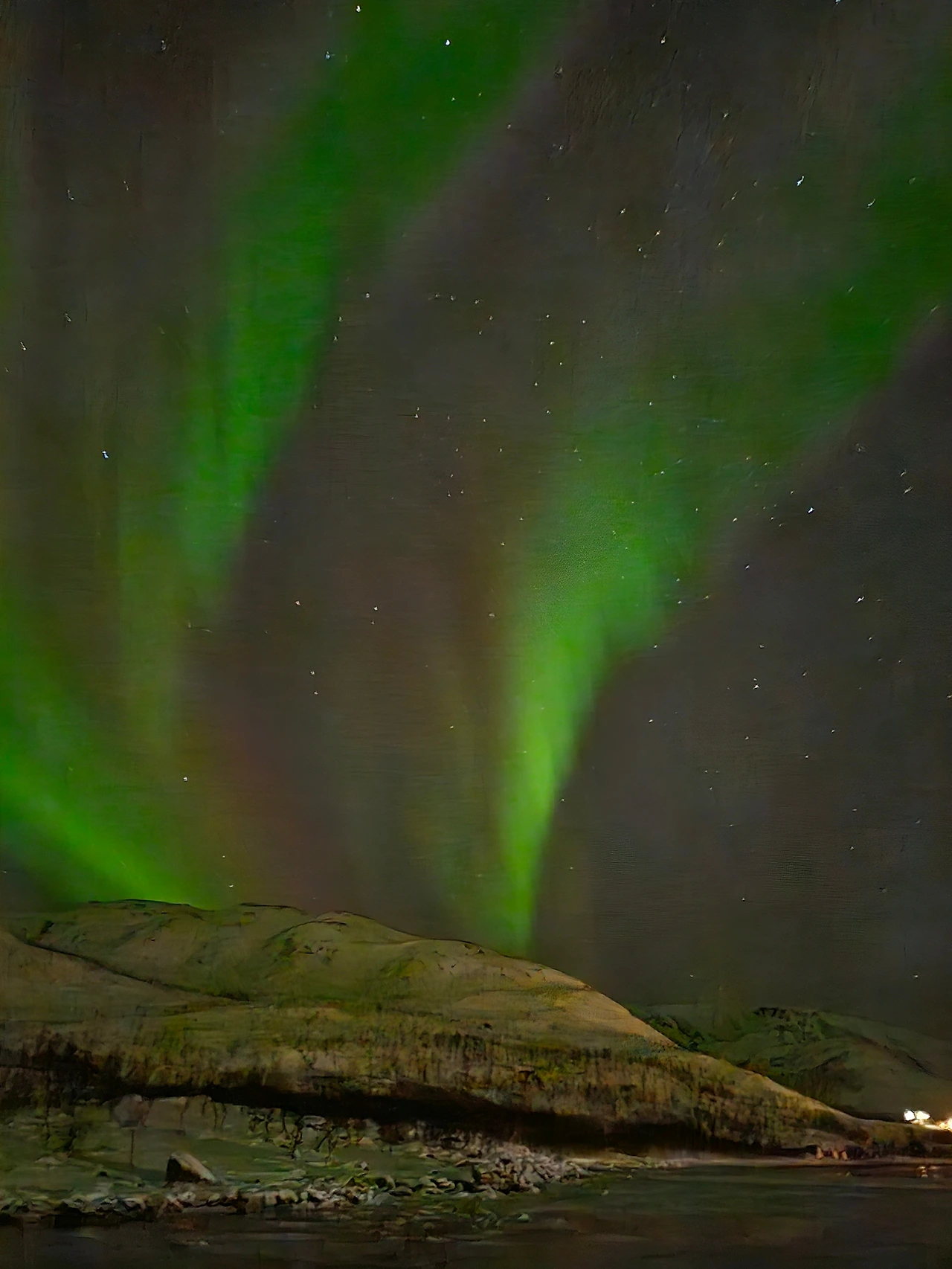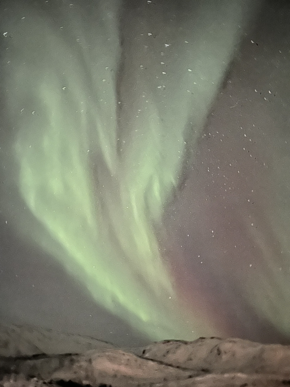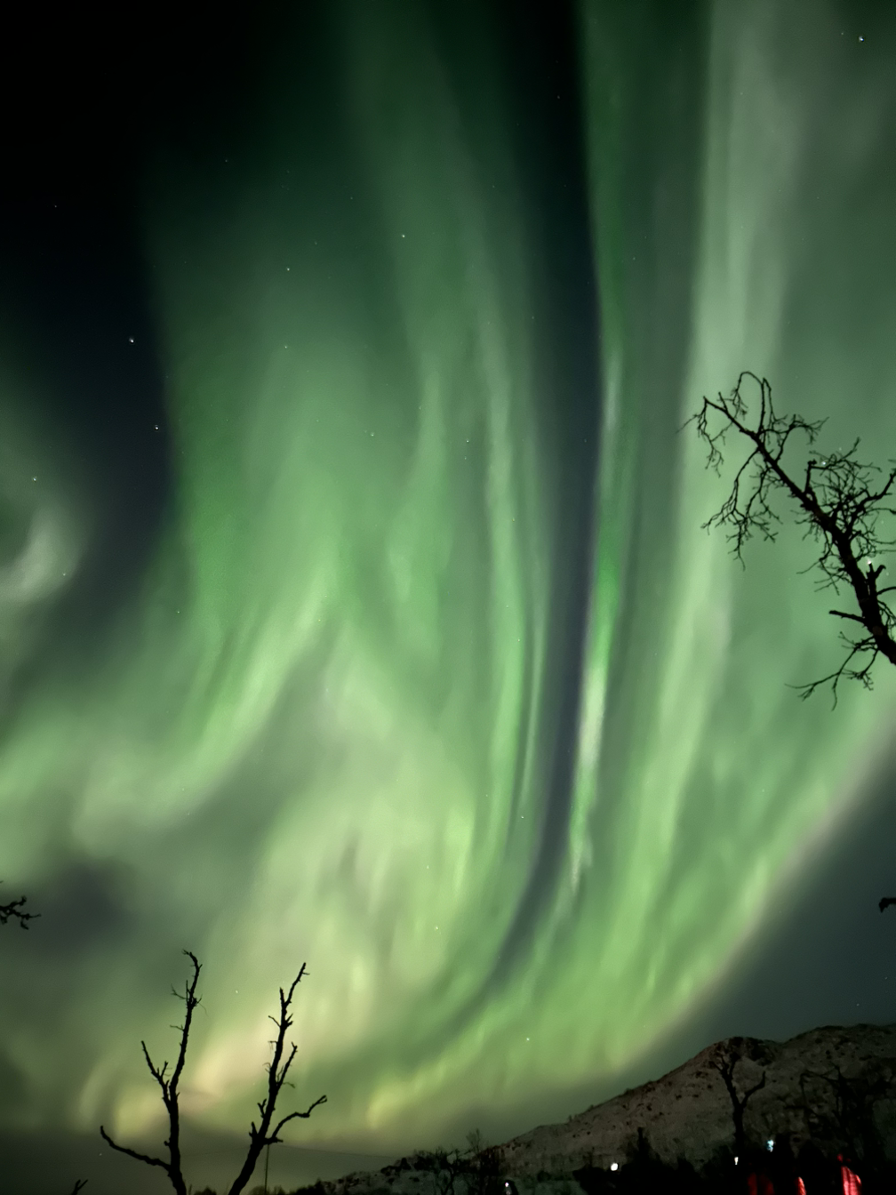 그렇게 20분 정도 더 달려 본 장소에 도착했다. 도착해서 가운데는 캠프파이어를, 캠프파이어를 둘러싸고는 의자를 쭉 놔주셨다. 내리자마자 지평선 가까이 쭉 이어진 오로라를 볼 수 있었다. 오로라는 하나가 아니고 여러 개였다. 지평선 근처에 하나, 지면에서 대기로 쭉 이어지는 오로라 그리고 지면에서 나와 지평선 근처로 뻗는 오로라까지 모양과 형태가 다양했다. 그렇게 사진도 신나게 찍고 있었더니 가이드님이 저녁을 먹으라고 불러주셨다. 저녁은 핫도그였는데, 치킨, 비건 그리고 치즈비프 중에 하나씩 꼬치로 찍어 모닥불에 구워 먹는 방식이었다. 빵도 있었는데 거의 소세지만 먹었다. 나는 치킨이랑 치즈비프를 먹었는데, 바로 구워서인지 둘 다 맛있었다. 그러고는 핫초코도 마시고 사진도 찍고 기다리고 있었더니 오로라가 점점 많아지고 세지기 시작했다. 절정에 다다랐을 때, 머리 위에 있는 모든 하늘이 오로라로 가득해 어디를 봐도 오로라가 있었다. 그러다 한 3분이 지나니 한쪽에서 오로라가 미친 듯이 춤추기 시작했다. 이게 댄싱 오로라구나 하는 생각이 들 만큼 화려하고 아름답고 경이롭고 황홀했다. 심지어 춤추는 오로라의 윗부분은 초록색, 아래는 붉은색이라 더 아름답고 꿈같았다. 오로라는 모든 조건이 맞아야 볼 수 있고, 댄싱 오로라는 오로라 중에서도 드물다고 그래서 오로라를 카메라가 아닌 두 눈으로 조금이라도 보고 싶다는 생각을 가지고 온 트롬쇠라서 기적처럼 행복했다. 오로라가 살아있는 것처럼 이리저리 움직여 환상적이었다. 처음에는 담으려다가 눈으로 담는 게 더 행복할 것 같아 가만히 보고 있었다. 그렇게 한참을 바라보다 보니 오로라가 잠잠해졌다. 그래도 여전히 조금씩 움직이고 생겼다 없어지고를 반복했다. 없어져도 별들이 하늘을 가득 채워 행복 Max 상태였다. 가이드님께서 화성과 목성도 알려주셔서 행성도 처음으로 보고, 과학시간에 배운 별자리들도 두 눈으로 생생하게 보여 신기했다. 모닥불 주변에 모여 앉아 마시멜로도 구워 먹고, 사람들이랑 얘기도 하고 별이랑 오로라도 보면서 여유롭고 꿈같은 시간을 보냈다. 원래 오로라를 보지 못하면 자정 넘어서까지 진행되는데, 우리는 너무나 선명한 최고의 오로라를 봐서 9시 반쯤 다시 트롬쇠로 향했다. 조금은 아쉬웠지만, 오로라를 봤다는 게 너무 행복했다. 그렇게 트롬쇠 시내로 돌아와 집에 도착했다. 이 여운을 살리기 위해 맥주를 한 잔씩 마시고 싶었지만, 여기는 술을 8시까지만 판매한다고 해서 사 오지 못했다. 집으로 돌아와 내일 하루를 그냥 보내기 아쉬워 투어를 조금 찾아보고 글도 쓰고 쉬다가 이제 씻고 자려고 한다. 인생 첫 오로라, 인생에서 가장 많은 별들과 함께한 황홀한 하루였다.