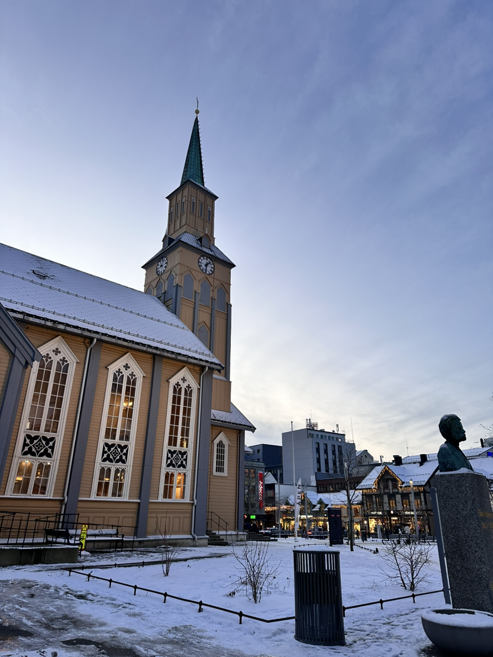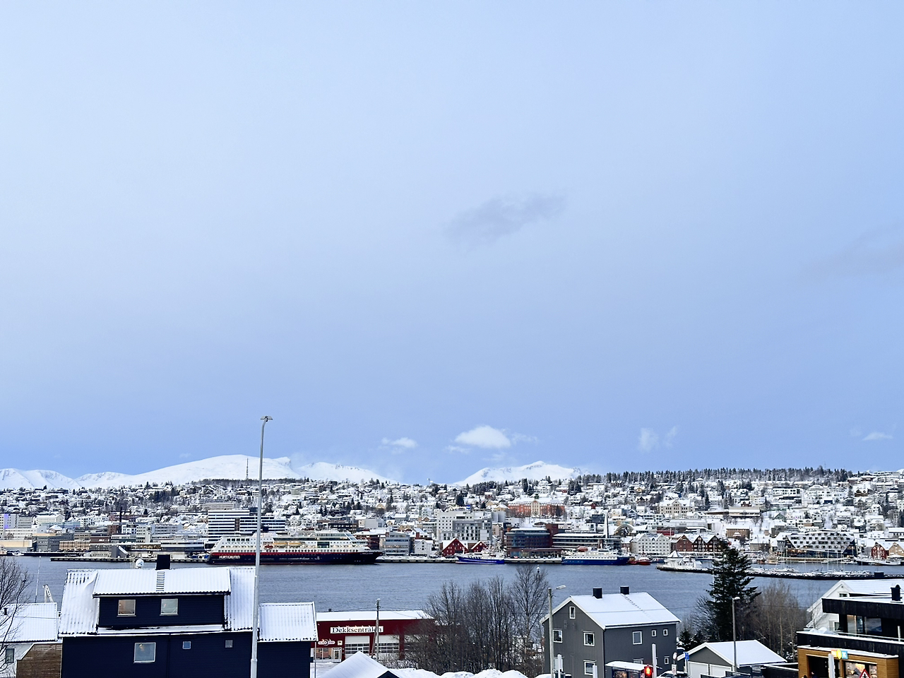 오늘의 첫 일정은 북극 대성당이었다. 지구 최북단 성당으로, 감각적이고 특이한 외관으로 유명한 성당이다. 확실히 성당 같지 않고 전시관이나 작품 같은 감각적인 외관이었다. 가서 사진을 찍고 앞쪽으로 걸어갔더니 장례식 중이라 관광객은 입장 불가하다는 안내가 있었다. 아주 조금은 아쉬웠지만 고인을 잘 보내드리는 게 중요하기에 그냥 돌아갔다. 트롬쇠 메인 시내에서 다리를 건너 건너편에서 보는 시내는 아름다웠다. 동화에 나올 것 같은 아기자기한 풍경과 눈이었다. 반대쪽으로는 설산이 펼쳐졌는데, 북유럽 정말 좋다는 생각이 머리를 가득 채웠다.