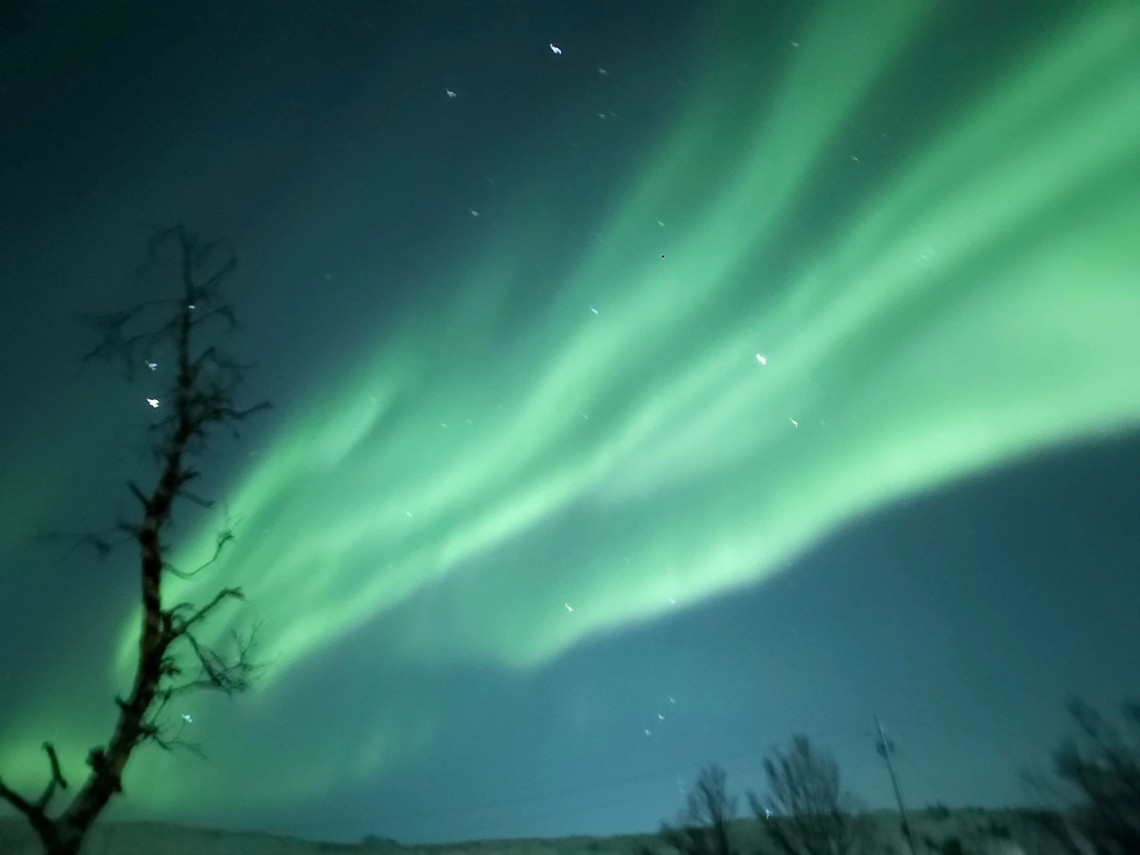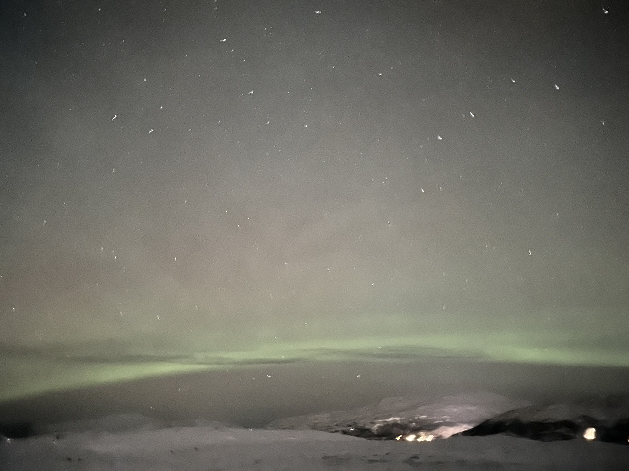 이동한 지 25분쯤 되었을 때 화면 아래쪽에 초록빛이 보이기 시작했다. 원래 20분 정도 더 가서 캠프파이어를 하는 것으로 예정되어 있었지만, 간단한 포토슛을 위해 잠깐 멈췄다 간다고 하셨다. 그전까지는 졸려서 졸고 있었는데, 눈이 번쩍 떠지면서 심장이 뛰기 시작했다. 첫 오로라라니 기대도 많이 되고 긴장도 되었다. 눈으로 보이지 않을 수 있다고 하셔서 큰 기대는 안 하고 내렸는데, 내리자마자 오로라가 지평선을 타고 쭉 이어져 있는 게 보였다. 내 눈으로 오로라를 담고 있다는 게 믿기지 않았다. 말로 표현하기 힘든 벅참이 있었다. 가이드님이 계속 이건 에피타이저리고 하셔서 본 캠프 장소에 대한 기대가 점점 커졌다.
