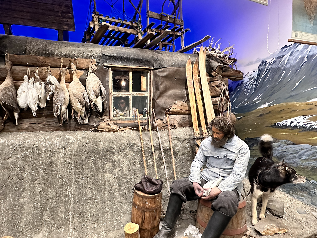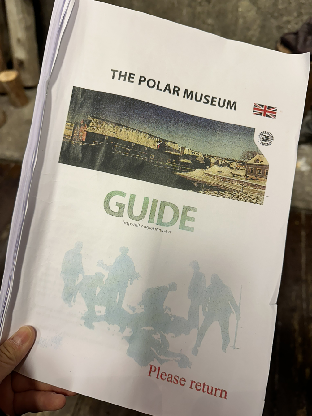 다음 코스는 극지방 박물관이다. 트롬쇠까지 와서 박물관?이라는 생각이 어제 들었는데, 찾아보니 리뷰가 좋아서 우리도 가보기로 했다. 가서 티켓을 예매하니 정이 책자를 주셨다. 책자라고 하기 살짝 애매한 A4용지 뭉치였다. 이렇게 아날로그 식으로 안내해 주는 박물관은 처음이라 신기했다. 한국어 안네는 없어 어쩌다 보니 영어 읽기 평가가 되었다. 극지방 박물관은 주로 극지방 사람들의 삶에 관한 박물관이었다. 첫 관은 생활 모습을 그대로 나타낸 관이었는데, 생생하고 사실적으로 표현되어 있어 놀랐다. 사람도 동물도 진짜 같아서 그때의 생활 모습을 생생하게 느낄 수 있었다. 극지방의 동물에 관한 설명이 많았고, 각 동물이 어떻게 사냥되었는지 사냥 방식의 변화, 개체수의 변화 그리고 규제의 변화까지 다양하게 설명했다. 유명한 탐험가들에 관한 얘기도 같이 나와있었는데, 예전에 북극곰의 왕으로 불린 사냥꾼과 최초의 여성 사냥꾼까지 극지방을 빛낸 위인들 느낌으로 인물 소개가 꽤 자세하게 있어서 재밌었다. 박물관이 작으면서도 커서 1시간 정도 구경하고 기념품 가게도 갔다가 나왔다.