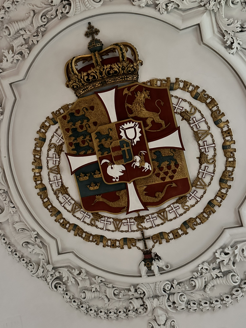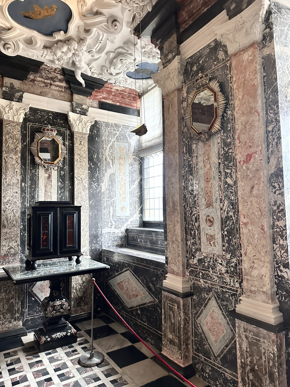 아름답게 관리된 정원을 뒤로하고 로젠부르 궁전으로 들어갔다. 메인 궁전과 지하실로 크게 2개의 문이 있었는데, 메인 궁전부터 들어가 봤다. 메인 궁전은 천장과 벽이 화려하게 꾸며져 있었는데, 금이나 은처럼 번쩍번쩍한 장식은 아니라 압도적인 화려함은 아니었지만 각각에 어울리는 장식과 색으로 꾸며져 있었다. 덴마크 왕실이 다른 왕실에 비해 검소한 편이라서 국민들에게 사랑을 받는다고 하던데, 왕실의 상대적인 검소함이 여기서 나타나나 싶었다. 이전에 간 파리나 독일 등의 궁전에 비해서도 소박하고 간결했다. 방의 크기나 개수만 봐도 느껴졌는데, 작은 규모라 짧게 구경하고 나왔다.