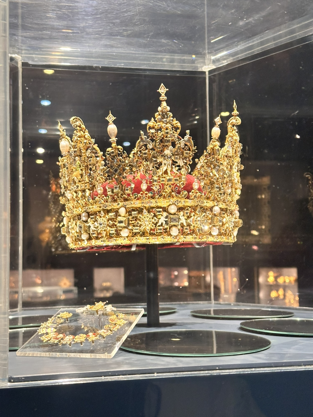 바로 옆에 지하실이 있어 구경을 나섰다. 지하실은 왕실의 보물을 저장하는 곳이었는데, 대표적으로는 여왕의 왕관을 보관하고 있었다. 왕관은 보자마자 럭소리가 나올 정도로 화려하고 섬세했다. 전체적인 금과 진주가 화려했고, 군데군데 작게 아기천사 조각이 있는 것까지 디테일로 가득했다. 보기만 해도 위엄이 느껴지는 것만 같은 왕관이었다. 이외에도 액세서리 종류가 많았다. 시상식이나 화보에서 본 것 같은 세상 화려하고 볼드한 목걸이도 많았고, 세트인 귀걸이나 브로치까지 구경하는 재미가 있었다. 규모는 작았지만, 궁전만큼이나 보는 재미가 있었다. 밖에는 군인 분들이 서계셨는데, 일정한 시간마다 재정비를 하시는 게 멋있었다.
