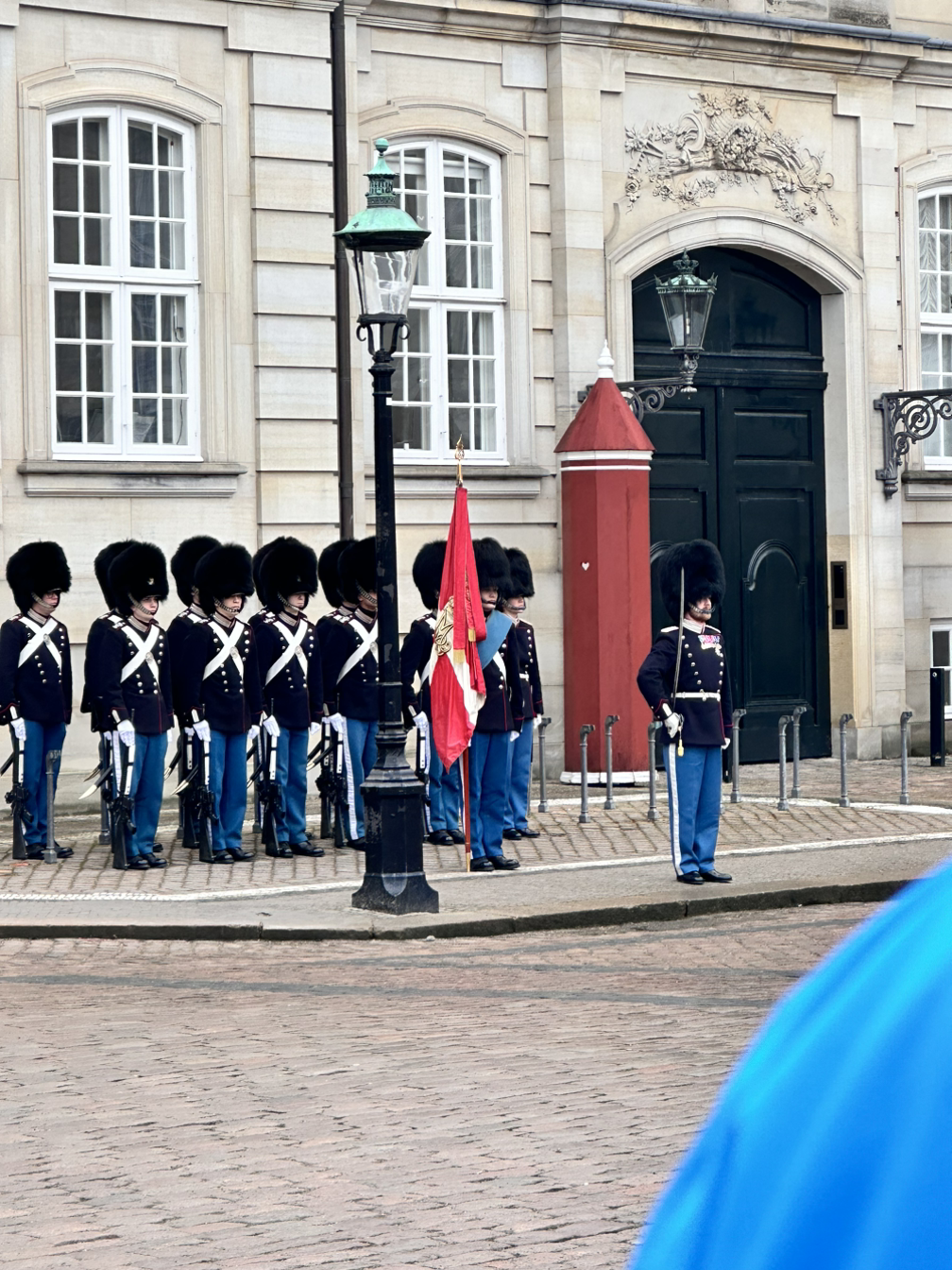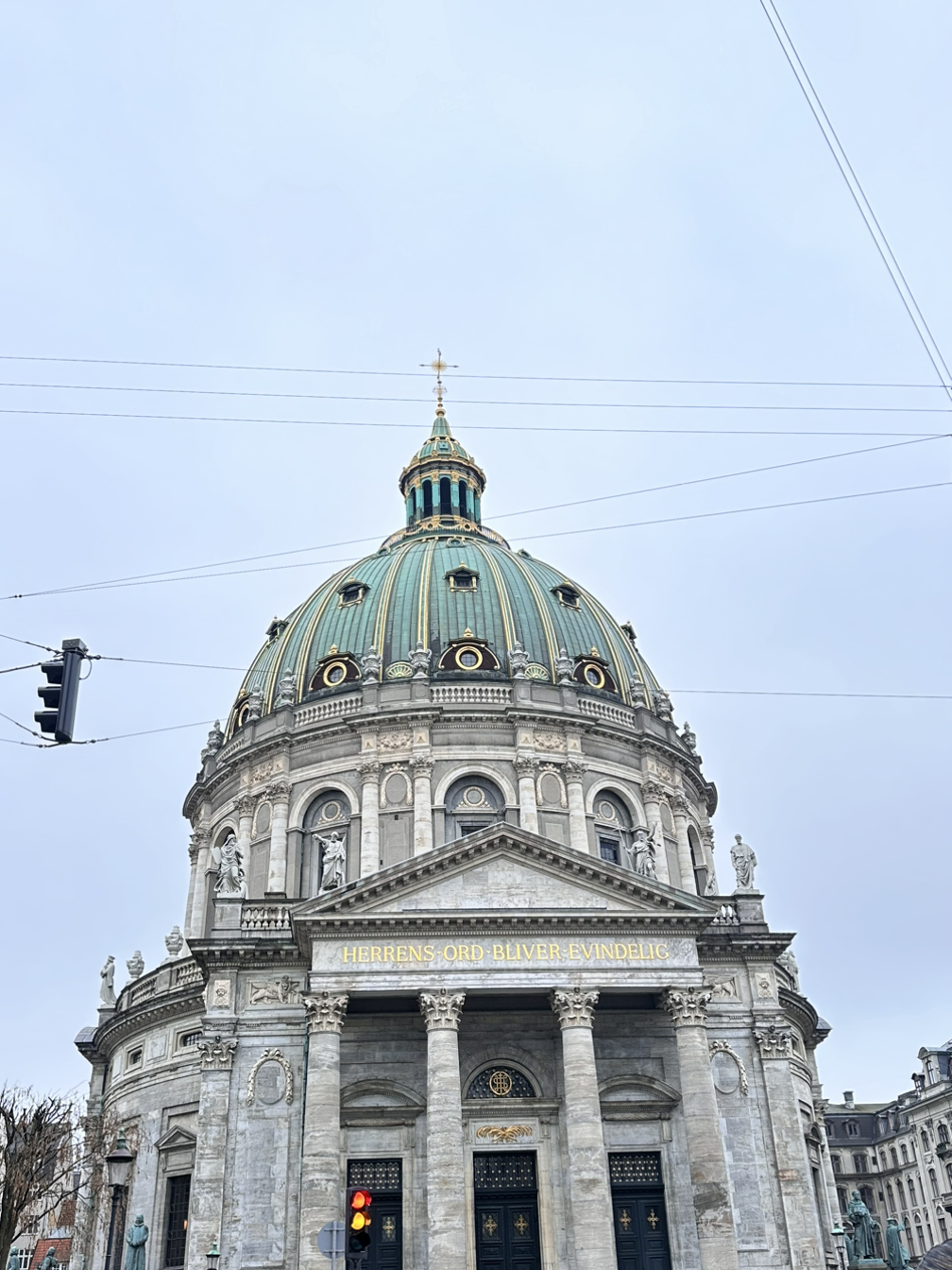 시장 구경을 마치니 갑자기 악기 연주 소리가 들리기 시작했다. 가까이 가보니 근위병 교대식이 열리는지 행진이 이어지고 있었다. 알고 보니 근위병 교대식까지 10분이 남았고, 우리도 교대식 장소까지 도보 10분 거리라서 교대식을 보고 다음 일정으로 가기로 했다. 행진이 교대식 장소인 아말리엔보르 궁전까지 이어지고 있었고, 사람들도 행진을 졸졸 따라가고 있어 귀여웠다. 우리도 같이 따라가 궁전 마당 같은 곳에서 기다렸다. 잠시 기다리니 악기 연주와 함께 본격적인 행진이 시작되었다. 근위병 군복은 신기하고 행진도 멋있었지만, 안전요원 분이 인파를 이리저리 움직이셔서 살짝은 덜 정돈된 느낌이라 아쉬웠다. 그래도 잠깐 구경하고 바로 옆에 있던 프레드릭 교회의 외관까지 볼 수 있었다.