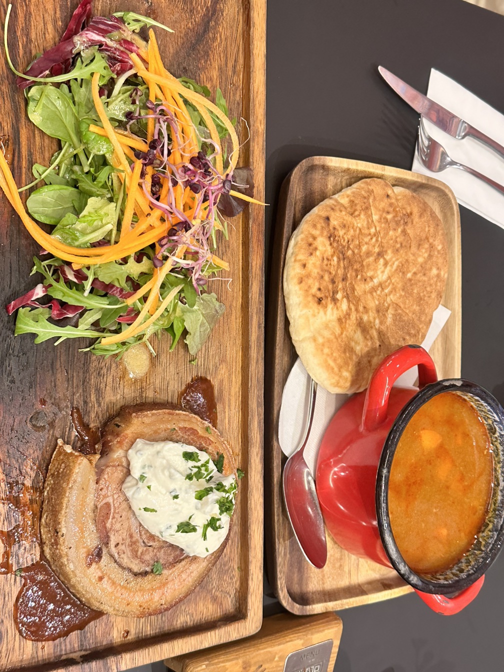 카운트다운 3. 귀국까지 3일 남은 날이자, 대망의 마지막 도시인 부다페스트로 넘어가는 날이다. 오잔 비행기라서 6시 반쯤 일어나 호다닥 준비를 마치고 공항으로 향했다. 코펜하겐은 도시가 작아 공항까지 얼마 걸리지 않는 게 좋은 것 같다. 20분이면 공항에 도착할 수 있어 체크인을 마치고 면세 구역으로 들어가도 2시간 정도가 남았다. 큰 공항이라서 그런지 식당도 많았다. 지금까지 가본 공항 중 가장 F&B가 잘 되어있는 것 같다. 식당 종류도 다양한데, 하나같이 퀄리티도 좋아 보였다. 아침이라 먹을게 끌리지는 않아 카운터 근처로 가서 앉아있었다. 책을 읽으려고 했는데, 졸려서 꾸벅꾸벅 졸았다. 그러다 비행기 보딩시간이 되어 얼레벌레 비행기에 탔고, 비행기에서도 계속 잤다. 이륙 전부터 잠을 자서 착륙하는 진동에 눈을 떴다. 꿀잠을 자고 부다페스트에 도착했다. 호텔에 가서 짐부터 맡기고 시내 구경을 시작했다. 점심시간이라 밥부터 먹었는데, 전통 음식을 한 번은 먹어봐야지 싶어 헝가리 음식점으로 향했다. 굴라쉬랑 돼지고기 요리를 주문했다. 독일에서 비슷한 돼지고기 요리를 먹었는데, 지금까지 나의 최애 동유럽 음식이라 마지막으로 먹고 싶어서 주문해 봤다. 굴라쉬는 육개장 맛이라는 말이 있던데, 진짜 중동 향신료 맛이 느껴지는 뜨끈한 국 같아서 맛있었다. 전에 잘츠부르크에서 먹은 굴라쉬는 국물보다는 소스에 가까웠는데, 여기는 진짜 수프 같았다. 안에는 당근과 감자 그리고 고기가 들어있었는데 다 맛있었다. 돼지고기 튀김은 무난하게 맛있었는데, 살짝 느끼했지만 소스랑 같이 먹으니 그나마 괜찮았다.