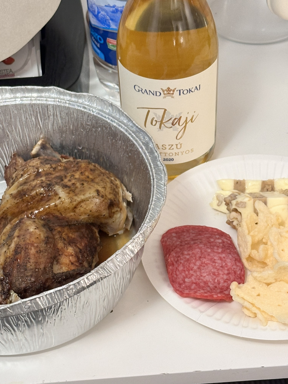 3시간 정도에 투어를 마치고 나니 배가 고팠다. 호텔로 돌아가는 길에 앞에 줄 서서 기다리고 있는 전기구이 통닭 같은 치킨집이 있었다. 시간이 늦기도 하고 호텔에도 간식이 많아 처음에는 지나쳤다가 냄새와 비주얼이 이끌려 다시 사러 나갔다. 그렇게 치킨 반마리를 포장해 오고 마트에서 사 온 간식과 함께 야식 타임이 시작되었다. 토카이 와인과 야무진 안주와 함께하는 시간이라 행복했다. 안주가 맛있어서인지 술이 끝도 없이 들어갔고. 반만 마시려고 했던 와인 한 병을 다 비웠다. 그리고 나는 반쯤 취해 기절하듯 잠에 들었다. 이제 이틀 남았다.