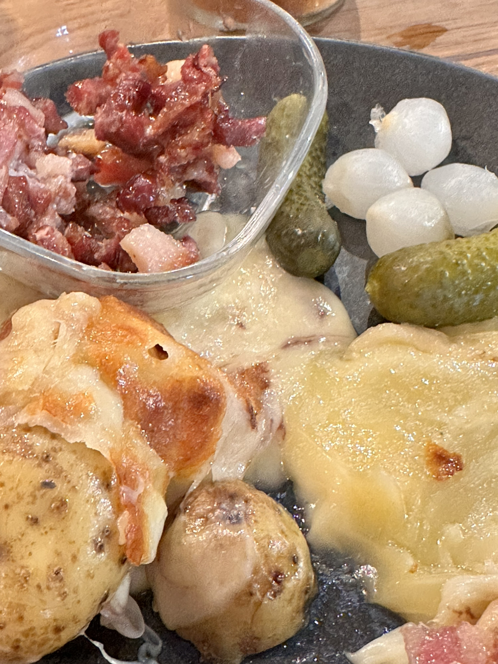 소중한 친구 자랑을 너무 많이 한 것 같아 이쯤에서 멈추고.. 친구랑 스위스의 대표 음식인 라끌렛을 먹으러 갔다. 감자나 빵, 매쉬포테이토에 목인 치즈를 올리고 베이컨이나 소세지와 같은 토핑을 곁들여 먹는 스위스의 음식이다. 나는 스위스에 온다고 처음 들어보고 처음 먹어보는 음식이라 기대를 많이 했다. 직접 조합해 먹는 게 맛있다고 해서 일반 치즈랑 레드와인 치즈, 감자 그리고 베이컨 토핑을 골랐다. 그리고 느끼하다고 해서 맥주까지! 잠시 기다린 후에 나온 라끌렛은 비주얼부터 맛있어 보였다. 공복 상태에서 임 너무 많은 일을 겪은 후라서 배가 고팠다. 통감자를 잘라서 치즈를 올려 한 입 먹어보니 감자의 부드러움과 치즈의 고소함, 짭짤함이 어우러져 환상적인 맛이었다. 따ᆞ각 맥주랑 잘 어울리는 중독적인 맛이었다. 치즈가 조금 바삭해진 부분은 치즈 과자를 먹는 맛과 식감이고, 녹아서 부드러운 치즈는 감자와 베이컨이랑 잘 어울렸다. 가장 감동을 받은 부분은 감자이다. 감자의 퍽퍽함이나 느끼함 전혀 없이 이렇게 포슬포슬하면서 부드럽고 촉촉한 감자는 처음 먹어보는데, 스위스 감자가 유명하다는 얘기는 들어봤는데 이렇게 맛있을 줄은 몰랐다. 베이컨도 짭짤하고 바삭해서 식감이 조화로웠다. 맥주까지 시원하게 마시며 첫 끼를 든든하게 잘 먹었다.