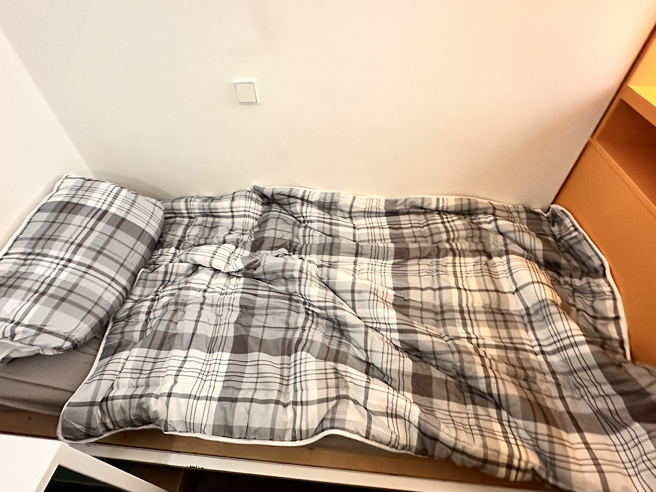 내가 구한 집은 기숙사의 sublet이다. 독일에는 기숙사를 학생 마음대로 임대를 줘도 된다. 어떤 기숙사들은 합격증이나 학생증 등등을 철저하게 검사하던데, 내가 구한 기숙사인 olydorf는 그렇지 않아서 나도 지낼 수 있었다. 나는 그중에서도 낭만 넘치는 bungalow를 구했다. 아주 좁은 집이지만, 2층이라는 장점이자 단점이 있다. 평수를 정확하게는 모르지만 5평 정도 되는 공간에 1층은 거실과 부엌, 화장실이 있고 2층은 책상과 침대 그리고 테라스가 있다. 집주인을 만나 열쇠를 전달받고 이것저것 주의사항도 알려줬다. 이를테면 열쇠를 잃어버리면 벌금이 있는 거..? 주의사항과 안내를 듣고 캐리어를 넣어놓고 집 구경을 잠깐 시작했다. 집은 내 예상보다 황량했다. 어느 정도의 사용감이 있을 줄 알았는데 침대 매트리스와 책상, 소파가 끝이었다. 조리기구와 접시는 둘째치고 당장 잠을 자기 위한 매트리스 커버와 이불부터 사야 했다.