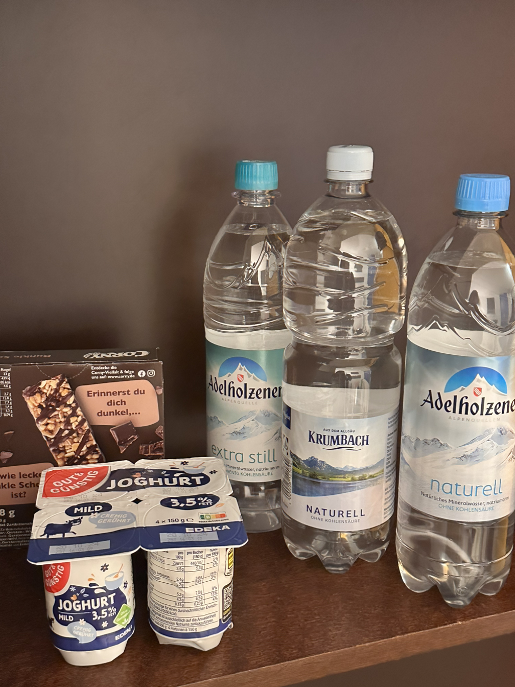 집에 도착해 문을 열어보니 문이 열리지 않았다. 아무리 돌려도 밀어도 당겨도 문이 꿈쩍도 안 했다. 순간 수만 가지 생각이 들었다. ’ 뭐지? 신종 집 사기인가?‘, ’ 내 캐리어 저기 안에 있는데 오늘 노숙하는 건가?‘ ’ 지금이라도 아고다를 켜서 호텔을 알아봐야 되나?‘등등 수많은 생각이 들어 집주인에게 연락했지만 답장은 바로 오지 않았다. (사실 당연하다. 우리도 칼답을 잘하지 않으니..) 그래서 여유롭게 마음을 먹고자 해서 이 기회에 슈퍼라도 다녀오기로 했다. 이불만 내려놓고 걸어서 5분 정도 걸리는 마트로 향했다. 내일 아침에 먹을 요거트도 담고, 간식으로 먹을 에너지바도 담았다. 그러다가 한국말이 들려서 혹시나..! 하고 다가갔다. 인사를 하고 혹시 어디 사시는지 여쭤봤는데 나랑 같은 기숙사에 산다고 하셔서 열쇠 여는 방법을 여쭤봤는데 너무 친절하게 알려주셨다. 문을 최대한 당겨서 최대한 오른쪽으로 열쇠를 돌리라고,,, 하셨다. 열쇠의 사용법은 참으로 복잡한 것이었다. 그래도 문을 여는 방법을 터득해 신나게 계산을 하러 갔다. 여기는 특이하게 음료는 건너편 에데카에 따로 위치해 있었다. 건너편에 가서 물도 3개 사서 집으로 향했다. 과연 알려주신 방법대로 열어보니 문이 열렸다. 안으로 들어가 무거운 짐부터 내려놓고 정리해야 될 짐과 집에 대해 생각을 잠깐 하고 바로 움직였다.