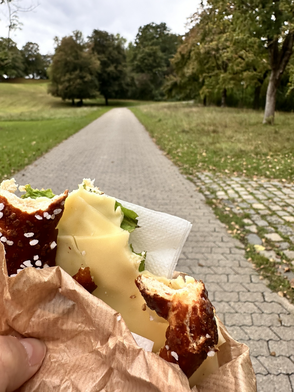 오늘은 여행 2일 차이자, 제대로 된 1일 차이다. 시차 때문인지 새벽에 눈이 2번 정도 떠졌지만, 다시 눈을 감으니 잠이 잘 왔다. 8시쯤 일어나서 밍기적거리다가, 8시 반에 가족들과 전화하면서 일어났다. 상쾌한 아침을 맞이하고 싶어서 커튼을 열었는데 내 방이 테라스가 두 개나 있는 방이었다. 1층(우리나라 층수로는 2층)이라서 나무, 그리고 도로 뷰였지만 독일 감성을 느낄 수 있어서 잠깐 나가서 구경도 하고 여유를 즐겼다. 백팩에 있던 짐을 캐리어에 옮겨 담고, 나갈 준비를 하고 9시 20분쯤 호텔을 나섰다. 목적지는 빵집과 마트! 아침과 점심을 사러 빵집 먼저 향했다. 동네 사람들도 앉아있는 것을 보니 동네 맛집인 것 같았다. 빵집에서 시나몬롤 하나와 프레첼 샌드위치를 샀다. 그러고 마트까지 걸어가 구경을 하고 과자 하나와 물, 그리고 그릭요거트 하나를 사서 호텔로 향했다. 풍경이 예뻤던 테라스에서 그릭 요거트와 시나몬롤을 먹고, 짐을 마저 챙겨서 체크아웃을 했다.