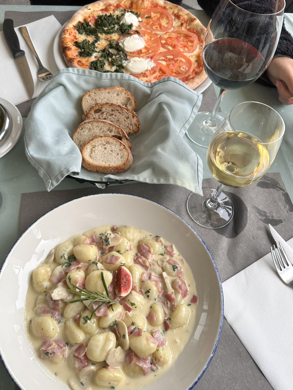 저녁 메뉴는 피자와 파스타! 강 주변에서 먹을 장소가 있는지 찾아보다가 친구가 찾은 식당으로 갔다. 다행히 날씨도 그렇게 춥지 않아서 야외에서 낭만 가득하게 먹을 수 있었다. 뇨끼와 피자 한 판 그리고 친구는 레드 와인, 나는 화이트 와인을 주문했다. 와인부터 나와서 마시는데 강가에서 마시는 와인은 청량 그 자체였다. 그렇게 홀짝홀짝 마시다 보니 피자와 뇨끼가 나왔다. 피자는 도우부터 만드신 수제 피자였는데, 토핑이 토마토밖에 없는 부분은 처음에 봤을 때는 오잉? 싶었지만 먹어보니 깔끔하게 맛있었다. 나머지 반은 시금치와 치즈가 들어간 피자였다. 피자는 무난하게 맛있었다. 특히 올리브오일에 마리네이드한 매운 고추가 같이 나왔는데, 이게 킥이었다. 처음에는 피클인 줄 알았는데 오일이라서 약간 당황했다. 그런데 친구의 추천으로 올려서 먹어보니 매콤한 고추와 느끼하고 투박한 피자가 잘 어울렸다. 피자가 화덕에 구운 피자라 담백한데 매운 고추의 올리브오일을 곁들이니 풍미도 살아났다. 뇨끼도 맛있었다. 메뉴 이름이 ‘할머니의~’ 이런 느낌이라 기대했는데, 뇨끼도 쫀득 부드러워서 맛있고 소스도 뇨끼랑 잘 어울렸다. 뇨끼는 간이 약간 세서 저녁에 목이 자주 말랐지만, 와인과 피자 크러스트와 잘 어울렸다.
