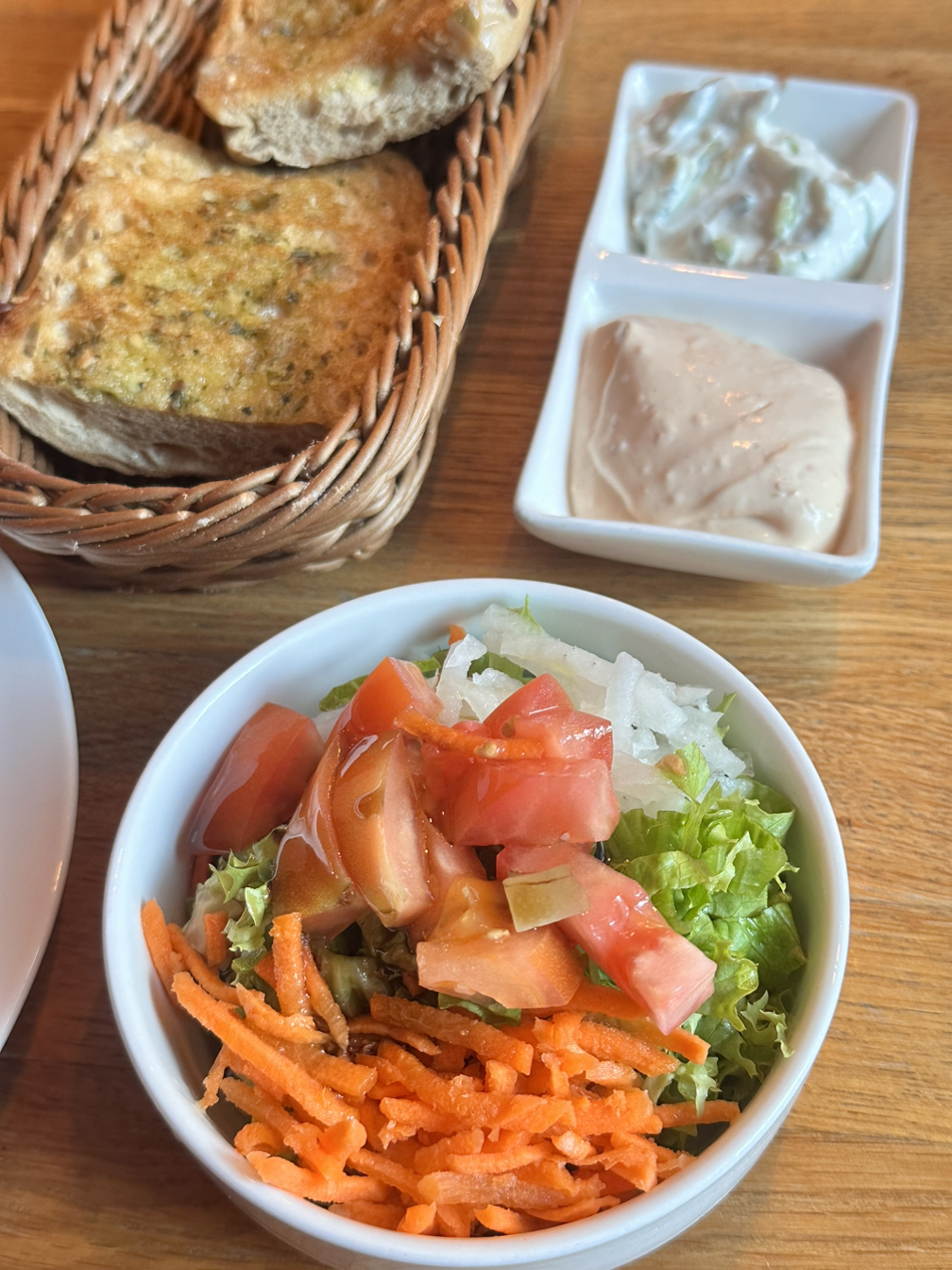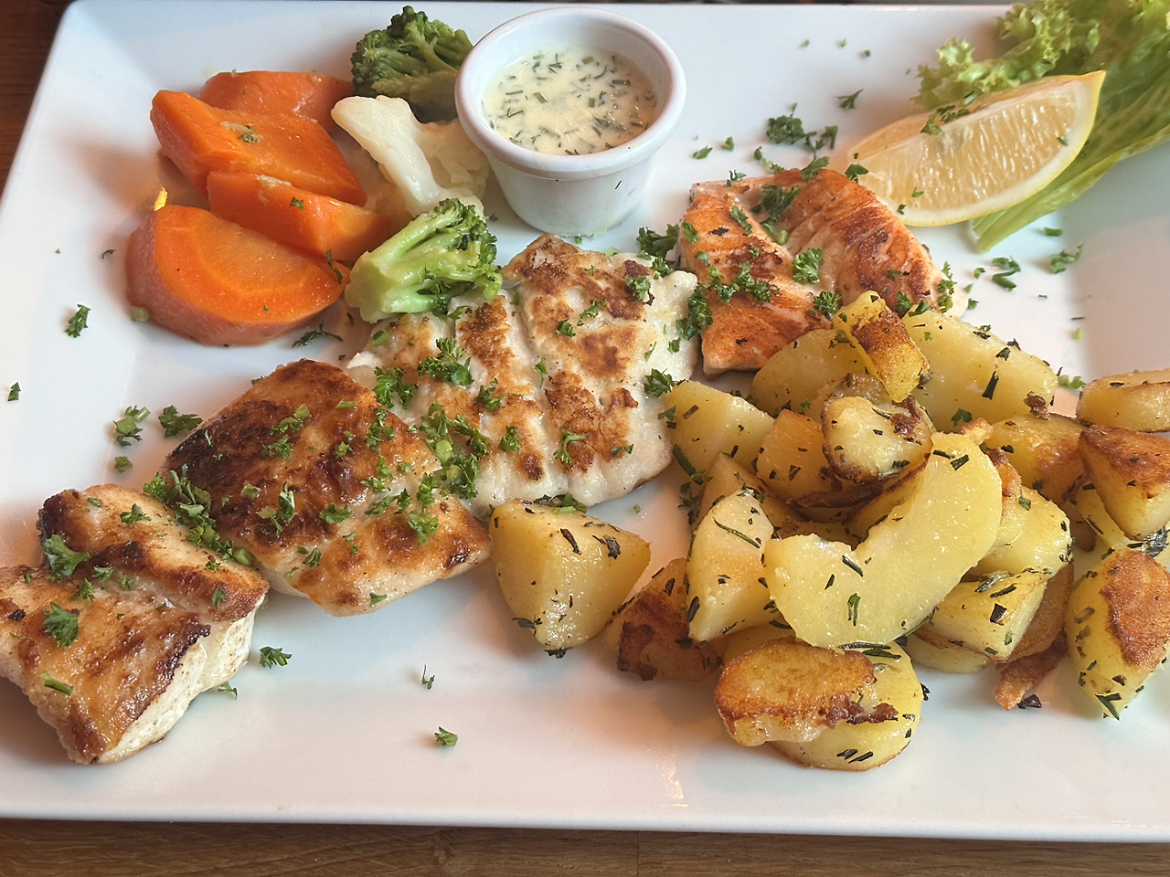 오늘의 마지막 코스는 저녁이다. 함부르크에 먹으러 온 게 아닌가 싶을 정도로 가고 싶은 식당이 많았다 그중에서도 나의 원픽인 해산물 집에 갔다. 여기 해산물은 대부분 굽거나 튀겨서 먹는다. 나는 한국에서 회를 가장 좋아했는데 여기서 회는 찾기 어렵다. 한국에 가자마자 부산부터 가야겠다. 내가 고른 식당은 리뷰가 좋았다. 음식을 파는데 Google 리뷰가 4.9점이라니! 가서 대표 메뉴인 모든 생선구이를 주문했다. 특이하게 곁들여 나오는 감자 요리를 고를 수 있었다. 감자튀김부터 찐 감자 구운 감자 등 다양한 요리가 있었는데 나는 그중에서 로즈메리와 함께 구운 감자를 골랐다. 소스도 골라야 했는데 직원 분에 추천대로 선택했다. 메인 요리가 나오기 전에 샐러드부터 나왔는데, 샐러드를 원래 좋아하기도 하고 신선한 채소가 먹고 싶어서 허겁지겁 먹기 시작했다. 당근과 토마토 오이 상추? 등이 들어간 샐러드였는데 소스가 상큼해서 에피타이저로 훌륭했다. 빵도 함께 나왔는데, 배불러서 먹지는 못했다. 생선과 곁들일 소스와 차지키 소스도 함께 나왔다. 샐러드를 먹다 보니 생선이 나왔다. 4종류의 생선이 나왔는데, 기대감을 안고 흰살생선부터 먹기 시작했다. 처음 한 입 먹은 생선은 감동의 맛이었다. 이런 맛이라서 리뷰가 4.9점이구나가 납득이 되는 맛이었다. 보통 생선의 비린 냄새를 없애기 위해 소금 간을 많이 해 생선구이가 짠 경우가 많은데 전혀 짜지 않고 오히려 삼삼한 간이라서 맛있었다. 그렇게 두껍지 않은 생선인데도 촉촉했고, 겉 부분은 살짝 바삭해서 맛있었다. 여기는 할머니표 생선구이를 이어 인생 생선구이가 되었다. (안타깝게도 엄마가 구워주신 생선보다... 맛있었다......) 안성재 셰프님이 오시면 간이 타이트하고 익힘 정도가 이븐하다고 합격 주실 맛이었다. 생선이 식어서 맛이 덜해질까 봐 핸드폰도 보지 않고 전투적으로 먹었다. 생선에 곁들여 먹는 채소도 나왔는데, 브로콜리랑 당근을 소스에 찍어 먹으니까 맛있었다.
