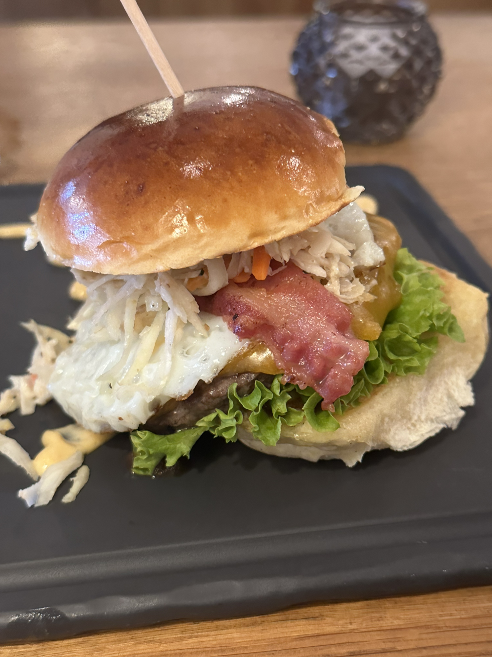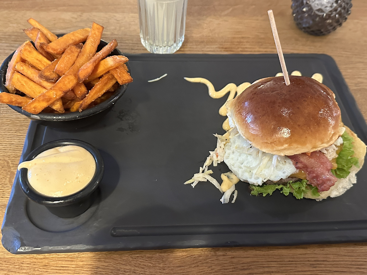 결국 10분 정도 책을 읽고 기차에서 내려서 햄버거 집으로 향했다. 처음 안 사실이었는데 함부르크가 햄버거의 본고장이라고 한다. 그래서 함부르크를 영어로 쓰면 Hamburg인데, 햄버거를 영어로 쓰면 Hamburger가 되는 것이다. 그래서 유명한 체인점도 많았는데 나는 언니가 추천해 준 햄버거 집에 갔다 가서 테이블을 안내받고 왔는데 옆 테이블에 한국인 분들이 계셨다. 예상치 못한 곳에서 만난 한국인이라 그런지 반가웠다. 미니 버거에 튀김 티핑 소스 그리고 음료수까지 나오는 세트로 시켰다. 햄버거는 리뷰에서 본 파머스 버거라는 것을 시켰고 튀김은 고구마튀김이 유명하다길래 주문해 봤다. 소스는 선택인 줄 몰랐는데 직원 분이 추천해 주신 여기만의 특제 마요네즈로 고르고 음료는 사과 탄산으로 골랐다. 기다리면서 만드는 모습을 구경할 수 있었는데, 오픈 키친인데 이렇게까지 깔끔한 햄버거집을 처음 봐서 신기했다. 패티도 바로바로 구워주시는 것 같고 심지어 익힘 정도도 정할 수 있었다. 마음 같아서는 익 힘 정도를 타이트하게 부탁드리고 싶었지만 참고 미디엄으로 주문했다. 그렇게 나온 햄버거 세트는 평범하게 생겼다. 고구마튀김이 맛있어 보이고 마요네즈가 주황빛을 띠고 햄버거가 실해 보이는 정도? 햄버거부터 잘라서 먹어 보니 괜히 햄버거의 본고장이 아니었다. 위에 코울슬로가 들어가 있었는데 강한 맛이 아니라 약간 새콤한 맛이라 버거와 조화로웠다. 계란의 부드러움과 타이트한 익힘 정도의 패티, 아래 있는 채소가 정말 맛있었다. 원래 햄버거를 좋아하지 않지만 여기는 인생 햄버거 집이 되었다. 고구마튀김도 달달하고 고소하게 맛있었고 마요네즈도 평범한 듯 특별했다.