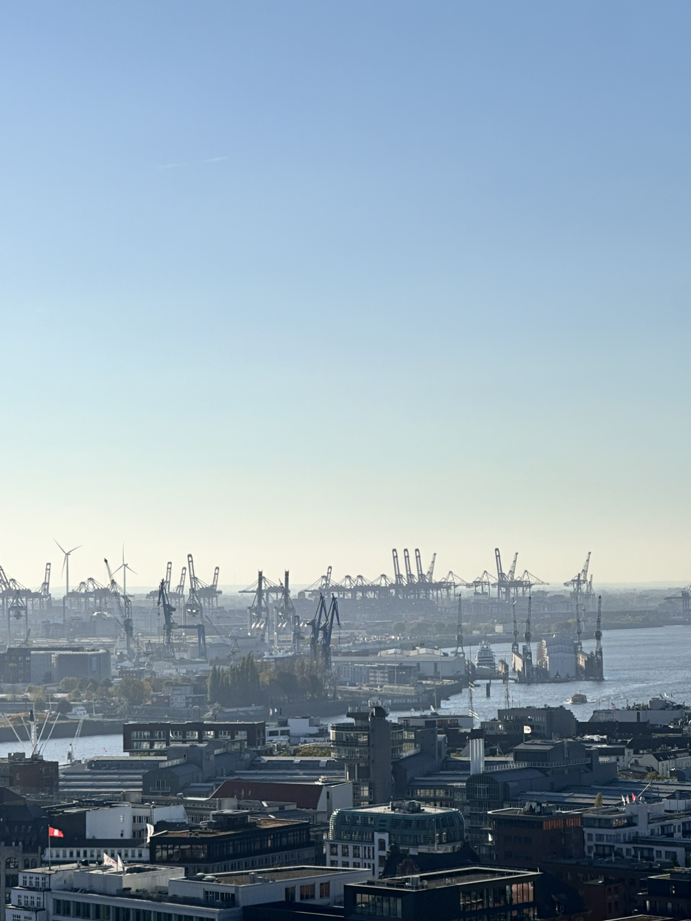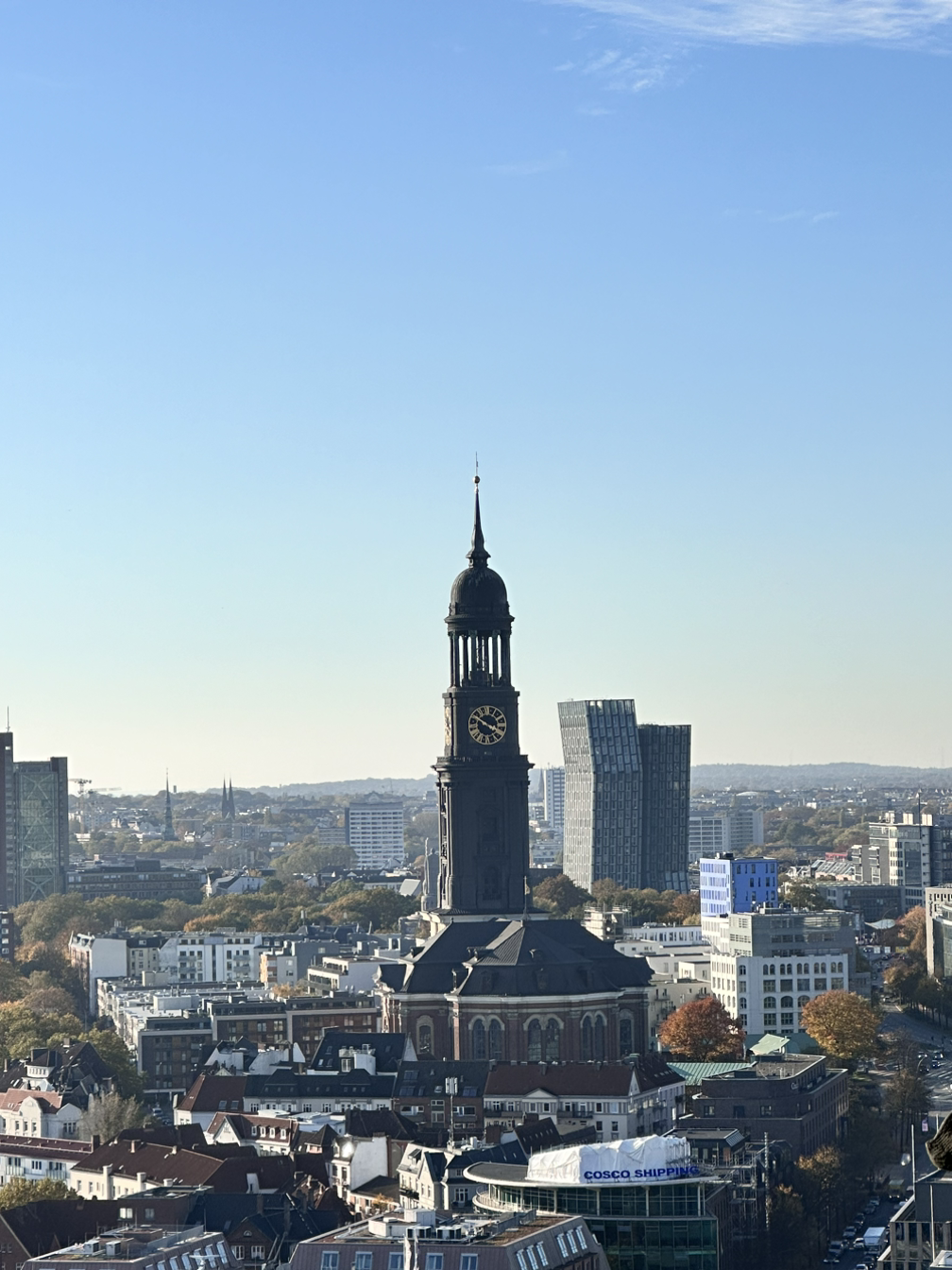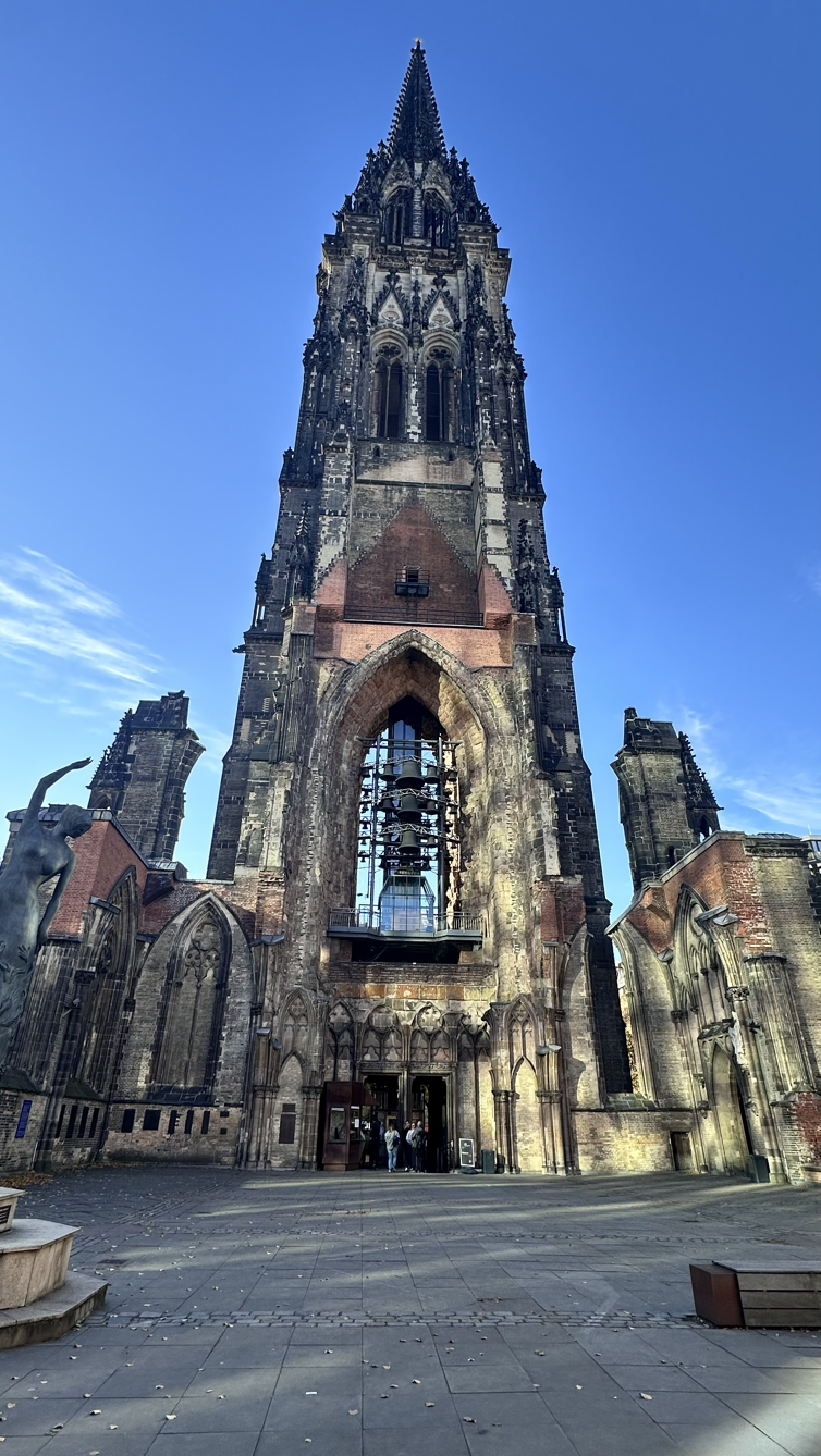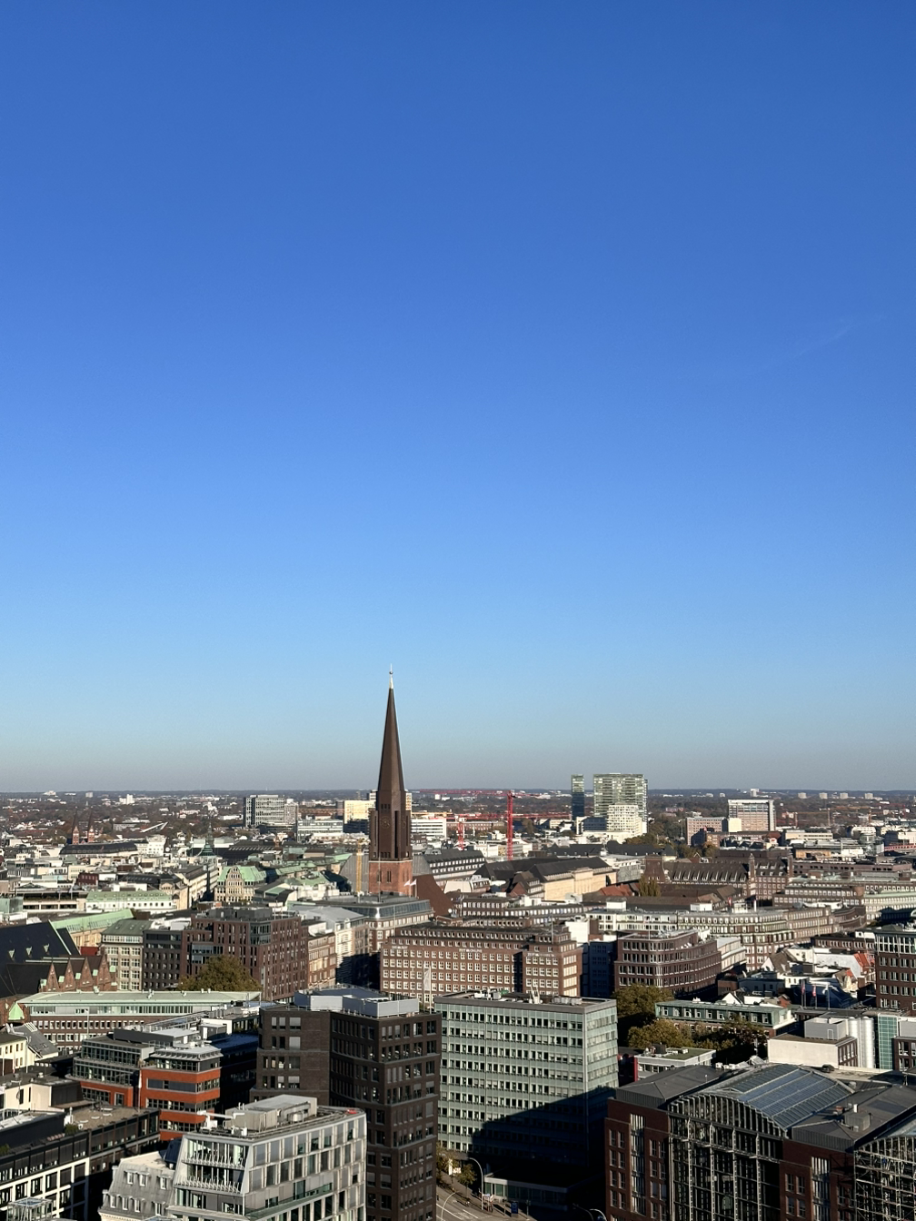 다음으로는 성 니콜라이 교회에 왔다. 이 차세계대전 때 공습으로 파괴된 교회라는데, 불탄 흔적과 잔재가 공존하는 모습이 신기했다. 전망대에 올라갈지 고민하다가 다른 교회에 갈 시간이 부족할 것 같아 이 교회에서 전망대까지 올라가기로 했다. 사실 교회라고 하기에는 예배당도, 안에 아무것도 없어서 (구) 교회라고 하는 것이 더 적절한 건물이었다. 건물의 중앙을 관통하는 엘리베이터를 타고 꽤 높이 올라가서 내렸더니 함부르크 시내 전경이 다 보였다. 웬만한 시계탑이나 건물보다 훨씬 높이 올라가서 시청을 포함한 시내 전체 그리고 호수까지도 볼 수 있었다. 360도 뷰가 있었는데, 고개를 돌릴 때마다 다른 풍경이 펼쳐져서 행복했다. 함부르크의 분위기에 빠진 것 같다. 유럽의 항구 도시답게 antique 한 건물과 호수의 조화가 묘하게 끌린다. 각기 다른 뷰에서 사진도 찍고 더 보고 싶었지만 바람이 너무 많이 불고 추워서 내려올 수밖에 없었다.