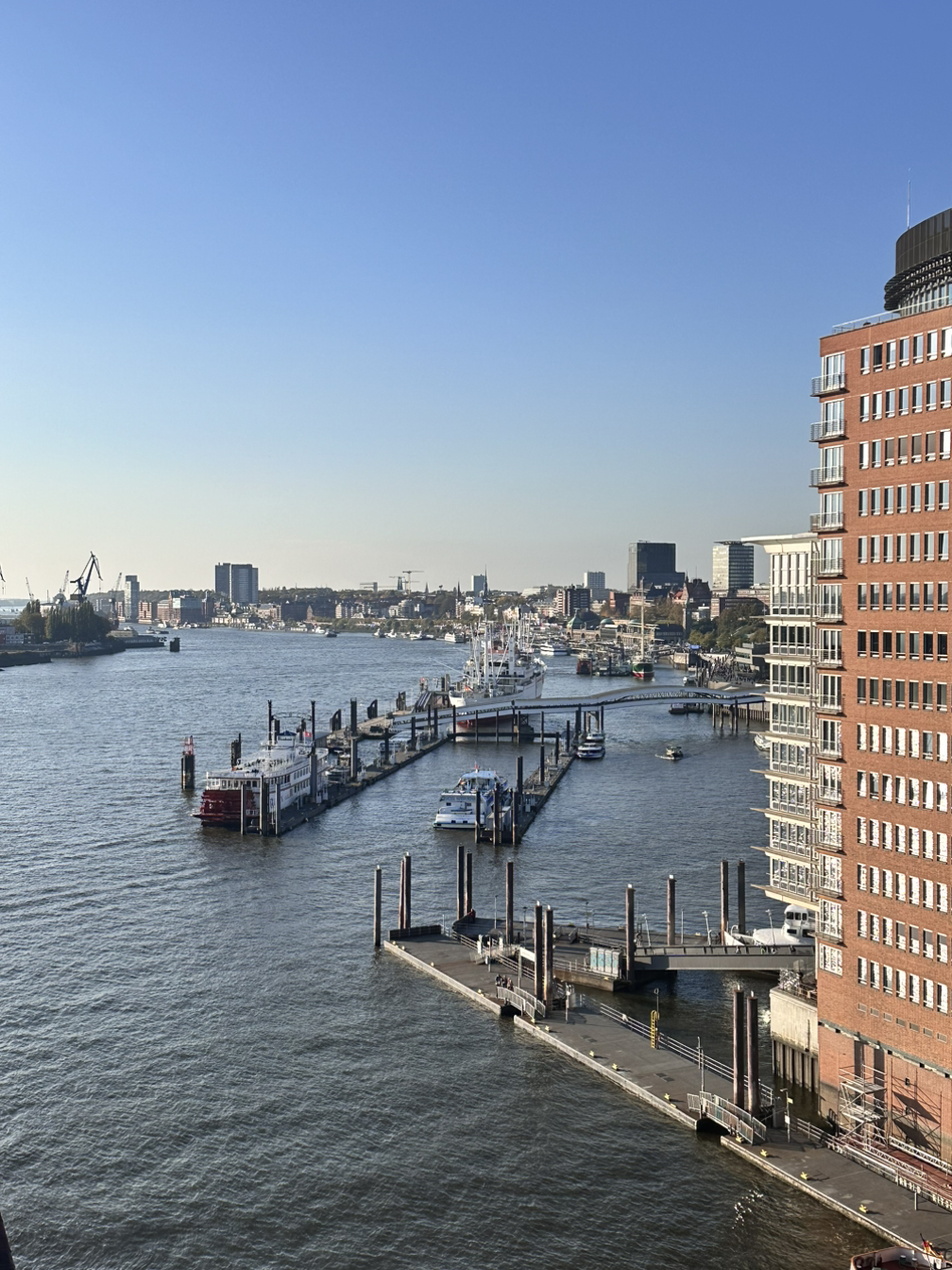 그렇게 왕복 1시간의 여행을 마치고 향한 곳은 엘브필하모니 건물이다. 원래는 우리나라 예술의 전당과 같은 공연장이지만 전망대로도 유명한 랜드마크이다. 입장권을 받아서 올라가니 함부르크의 시내 그리고 항구까지 한눈에 들어왔다. 360°를 돌아보며 이번 여행을 추억했다. 성 니콜라이 교회부터 시청 등 어제 간 명소들과 오늘 갔다 온 항구까지 보이니 벌써부터 아련해지는 기분이었다. 교회를 보고 어제 엘리베이터를 타고 올라가 본 시내 광경도 생각나고 시청을 보니 가운데 있던 동상도 생생하게 생각났다. 오고 가는 길에 버스킹 하는 사람도 많았는데 이런 게 함부르크의 매력인 것 같다. 한 단어로 정의하기는 어렵지만 예술적이고 투박한 듯 고풍스러운 건물들 그리고 넓게 펼쳐진 항구까지 매력적인 도시인 것 같다.