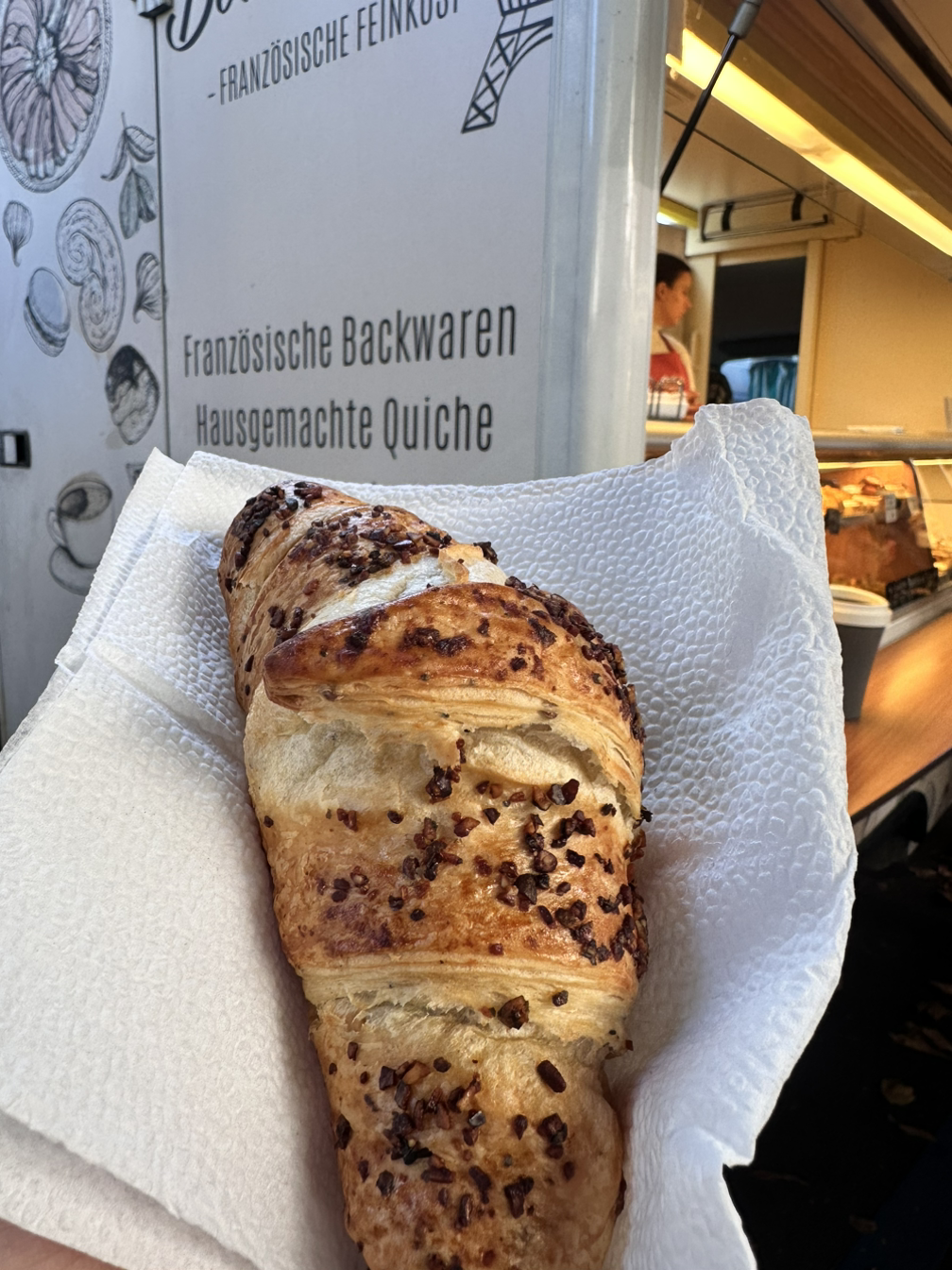 Dm에서 출력을 무사히 마치고 isemarkt라는 곳에 가고 있다. 원래 시장 구경을 좋아하는데, 이 시장은 일주일에 2번만 여는 시장이라고 그래서 가보고 싶었다. 지금 밖에서 초입에 들어왔는데, 벌써 기대가 된다. 상점도 많고 먹거리도 많아 보인다. 야무지게 구경해야겠다. 항구 도시답게 해산물부터 독일의 자랑 소시지, 빵 그리고 기본적인 채소나 정육 등 다양한 음식이 있었다. 목도리나 장난감을 파는 가게도 있고, 푸드트럭도 많았다. 타코나 주스 아니면 햄버거까지 맛있어 보이는 게 많았다. 여기 근처에 살았으면 이 창이 열리는 날마다 꼬박꼬박 왔을 것 같다. 냄새가 좋아 홀린 듯이 산 피스타치오 크로와상을 먹으며 조금 걷다 보니 사실상 오늘의 방문 목적이라고 할 수 있는 뇨끼집에 도착했다. 수제 뇨끼를 만드셔서 주문하면 원하는 뇨끼를 골라 바로 삶아 원하는 소스에 볶아 주신다. 나는 이것저것 다양한 뇨끼를 골라봤고 소스는 올리브 페스토로 했다. 주문하고 5분 정도 기다리니 접시에 예쁘게 담아 주셨다. 옆에 있던 테이블에서 먹어 보니 특별한 맛이었다. 하나하나 다른 뇨끼에서 정성이 느껴졌다. 특히 뇨끼마다 안에 있는 페스토의 종류가 다른데 모두 다 잘 어울리고, 뇨끼도 부드러우면서 쫀득해서 맛있었다. 먹는데 배불러서 1개 정도 남기고 다시 시장 구경을 나섰다. 평일인데도 사람이 많았는데, 치즈 집이나 카페에 사람이 특히 많았다. 맛있어 보이는 음식도 많아서 더 먹고 싶었지만 배불러서 먹지 못 했다. 시장이 생각보다 규모가 커서 꽤 오래 구경을 하고 가고 싶었던 카페 갔다. 함부르크는 항구 도시라서 예전부터 커피 원두가 활발하게 거래되던 곳이라고 한다. 그래서 카페 가고 싶었는데 오늘 드디어 왔다.