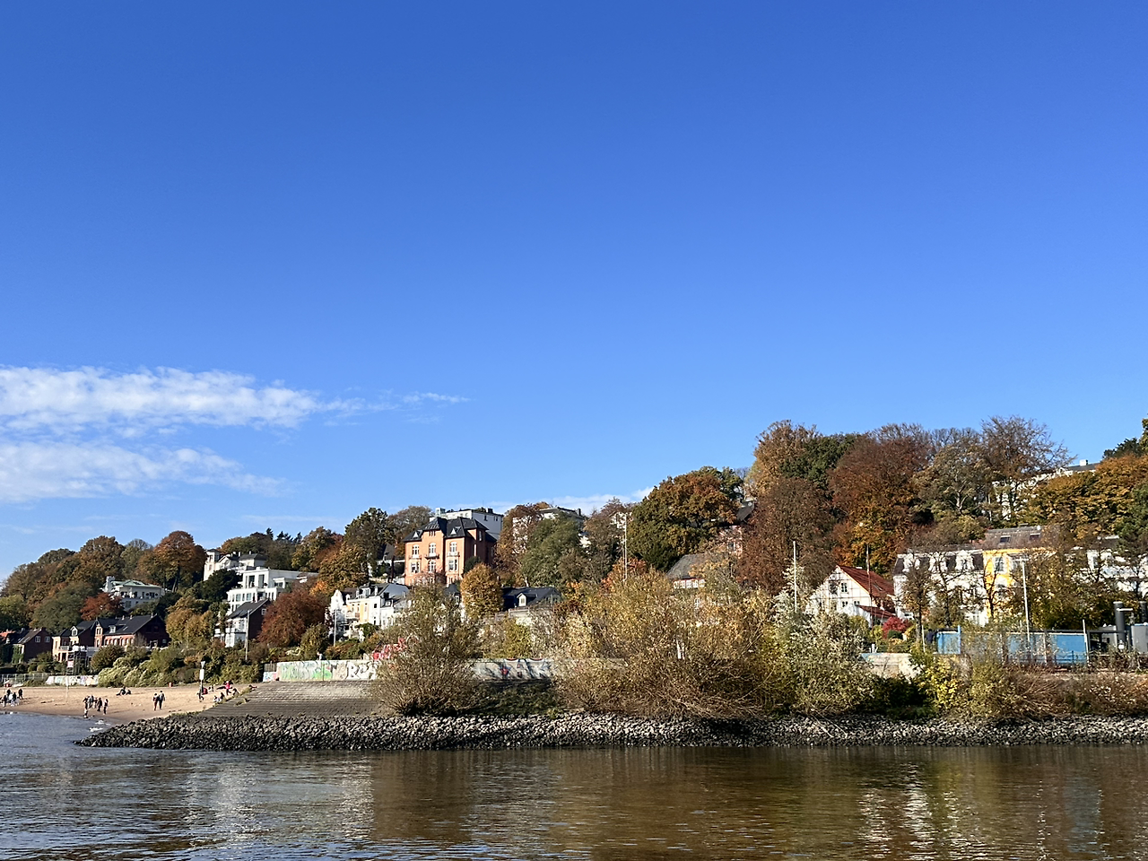 카페를 떠나 향한 곳은 페리 탑승장이다. 항구 도시만큼 배를 타보고 싶었는데 함부르크는 페리가 교통수단이라서 내가 가진 티켓으로 탈 수 있었다. 30분 정도 걸리는 노선이 가장 유명해 나도 그 노선에 탑승했다. 후기를 찾아보니 중간에 해변마을이 있다고 해서 15분 정도 타다가 내려봤다. 푸른 바다와 빼곡한 나무, 그리고 아기자기한 집들이 모여있어서 조화로웠다. 산책을 하고 싶었지만 운동화를 신어서 모래 위를 걷기 힘들었다. 그래서 구경만 잠깐 하고 다음 페리에 바로 탑승했다. 페리를 타고 15 분에 달려 종착지 도착했다. 종착지 있지만 구경할 건 많이 없다고 해서 다시 돌아가는 페리에 앉아 있었다. 오늘 날씨가 너무 좋아서 밖을 바라보고만 있어도 기분이 좋아졌다. 평소에는 바람이 많이 불어 이층에 앉아 있기 힘들다는데 오늘은 가을인데도 바람이 많이 불지 않아 행복하게 강 위를 즐길 수 있었다.