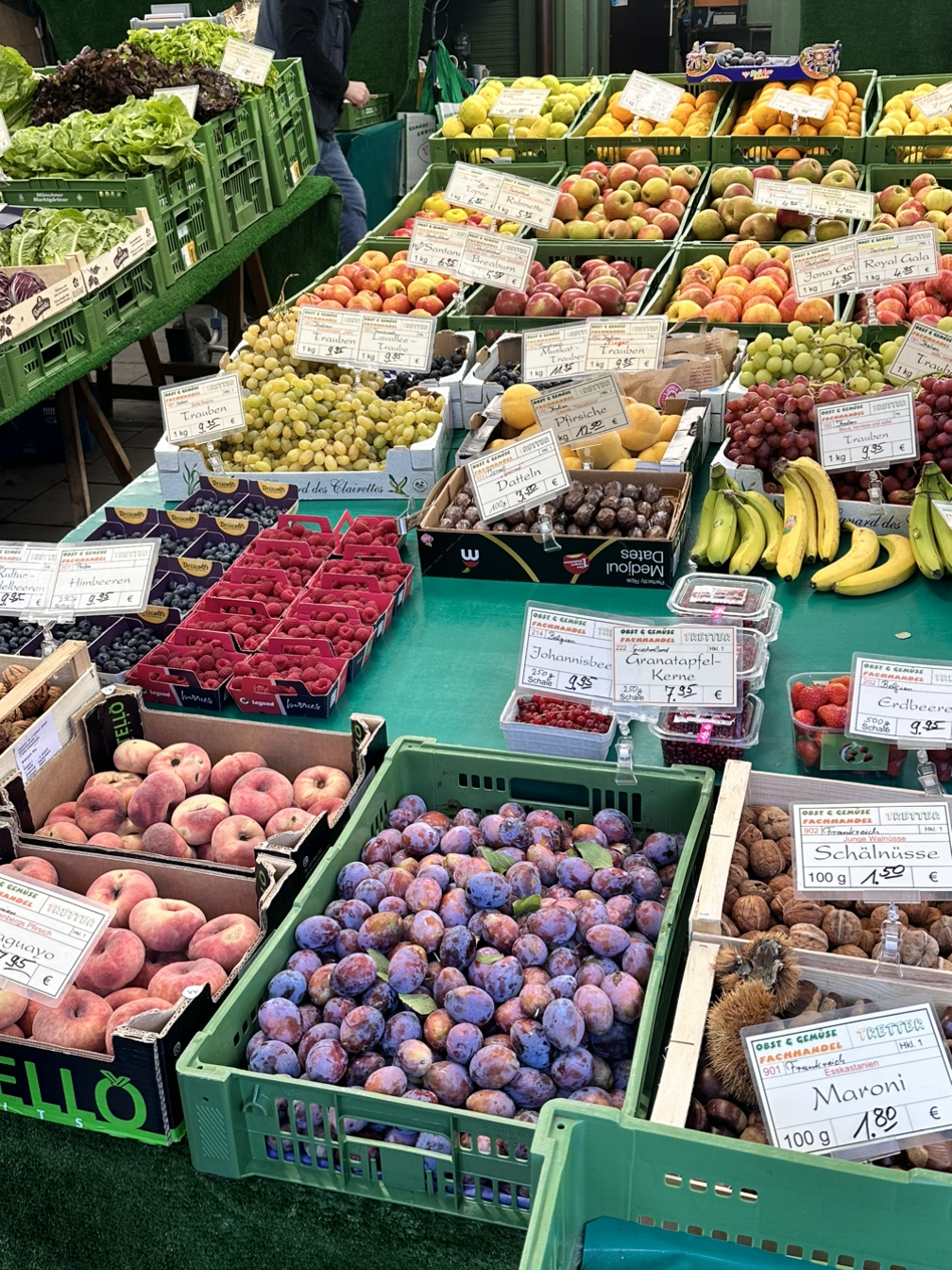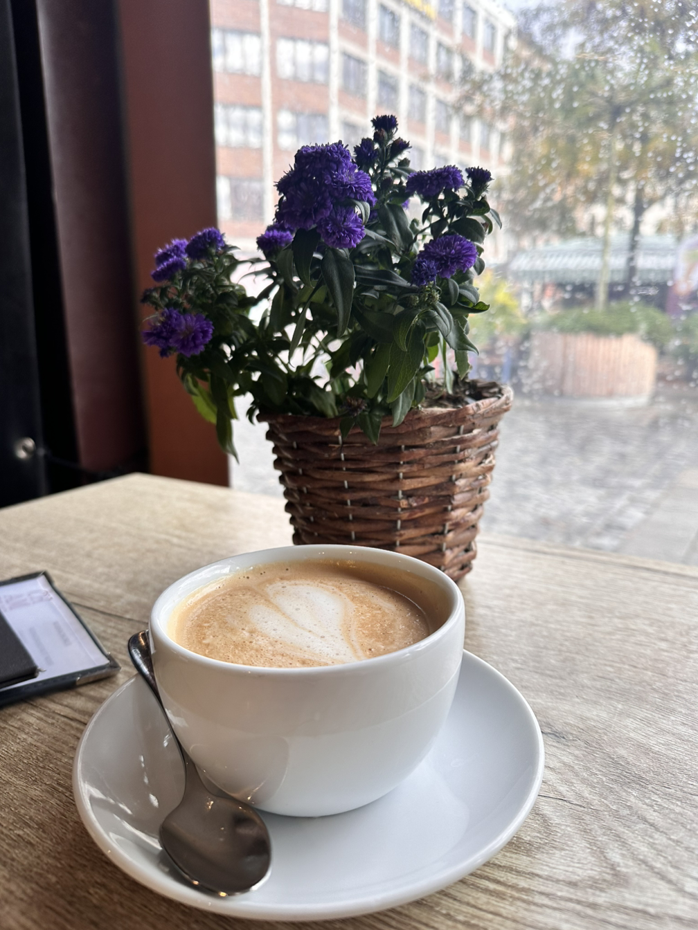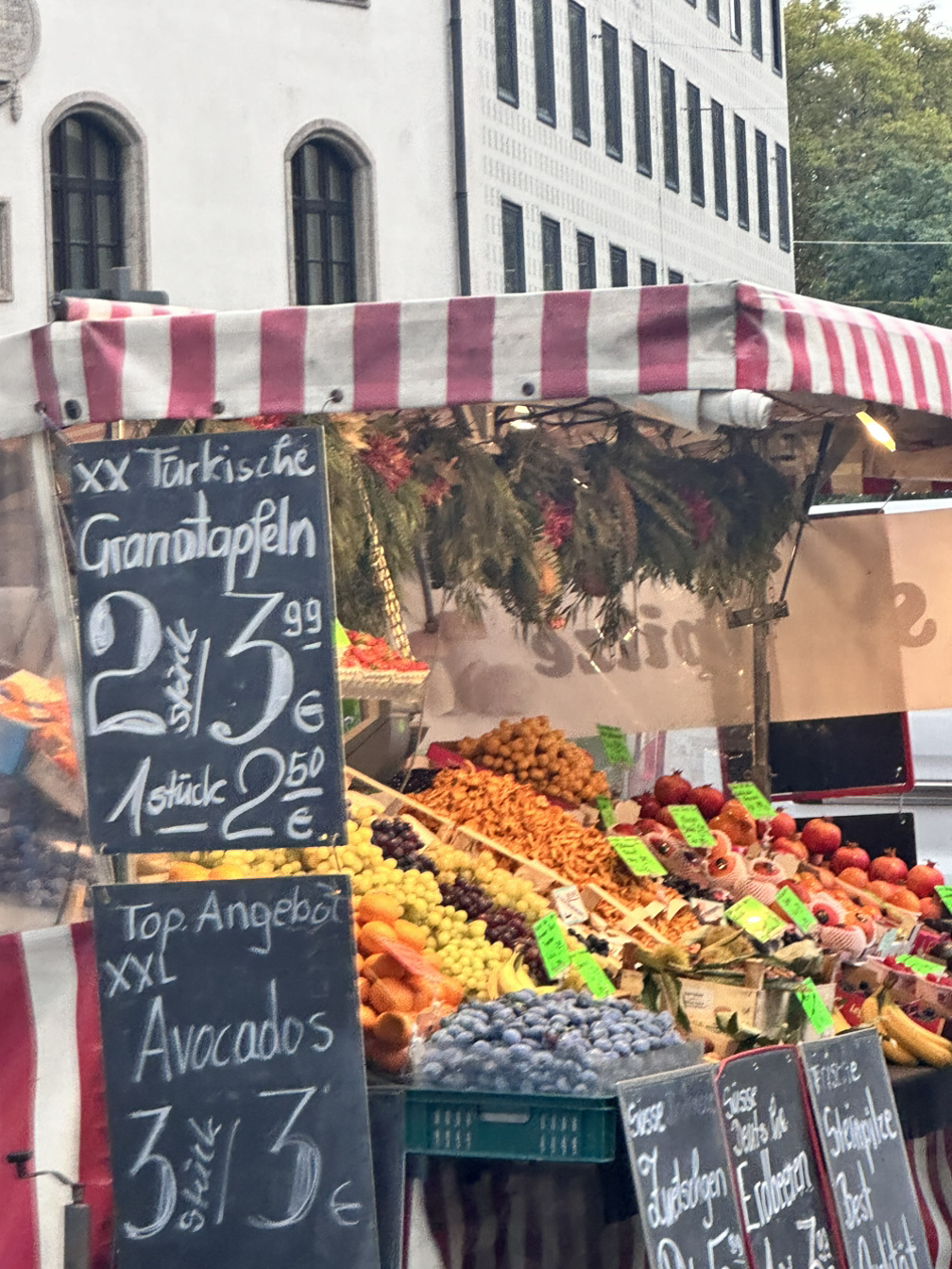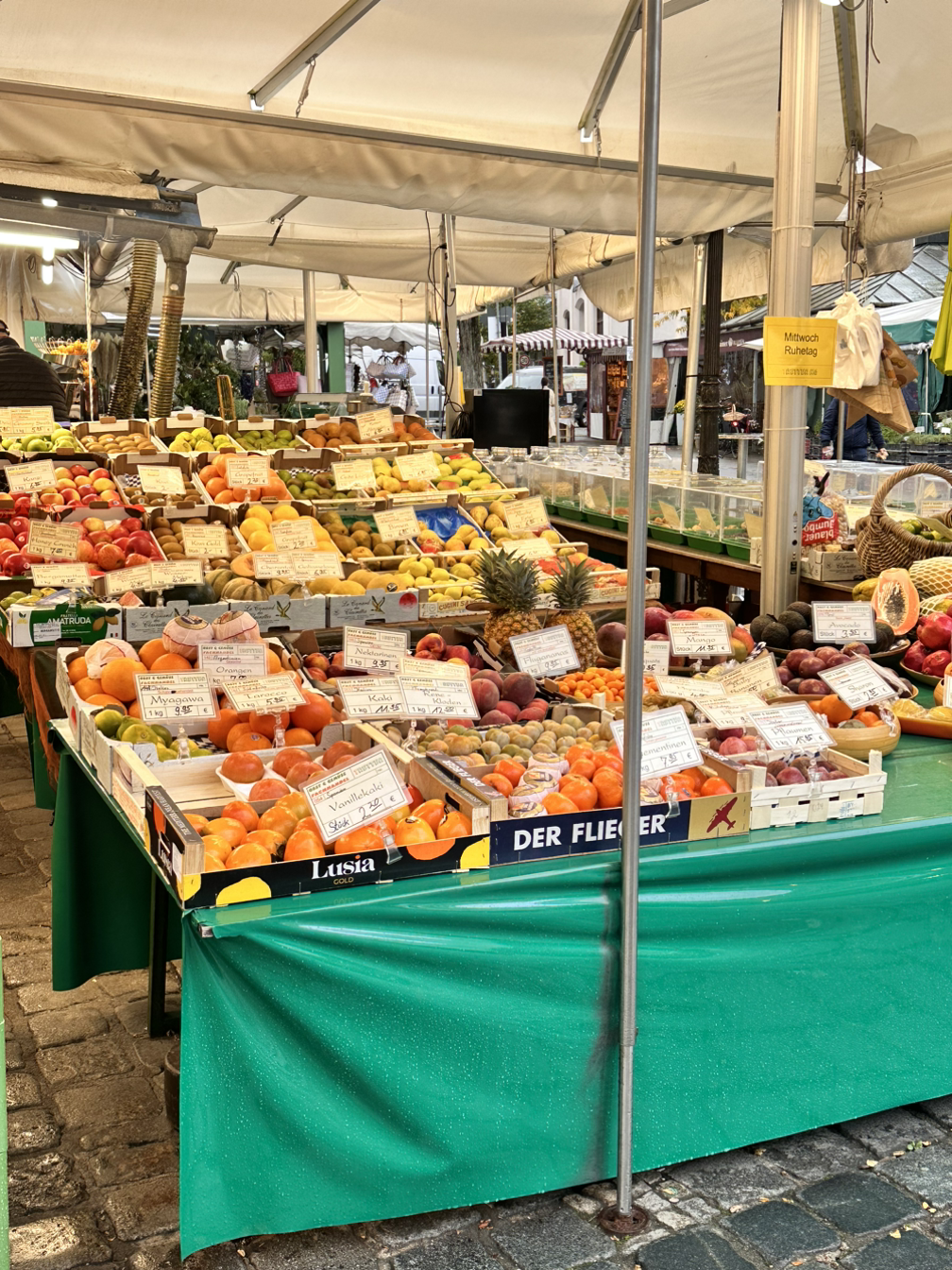 자유로운 구경을 마치고 향한 곳은 빅투알리엔 마켓이다. 200년 된 시장이라고 들어서 꼭 구경을 가보고 싶었는데 마침 집에 과일이 사고 싶어서 구경도 하고 과일도 사러 갔다. 우리나라의 정신없는 시장을 생각하고 갔는데, 평일 오전이라서 그런지 전체적으로 차분한 분위기였다. 그리고 생각보다 다양한 품목이 있지는 않고 와인과 맥주를 비롯한 술, 고기와 소세지의 정육점, 채소와 과일을 파는 농산물 가게, 각종 소스류를 파는 가게가 주를 이뤘다. 나는 과일만 노리고 있었고 그중에서도 납작 복숭아가 먹고 싶었기에 원하는 가게를 찾는 것은 쉬웠다. 남작복숭아 3개와 그냥 복숭아 2개 총 9유로의 과일을 구매했다. 과일을 구매하고 더 돌아보려고 했지만 생각보다 적은 품목과 추운 날씨로 인해 계획의 수정이 필요했다. 근처에 있는 카페를 갈지 시장 안에 천막처럼 있는 카페를 갈지 고민하다가 특색 있는 시장 내의 카페로 향했다. 자리에 앉아서 따뜻한 라떼 한 잔을 주문하고 보니 풍경이 아름다웠다. 앞에 놓인 보라색 꽃 화분, 여유롭게 산책하는 사람들 그리고 청명한 하늘까지 내 눈에 들어오는 풍경이 그림 같았다. 그렇게 카페에서 여유도 즐기고 점심 메뉴도 찾아보고 만족스럽게 카페를 나섰다.
