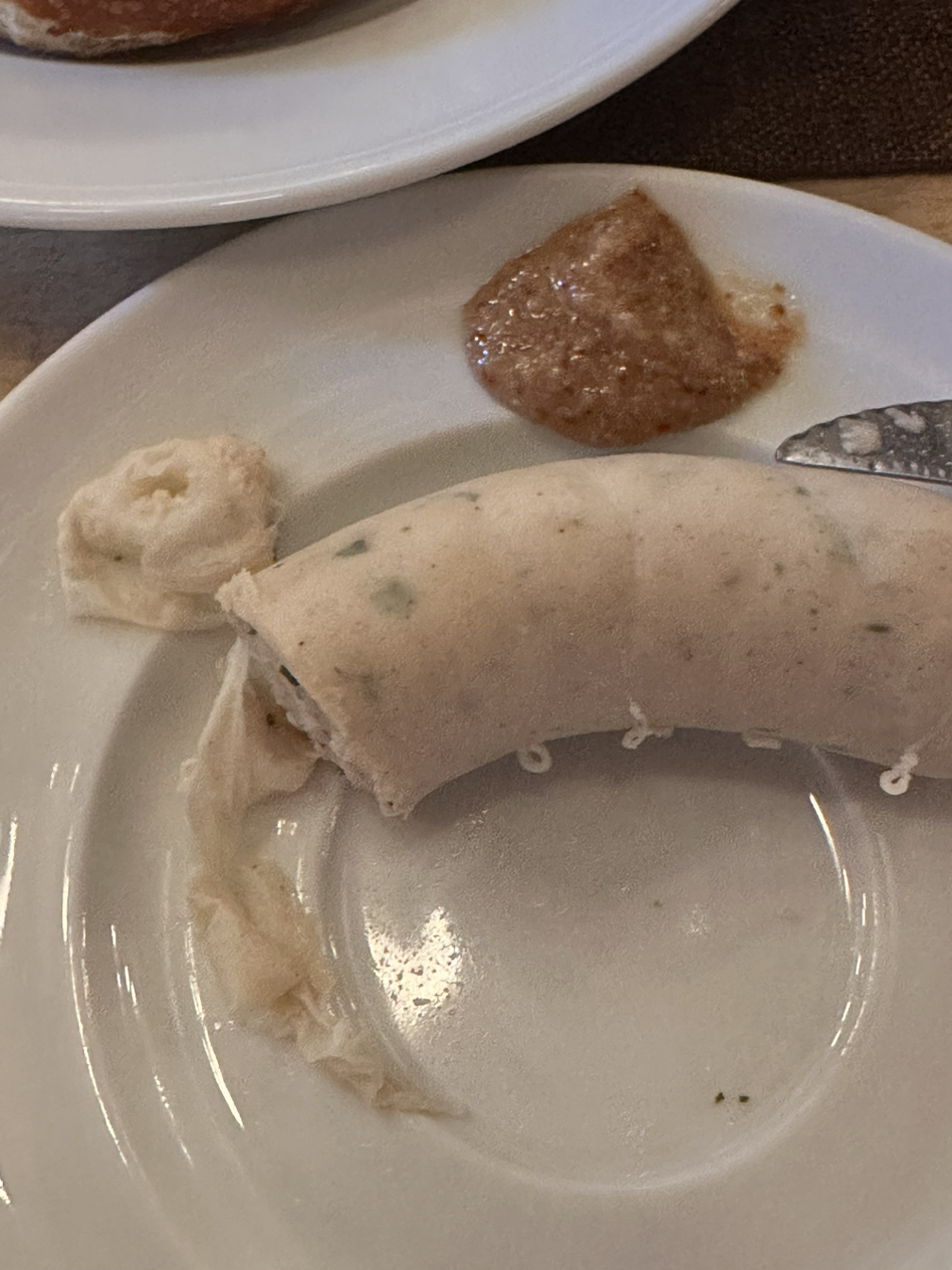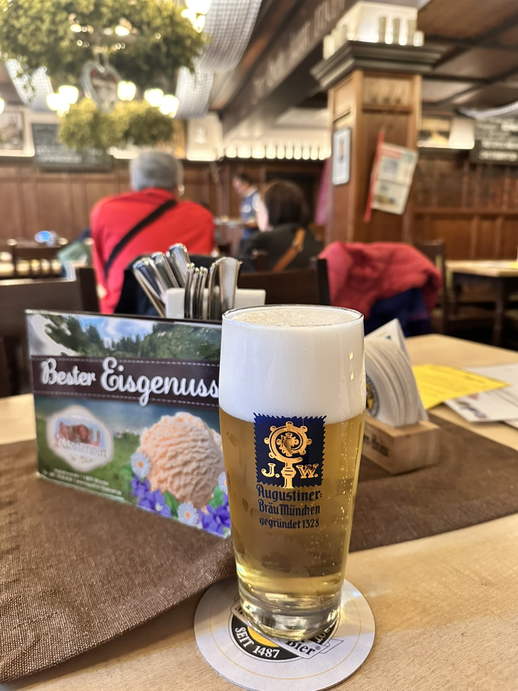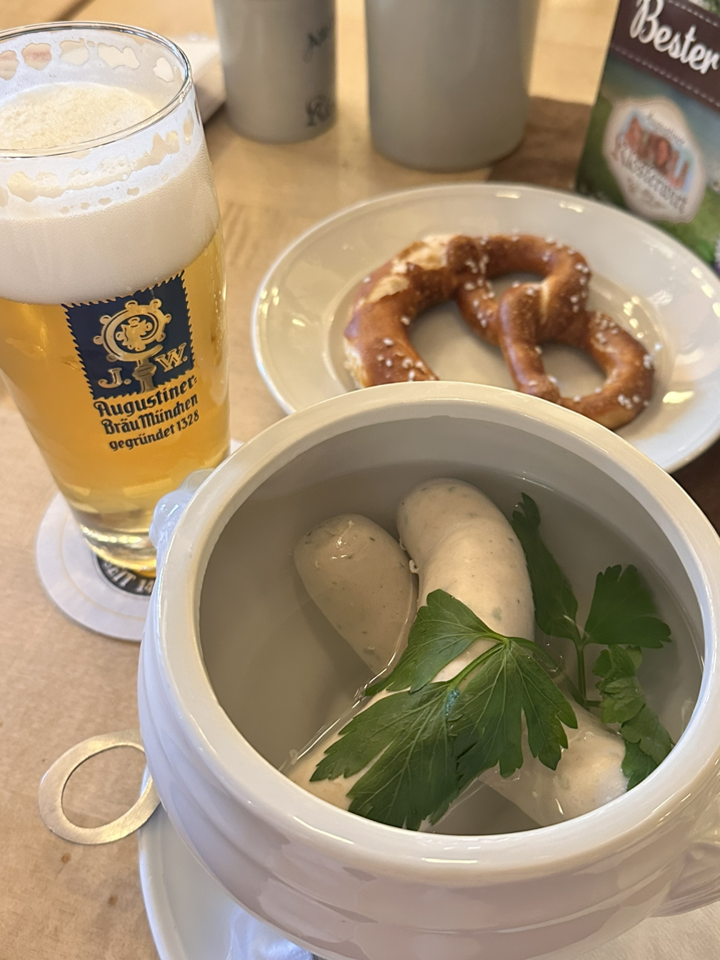 고심 끝에 고른 식당은 Augustiner Klosterwirt였다. 아우구스티너는 뮌헨의 6대 양조장 중 하나인데, 처음 밖에서 먹는 식당인 만큼 유명한 식당을 가고 싶고, 맛있는 맥주도 마셔보고 싶어서 양조장으로 골랐다. 가서는 Augustiner Hell from the wooden barrel이라는 대표 생맥주와 Munich white sausage, 그리고 프레첼 하나를 주문했다. 대형 비어홀이라 그런지 음식은 빨리 나왔다. 맥주부터 한 모금 마셔봤더니 역시 맥주의 나라 독일다운 맛이었다. 시원한데 깔끔하게 넘어가고 청량감도 느껴져서 정말 맛있었다. 화이트 소세지는 특이하게 쪄서 나왔다. 물에 동동 떠서 나온 비주얼에 처음은 조금 당황했다. 사실 냄새도 약간 이상해서 뭐지..? 싶었다. 이 화이트 소세지는 특이하게 껍질을 벗겨서 먹어야 되는데, 한 입 먹어보니 인생 소세지였다. 삶아서 그런지 담백하고 다양한 재료가 조화롭게 어울리는 맛이었다. 소세지의 익힘 정도도 타이트하게 맛있었다. 그리고 머스터드라고 큰 통을 주셔서 접시에 덜어봤는데, 색이 이상했다. 약간 껍질까지 넣고 만든 수제 사과잼의 색깔이라서 처음에는 당황했지만 먹어보니 소세지의 나라는 소스까지 진심이구나! 가 많이 느껴졌다. 칼로 잘리지 않아 손으로 먹어야 되는지 고민하다가 마지막으로 먹은 프레첼도 짭짤하게 맛있었다.