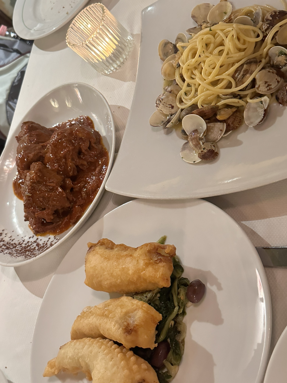 오늘의 마지막 코스는 저녁이다. 소꼬리찜을 찾아 산 식당인데, 가이드분들도 많이 추천해 주시는 식당이라고 한다. 소꼬리찜과 대구 튀김, 그리고 봉골레를 주문했다. 숙소에서 와인을 마실 예정이라서 술은 패스하고 푸파를 시작했다. 처음 식전빵이 나왔는데, 발사믹이 시지 않고 상큼하고 깔끔해서 맛있었다. 소꼬리는 한국에서도 먹어보지 않아서 걱정했는데 토마토소스와 잘 어울렸고 약간 감자탕 느낌도 났다. 대구 튀김은 밑에 채소와 나왔는데, 튀김 자체도 잡내나 느끼함 하나 없이 부드럽고, 밑에 채소도 모닝글로리 볶음처럼 적당한 간이 있어서 생선과 잘 어울렸다. 봉골레는 먹자마자 조개의 깊은 맛이 파스타에 가득했다. 면을 만들 때부터 조개 육수를 넣었나 싶을 정도였고, 한국에서도 오일 파스타를 좋아해 자주 먹었는데 확실히 다르게 느껴졌다. 만족스러운 식사를 마치고 40분을 걸어 민박집에 도착했다. 이제 씻고 글도 쓰고 언니들이랑 와인을 마시려고 한다.
