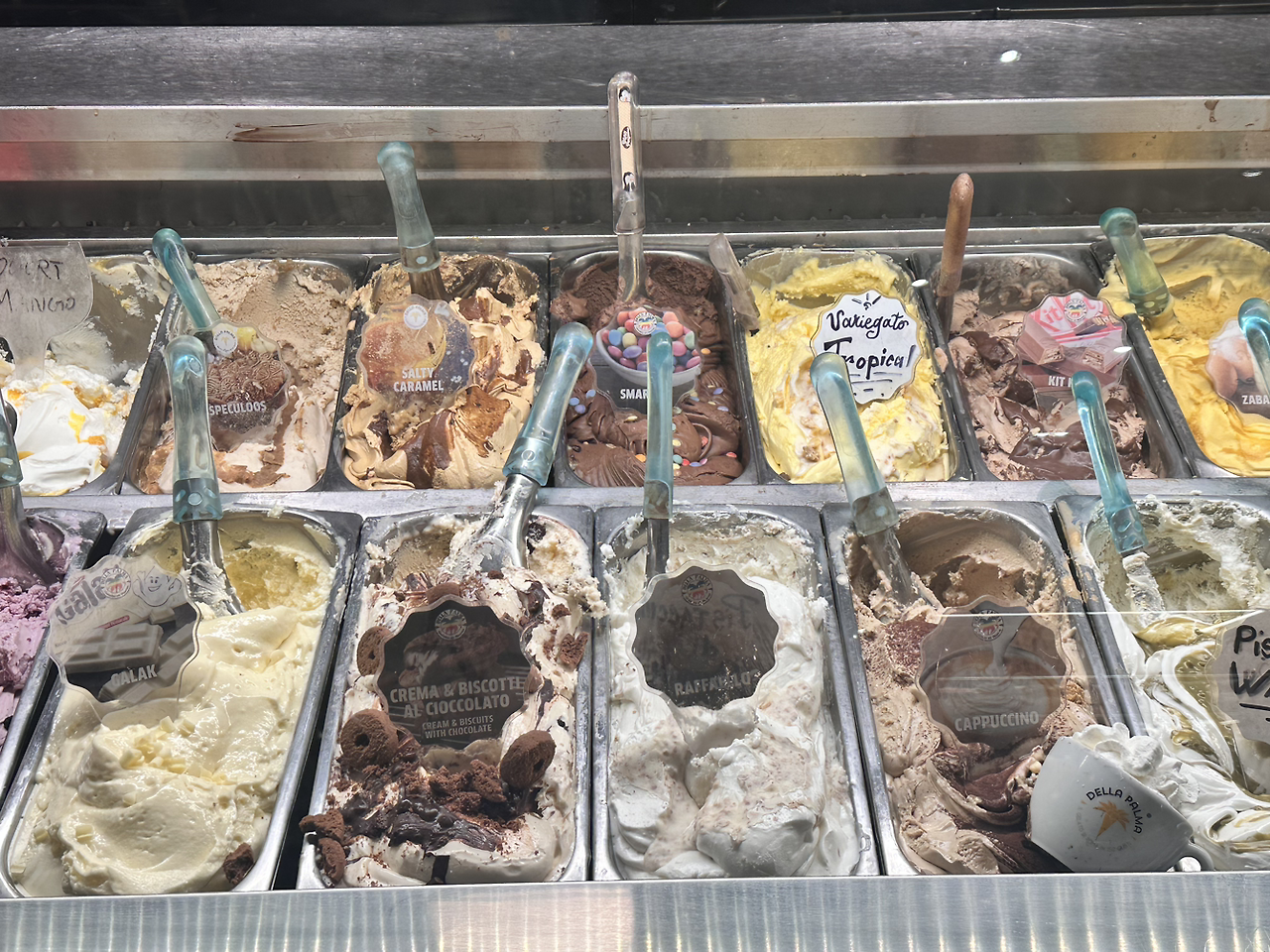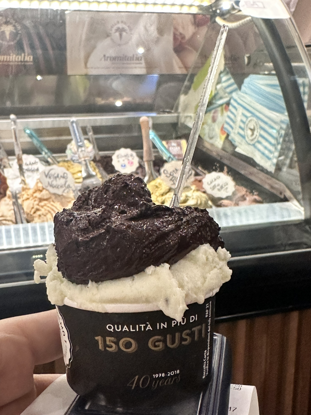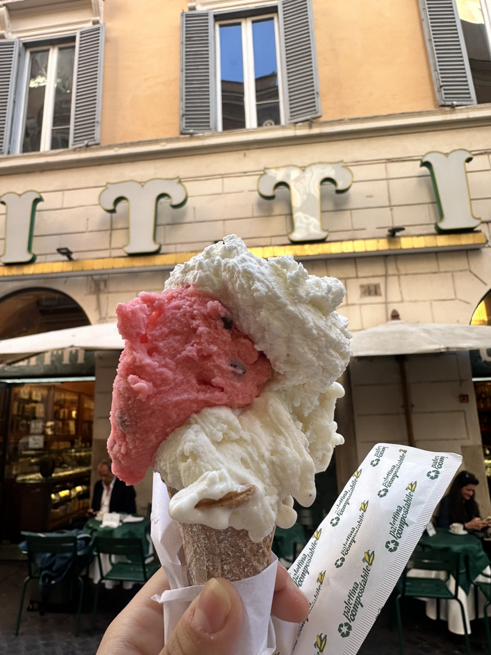 타짜도르에서 나와 젤라또를 먹으러 걸어갔다. 오늘의 젤라또집을 지올리티! 어제의 파씨와 함께 로마의 3대 젤라또 집 중 하나이다. 나는 리조(쌀) 하나만 바라보고 로마에 오기도 했고, 리뷰를 보니 여기 리조가 파씨보다 맛있다는 의견도 있어서 가장 후기가 많았던 리조와 수박으로 주문하고, 위에 크림도 올렸다. 강경 컵파인데, 컵이 생각보다 작아서 콘으로 주문해 봤다. 결론부터 말하자면 파씨가 조금 더 취향에 맞았다. 리조만 놓고 보면 여기의 쌀이 더 부드럽게 씹혔지만 나는 파씨의 쌀 식감을 좋아했고, 파씨의 맛이 더 부드럽고 진해서 맛있었다. 수박은 맛있는 수박을 갈아서 초콜릿 칩을 넣은 맛이었다. 수박 자체는 맛있었지만 초콜릿 칩이 그렇게 맛있지 않았다. 가장 실망한 부분은 크림이다. 어제 크림은 자체로는 살짝 느끼하지만 아이스크림과 조화롭게 어울리고 풍미가 살아났는데 여기는 느끼하기만 해서 단독으로 먹기도, 아이스크림과 먹기도 애매했다. 크림을 빼고 싶었지만 위에 올라가 있어서 빼지도 못하고 먹었다. 그래도 시원하고 당을 충전해 준 젤라또를 먹고 향한 곳은 피자집이다. 먹기만 하는 것 같지만, 나름 사이에 걷기와 시내 구경도 많이.. 했다...