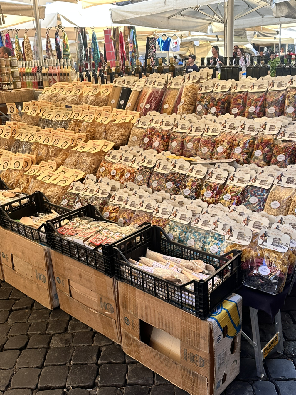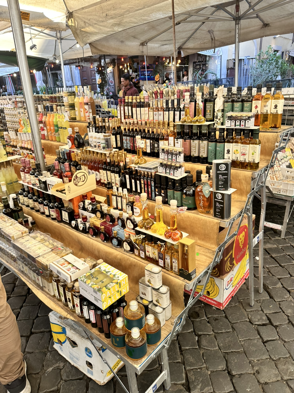 규모는 작지만 알찬 시장이었다. 치즈, 과일, 기념품도 있고 가장 많은 것은 오일과 같은 양념을 파는 상점이었다. 리몬첼로와 같은 술부터 트러플 소금, 발사믹 식초 그리고 올리브오일까지 매대를 가득 채운 상점이 많았다. 시장이라 그런지 호객 행위도 상당했다. Where are you from부터 예뻐요, 카와이 등등 다양한 말을 들었다. 혼자 있는데 호객 행위를 따라가는 게 부담스러워 감사인사만 하면서 지나갔다. 발길을 멈춘 곳은 기념품 상점이었다. 나라마다 소소하게 배지를 모아서 가장에 달고 있는데, 기념품 가게와 다르게 여기는 1유로에 배지를 팔아서 사기로 했다. 로마가 기념품이 가장 저렴하다는 말도 있어서... 한참을 고민하다 마음에 드는 배지 하나를 발견해 구매했다.