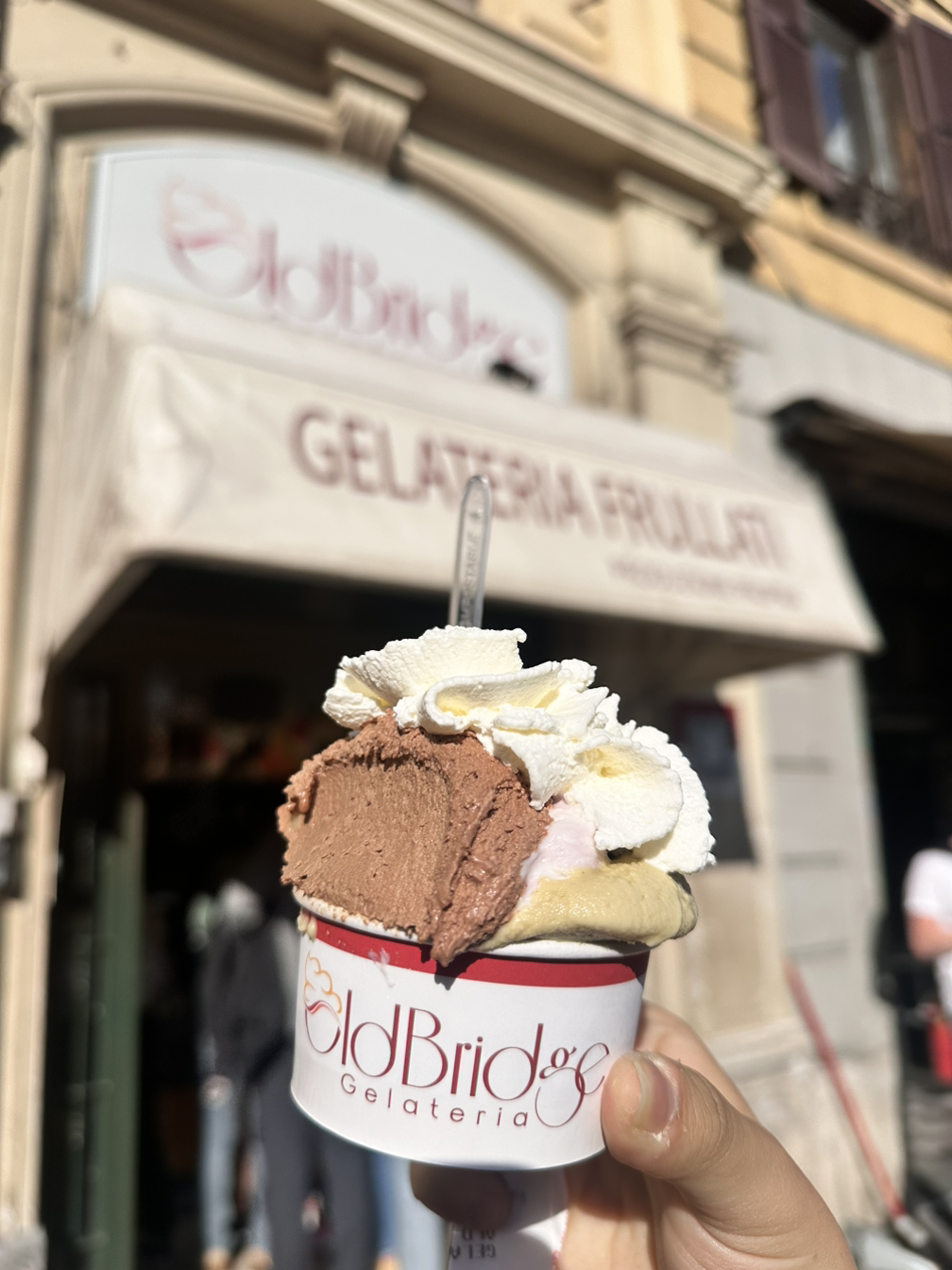 마침 같은 투어를 듣고 나가시는 분이랑 얘기를 하다 밥을 같이 먹게 되었다. 바티칸 근처에 3대 젤라또 집 중 하나인 올드 브릿지가 있어 먼저 갔는데, 리조가 없어 피스타치오와 누텔라, 그리고 블루베리 요거트 맛을 먹었다. 잘 만든 젤라또는 나오자마자 녹는다는데 날씨 때문인지 만드는 기술 때문인지 바로 녹았다. 부드러웠지만, 내가 좋아하는 쫀득함은 별로 없어 아쉬웠다. 이렇게 3대 젤라또를 모두 먹어보았는데, 내 취향은 파씨 > 올드 브릿지 > 지올라띠인 것 같다. 가격은 파씨 < 올드 브릿지 < 지올라띠인데 의외였다.