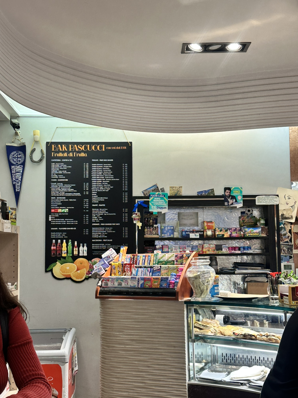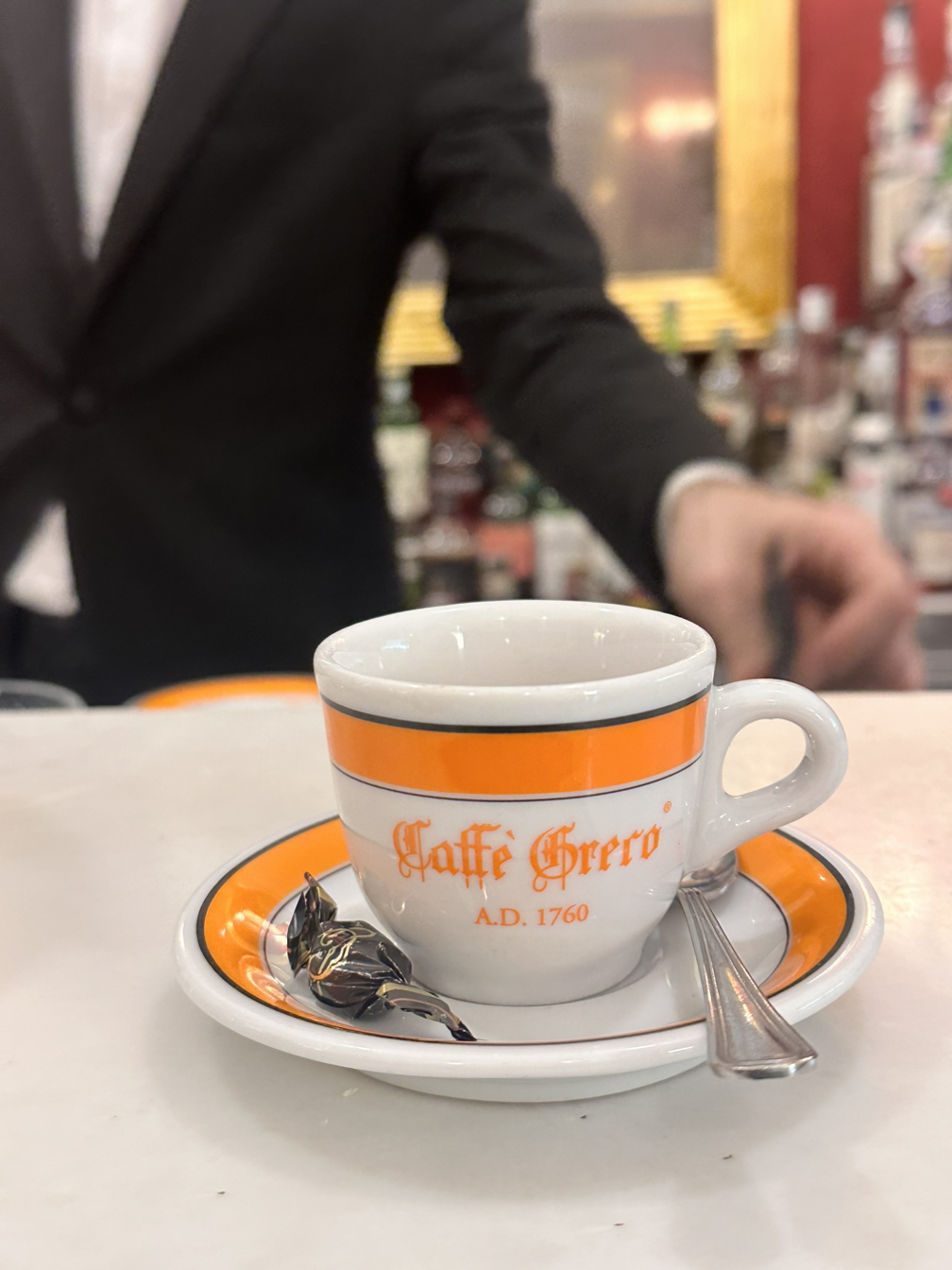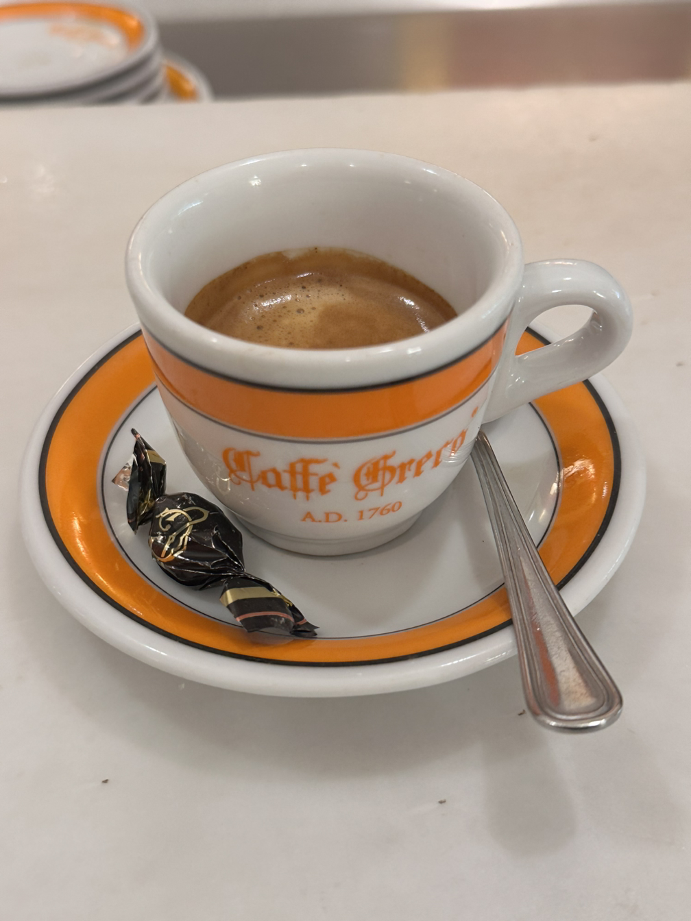 3대 카페 중 마지막인 안티코 카페 그레코로 갔다. 앉아서 먹고 가면 에스프레소가 7유로라니..! 오래된 카페라고 들었는데 분위기가 확실히 고풍스러웠다. 인테리어도, 디저트도 아름다웠다. 다른 3대 카페들은 조금 가벼운 느낌이라면 여기는 전통과 품격이 살아있는 카페였다. 나는 뒤에 친구랑 잠깐 통화를 해야 해서 10분만 있을 수 있어 bar에서 마시는 것으로 주문했다. 나오자마자 향부터 맡았는데, 향은 생각보다 평범했다. 조금 쓴 맛이 있는 에스프레소 같았다. 한 모금 마셔봤는데, 부드러움보다는 액체의 느낌이 강했다. 향도 아메리카노 만들 때 내리는 에스프레소의 향이 훅 들어왔다. 설탕을 타서 마시니 부드러워졌지만, 어제 나에게 충격을 준 부드러움은 크게 느껴지지 않아 아쉬웠다. 그래서 정해본 커피 맛으로만 생각한 3대 카페의 순위는 타짜도르 > 산트 유스타치오 > 안티코 카페 그레코이다. 3대 젤라토에 이어 3대 카페까지 야무지게 가니 뭔가 뿌듯했다.
