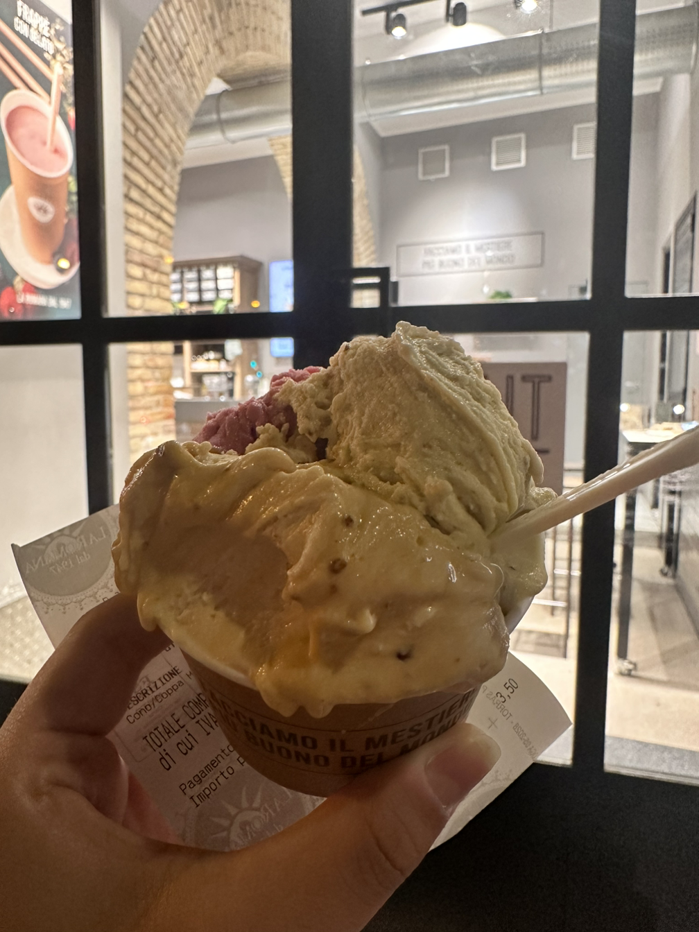 배부르게 먹고 젤라또 가게로 향했다. 민박집까지 거의 50분을 걸어가야 해서 젤라또 하나를 사서 여유롭게 걸어가는 계획을 세웠다. 원래 젤라또를 먹을 계획은 없었는데, 오는 길에 사람도 많고 리뷰도 좋은 젤라또 집을 봐서 그 집으로 향했다. 다른 젤라또집과 다르게 은색 통에 담겨 뚜껑도 닫혀 있어 기대가 되었다. 3가지 맛 중 하나는 피스타치오로 고르고 나머지는 추천을 부탁드렸다. 초콜릿을 좋아하냐고 물어보셨는데 아까 초콜릿 맛을 먹어서 안 좋아한다고 했더니 시나몬을 좋아하냐고 물어보셨다. 좋다고 하니 할로윈 신메뉴로 펌킨 시나몬 맛이 나왔다고 하시면서 맛보기 한 스푼을 주셨다. 호박의 고소함, 달달함 그리고 시나몬의 향이 느껴져 맛있었다. 좋다고 하니 마지막 맛으로는 블루베리 맛을 추천해 주셨다. 특이하게 블루베리에 꽃, 그리고 레몬이 섞인 맛이었다. 오묘하면서 상큼하고 맛있어서 마지막 맛으로 골랐다. 그렇게 야무진 젤라또를 들고 민박집으로 걸어가기 시작했다. 한 입을 제대로 먹으니 감동이 밀려왔다. 한국에서부터 유명한 젤라또집은 꼭 갈 정도로 젤라또를 좋아하는데, 이 집이 내가 찾던 부드럽고 찐득한 맛이었다. 많이 달지도 않고 고유의 맛이 잘 느껴지면서 특이한 맛도 있었다. 블루베리 맛도 부드럽고 밀도가 높았다. 지금껏 과일은 소르베만 가능한 건가 싶었는데 상큼한 젤라또라니 신세계 같았다. 3대 젤라또 다 필요 없는 감동 가득한 맛이었다. 젤라또를 먹느라 시간이 빨리 갔다고 느낄 정도로 행복의 맛이었다. 여기는 정말 인생 젤라또집이다. 그렇게 행복한 귀가를 하고 들어와 씻고 여유롭게 글도 썼다. 이제 책을 읽고 잠에 들려고 한다.