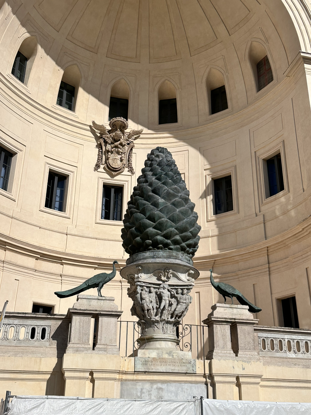 배부르게 먹고 미팅포인트로 향했다. 새벽부터 기다릴 자신이 없어 9시에 시작하는 패스트트랙 투어를 신청했는데, 잘한 선택인 것 같다. 학생할인까지 받아 투어+패스트트랙 입장권으로 10만 원 정도 했다. 9시에 만나 9시 반에 입장을 시작했다. 짐 검사도 하고 입장하니 설레기 시작했다. 첫 코스는 솔방울 정원이다. 솔방울이랑 이런저런 장식물을 보고, 옆에 붙은 사진과 함께 시스티나 성당의 소개도 들었다. 미켈란젤로의 작품으로 유명한 성당인데, 천장화와 최후의 심판으로 유명한 경당이다. 내부에서는 정숙을 유지해야 하기에 미리 설명을 해주셨다. 그림의 의미와 배경에 관한 설명을 해주셔 흥미로웠다. 설명을 하시고 10분 정도 쉬는 시간을 주셔서 가족들이랑 연락도 하고, 사진도 찍고 의자에도 잠시 앉아있었다.