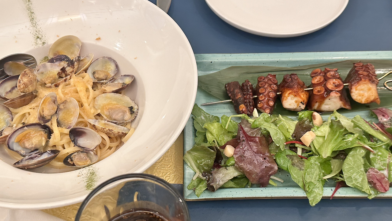 다음으로 향한 곳은 30분 거리에 있는 파스타집이다. 해산물을 먹고 싶다고 하셔서 가려고 한 리스트 중 해산물 집 하나를 골랐다. 가서 뽈뽀와 봉골레를 주문했다. 가는 내내, 그리고 점심을 먹으며 대화를 하는데 겹치는 부분도 많고 생각도 취향도 비슷해서 대화가 즐거웠다. 와인을 마실까 하다가 알코올까지 들어가면 이대로 잠에 들 것 같아 콜라를 주문했다. 그렇게 나온 메뉴들을 먹어봤다. 봉골레는 신기한 맛이었다. 한국에서 먹어보지 못하는 맛이다. 이탈리아의 파스타는 간이 세다는데, 여기는 굉장히 삼삼했다. 간을 덜 하셨나 싶을 정도였지만 삼삼해서 재료 본연의 맛이 더 잘 느껴지는 것 같았다. 해산물 맛도 진했다. 뽈뽀는 놀라웠다. 내가 살면서 먹어본 문어는 쫄깃했는데, 이 문어는 굉장히 부드러웠다. 소스도 문어와 어울리는 동시에 문어의 맛을 더 돋보이게 만들었다. 그렇게 충격적인 문어도 먹고 카페로 향했다.