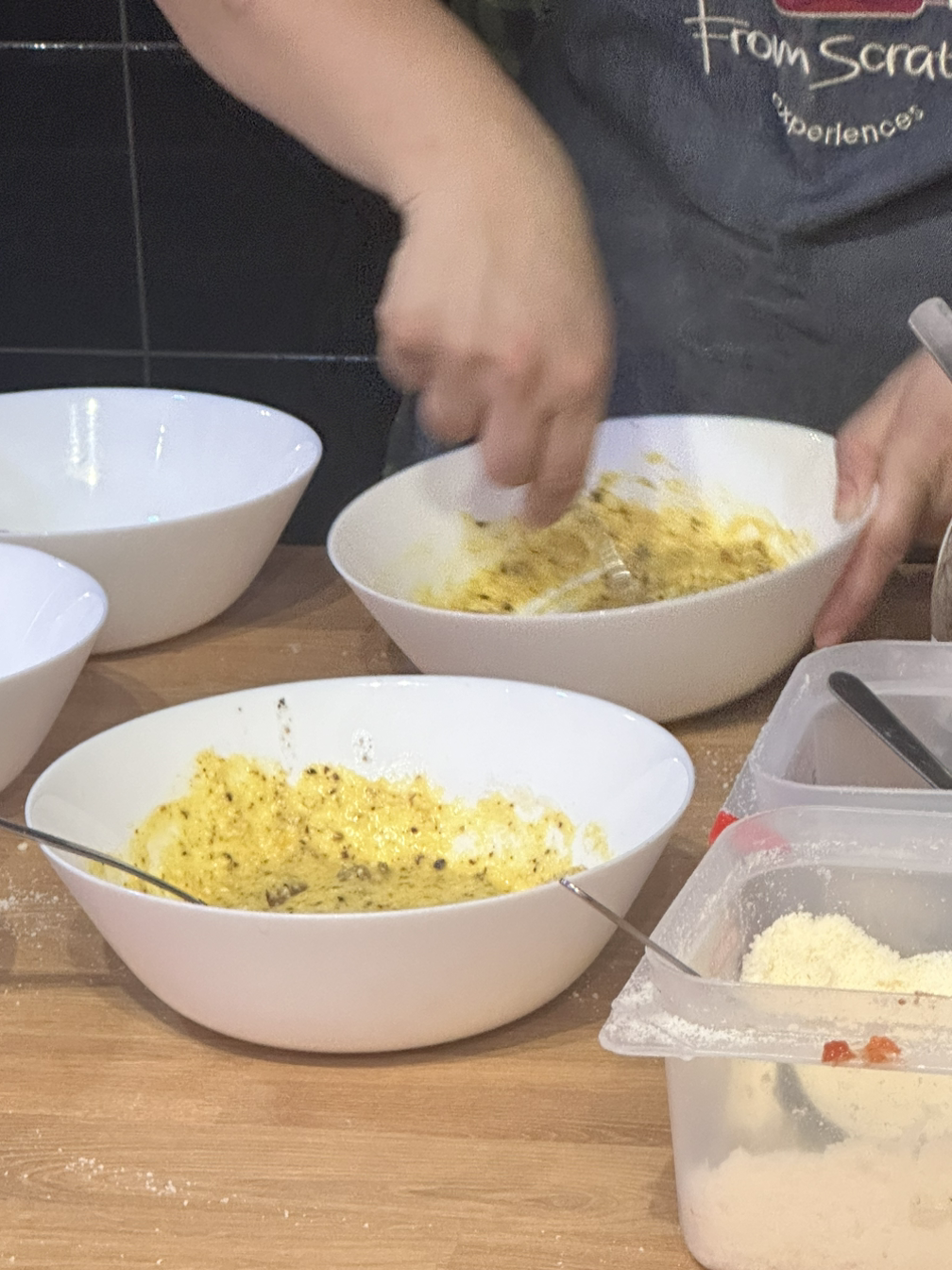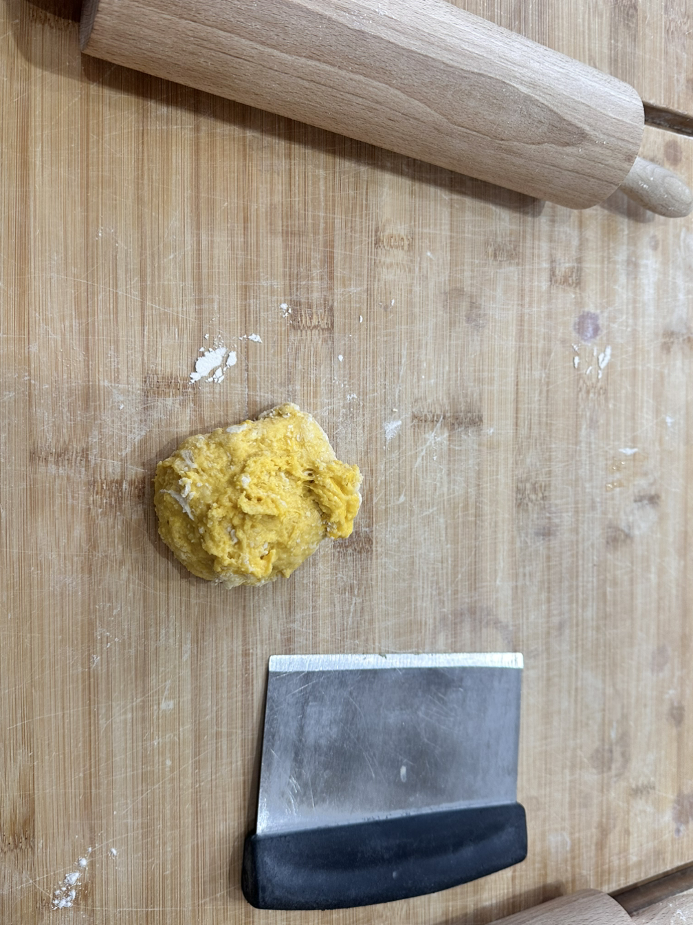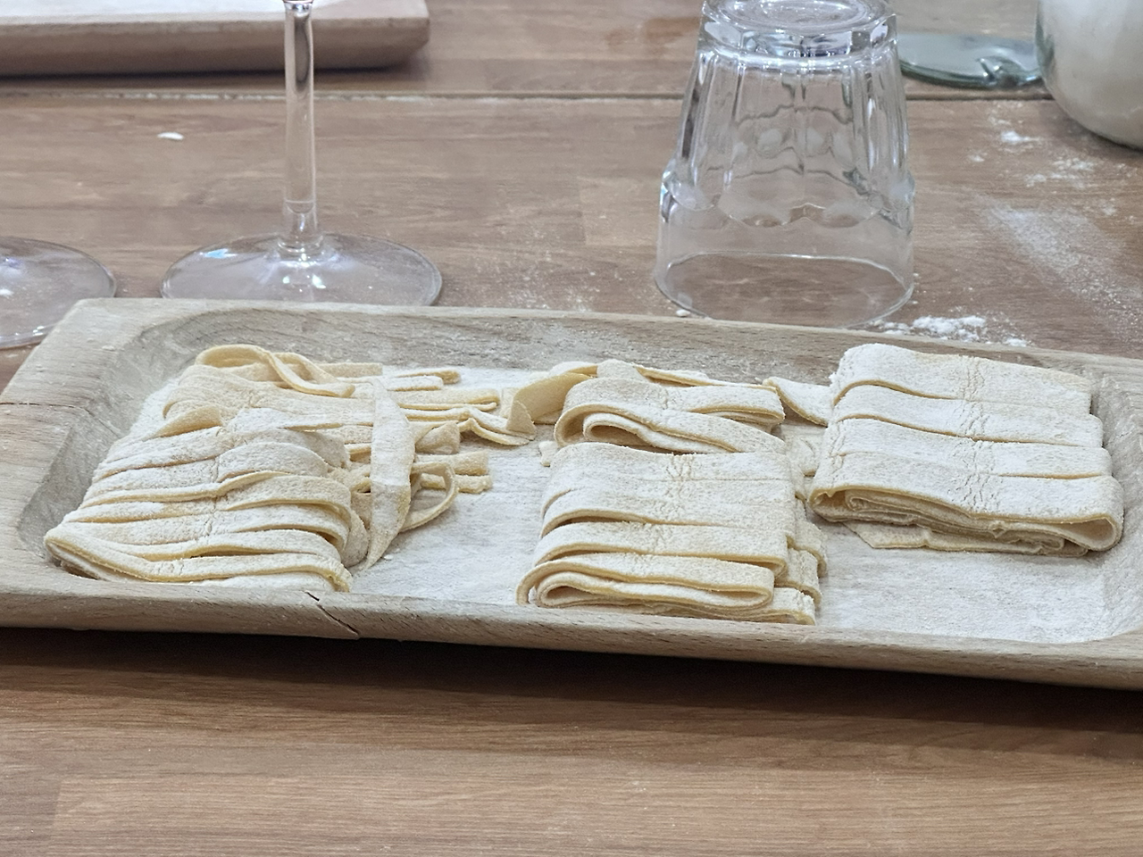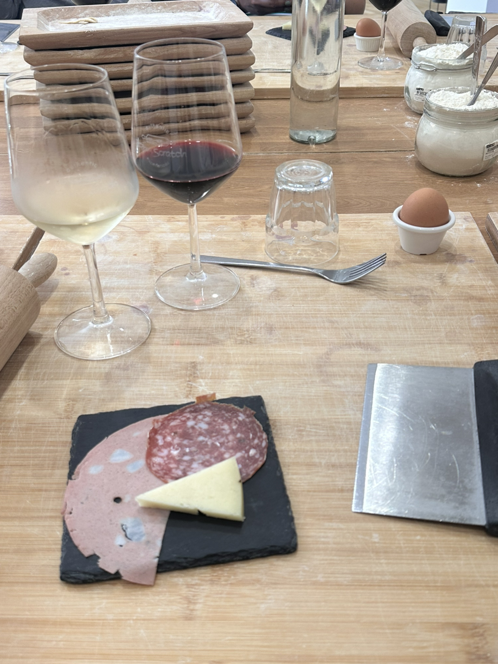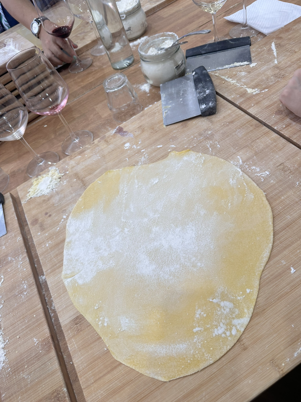 와인을 마시고는 본격적인 파스타 만들기가 시작되었다. 밀가루와 계란을 넣고 만들기 시작했다. 물이나 다른 재료 없이 밀가루와 계란만으로 면을 만드는 게 신기했다. 처음에는 볼에 넣어서 하나의 덩어리로 만들고, 그다음에는 덩어리가 된 반죽을 테이블 위에 올려놓는다. 덩어리를 몸 쪽으로 반 접고, 손바닥을 이용해 몸 바깥쪽으로 쭉 밀고 90도 돌리는 동작을 반복했다. 옆에 파스타를 만들어보신 분이 계셔서 많이 알려주셨다. 손바닥으로 누를 때 세게 눌러야 된다고 하셨다. 손에 반죽이 붙으면 중간중간 밀가루도 더 추가하며 반죽을 완성했다. 반죽이 완성되었는지를 알아보기 위해서는 반죽을 뭉쳐 손가락으로 눌러보면 된다고 한다. 가라앉은 채로 있어도, 높이 올라와도 안되고 중간 정도까지 올라와서 멈춰야 반죽의 완성이라고 한다. 완성된 반죽을 밀대로 얇게 밀고, 반죽끼리 붙지 않도록 밀가루를 앞뒤로 뿌리면 된다고 한다.